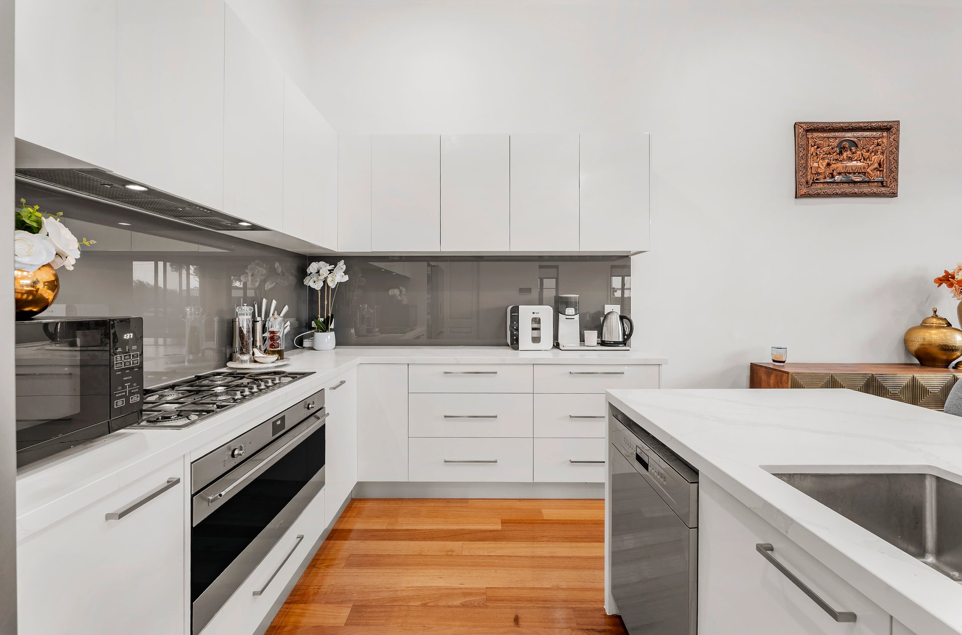A striking open-plan kitchen, dining, and living area forms the social heart of the home, enhanced by stone benchtops, quality appliances, and a large island breakfast bar. Expansive sliding doors open to a covered alfresco deck with built-in BBQ, creating a perfect setting for entertaining year-round.