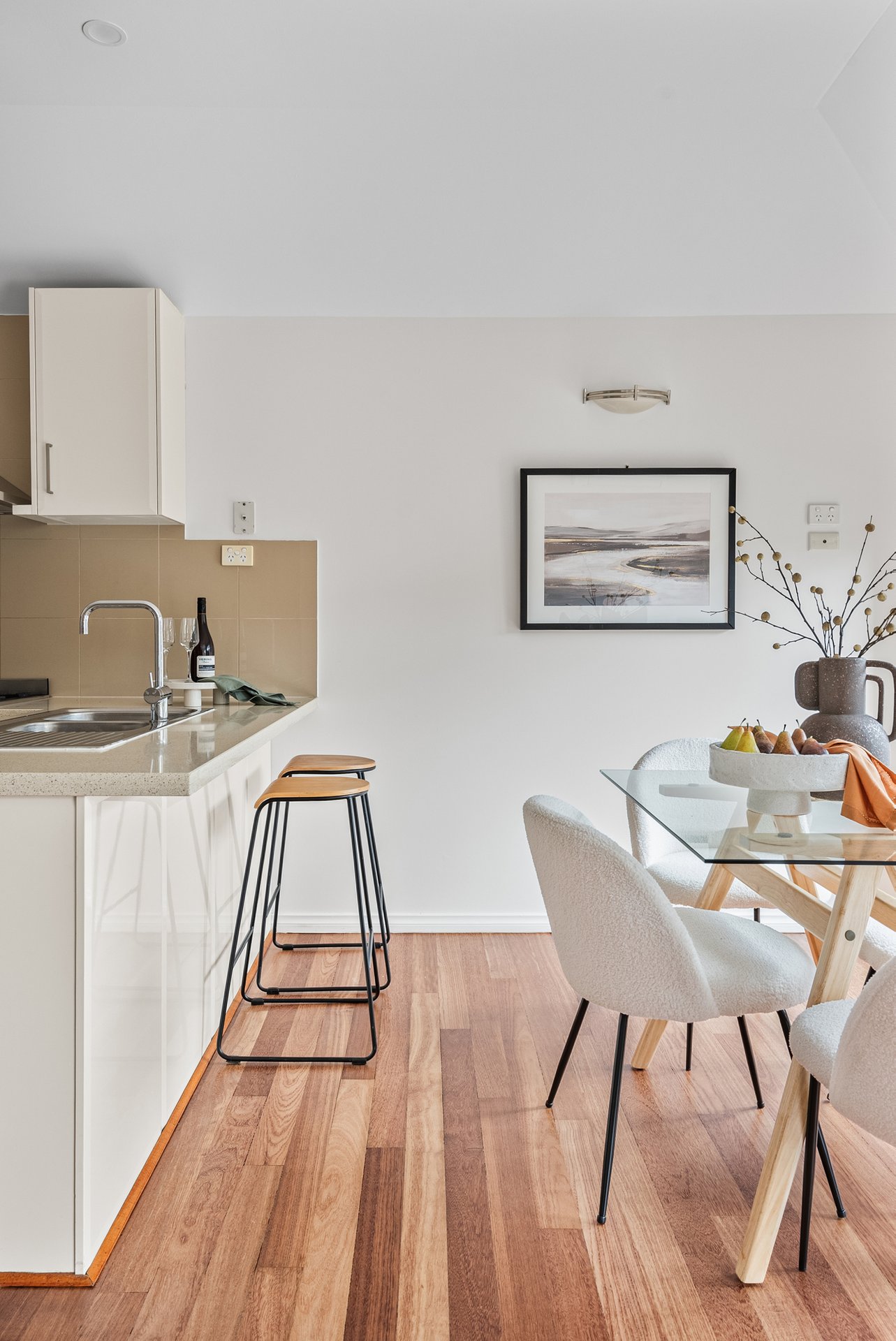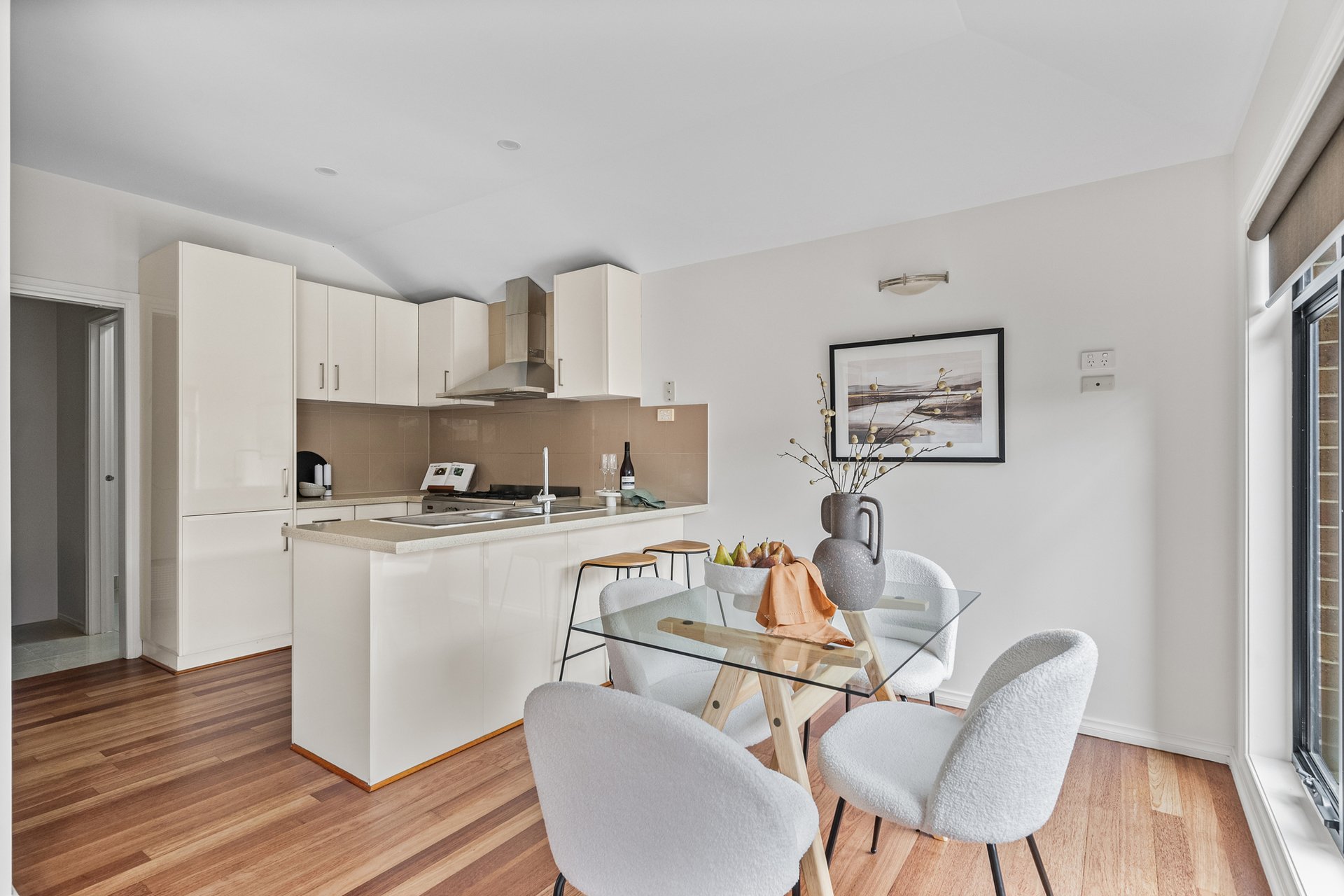 The expansive open plan living and dining area enjoys a prized north facing aspect, filling the space with natural light throughout the day. The modern stone topped kitchen includes quality appliances and excellent storage, while sliding doors open to a private paved courtyard perfect for entertaining with direct access to remote lock up garage.