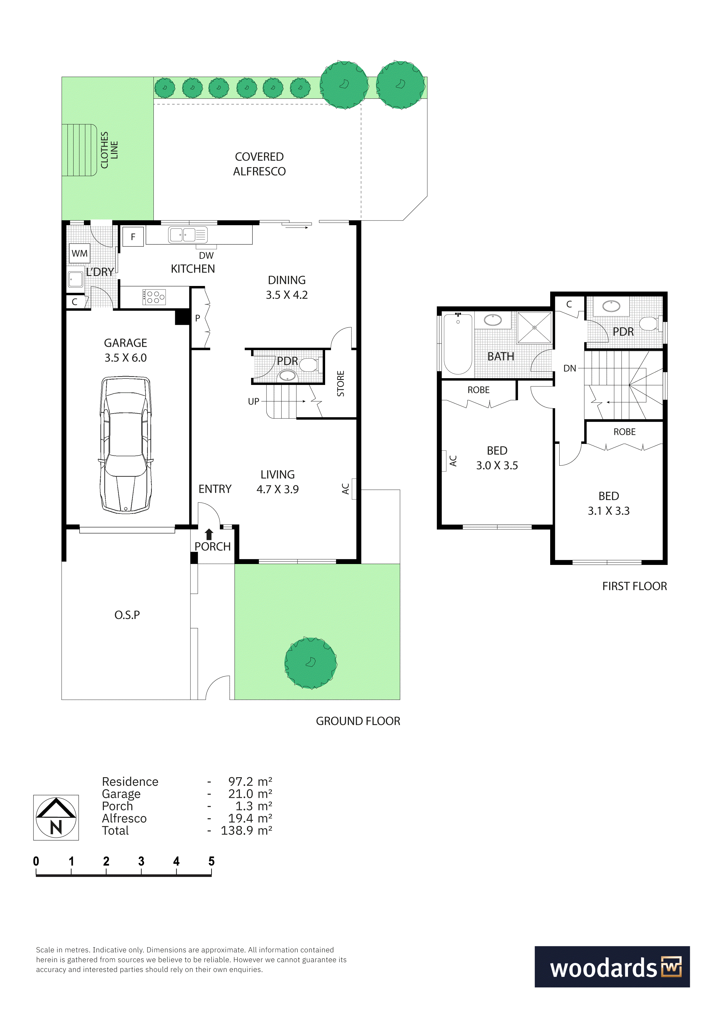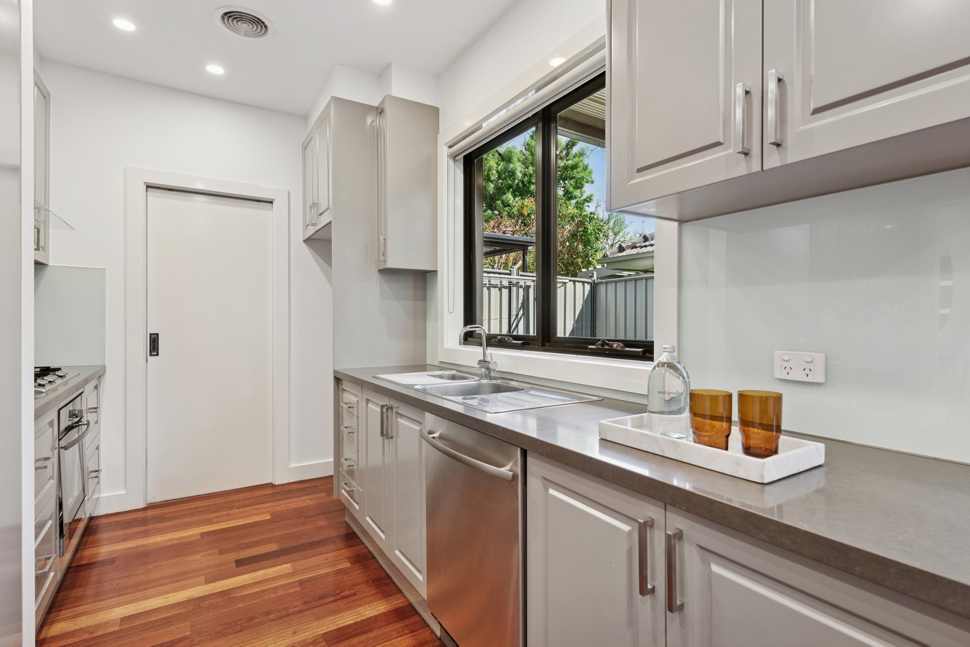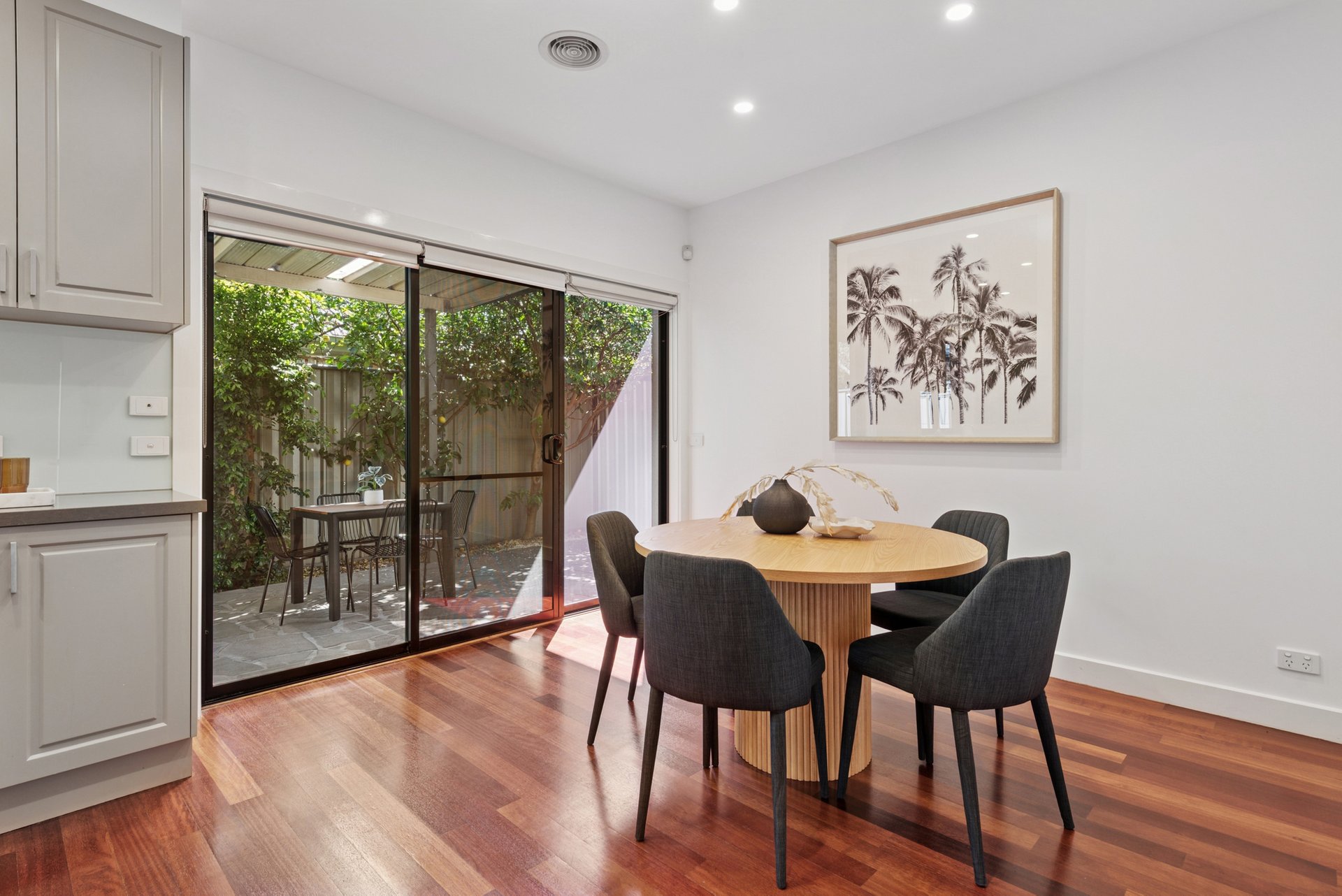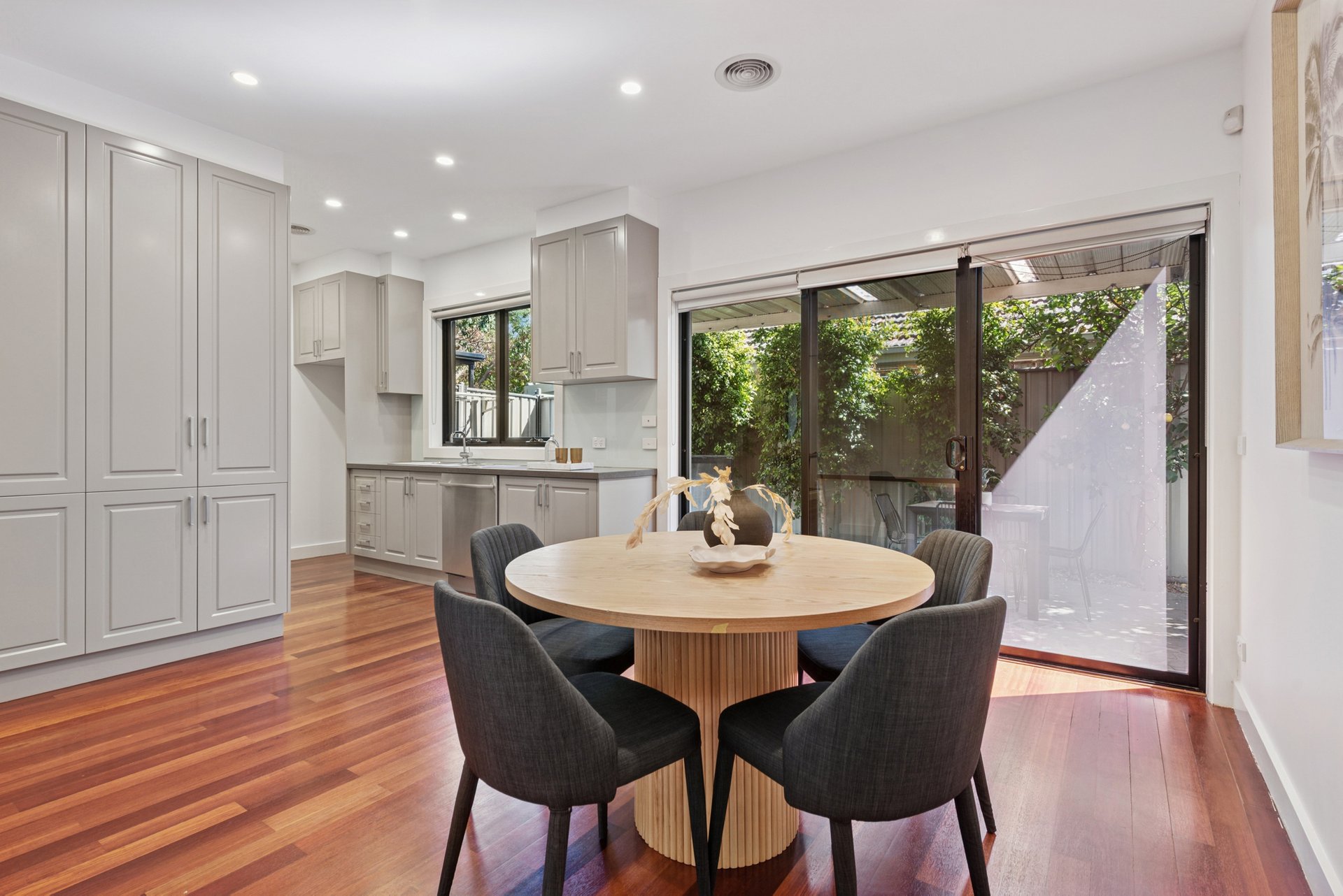 The living and dining zones work in perfect harmony, with the timber floors adding depth and warmth. The kitchen hits every note, finished with stone benchtops, a five-burner gas cooktop, under-bench oven and dishwasher. Through glass doors, the covered patio becomes your second living room, a spot for coffee, conversation or lingering over dinner on summer nights. There’s also a separate laundry next to the kitchen, a guest powder room, and a garage with internal access so you can come straight in from the rain.