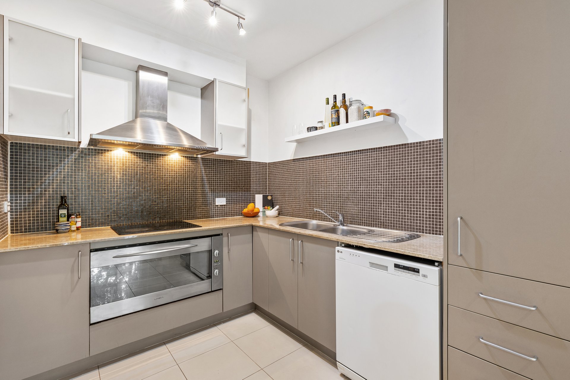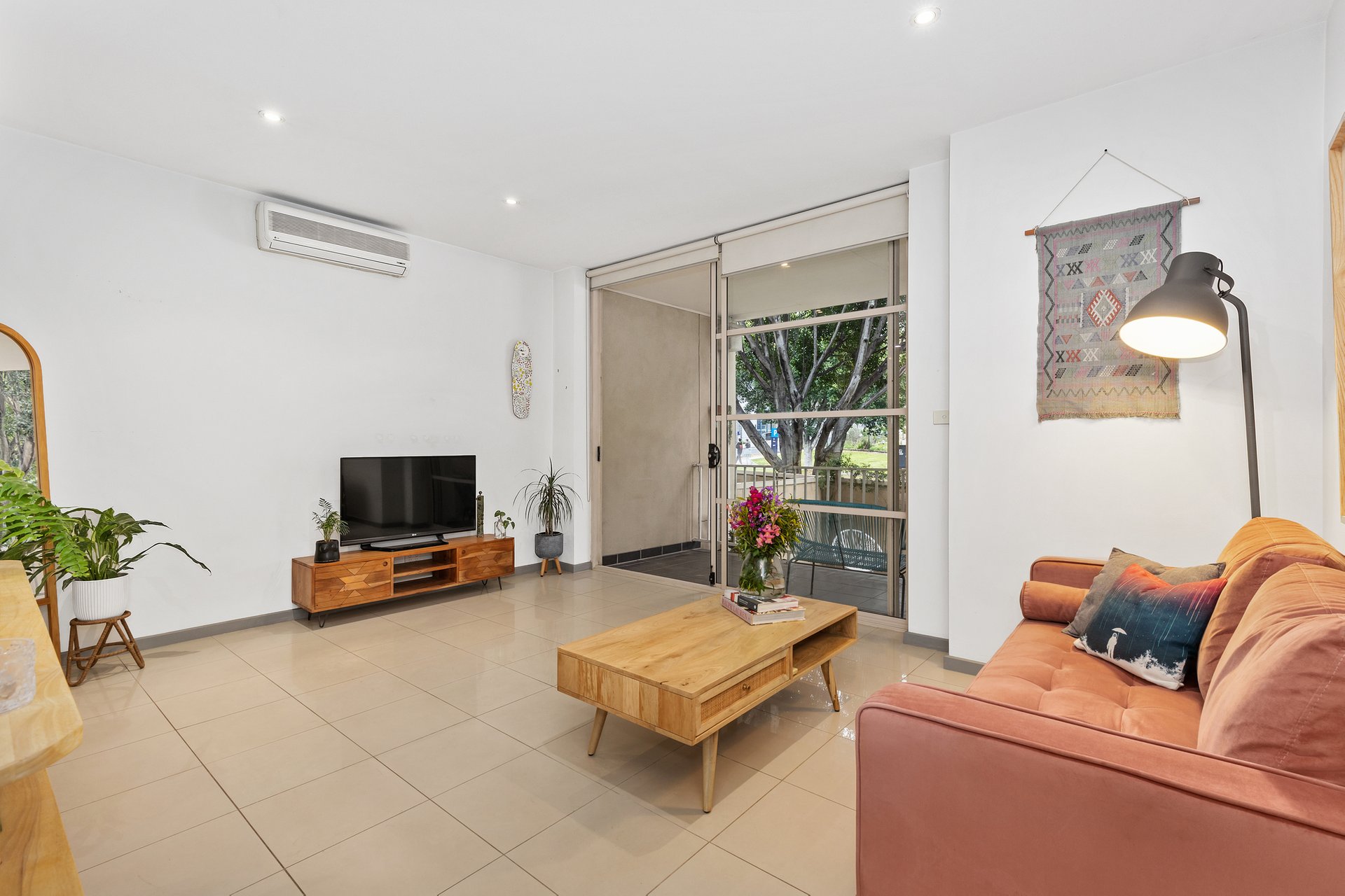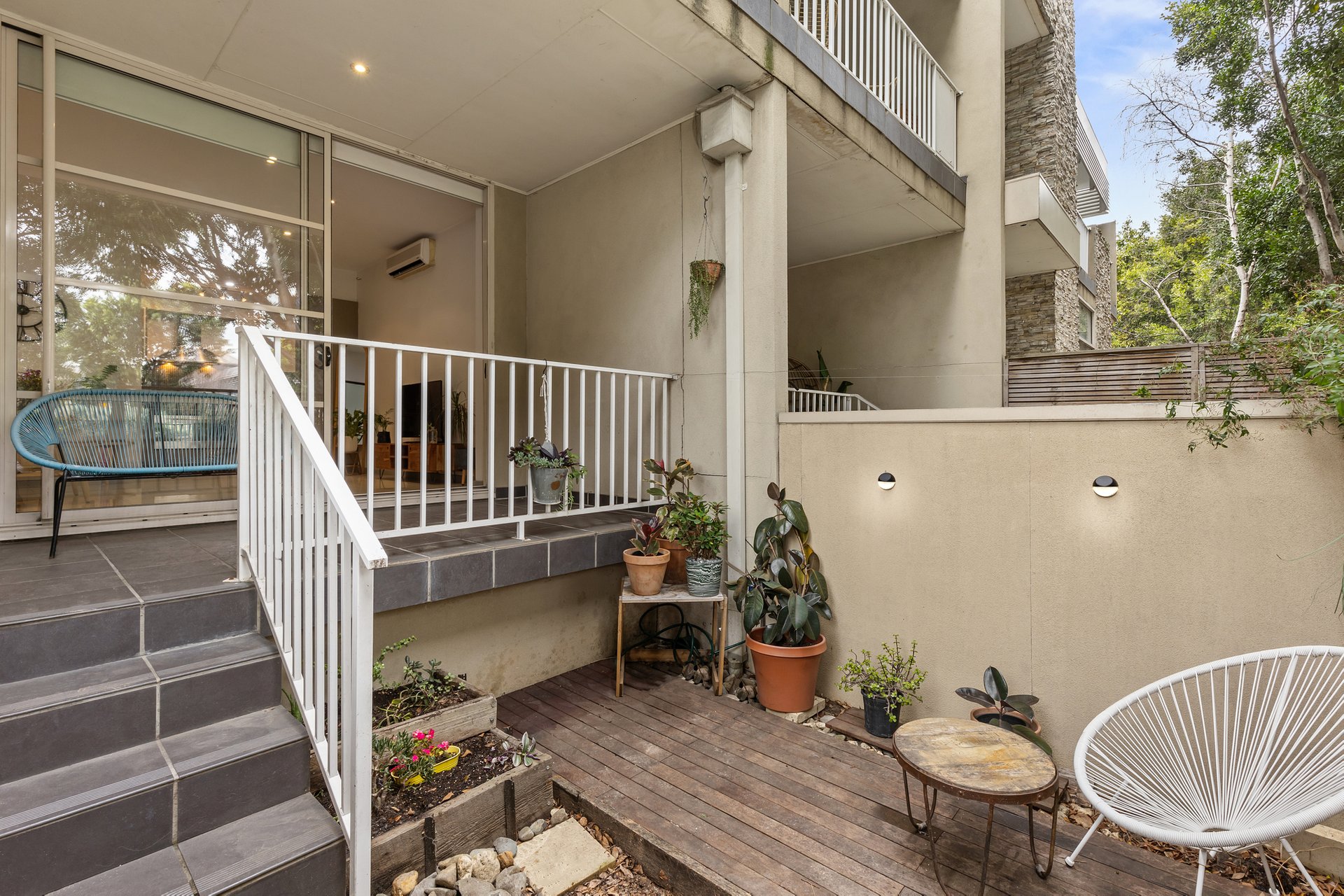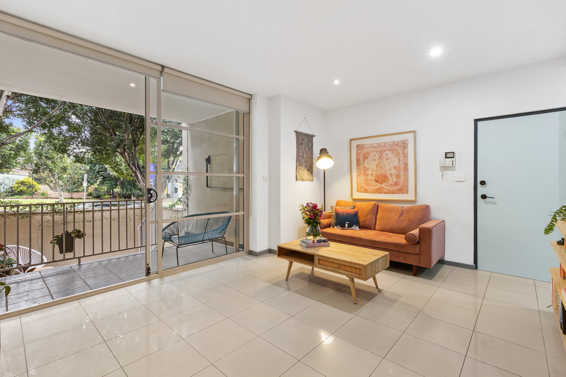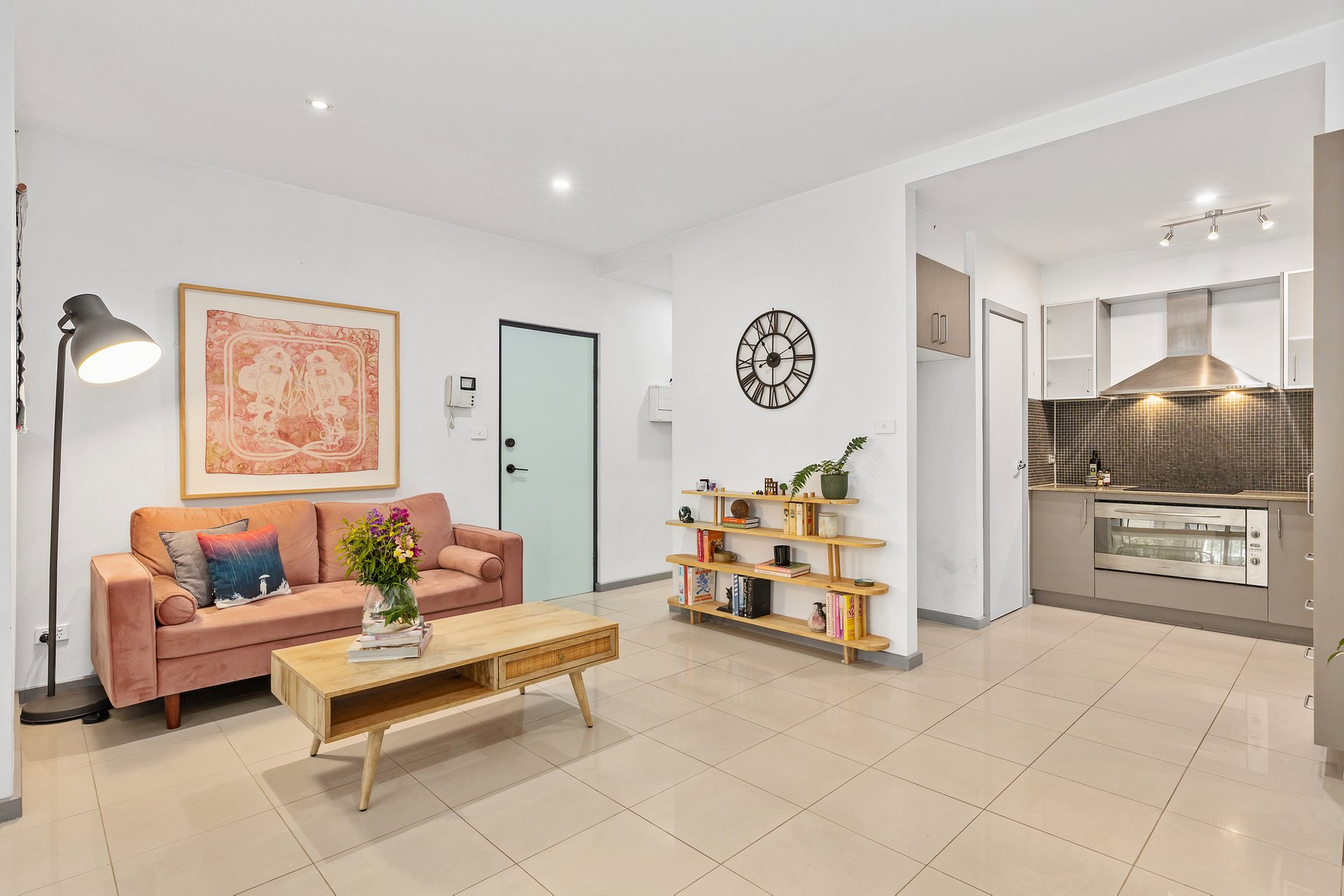 The apartment features an open-plan living and dining area, flooded with natural light through floor-to-ceiling windows, creating a bright and inviting environment. From here, step out to a fully enclosed private courtyard and garden, perfect for entertaining guests or enjoying a quiet moment outdoors. The contemporary kitchen is appointed with stone benchtops and ample storage, combining elegance with practical functionality.
