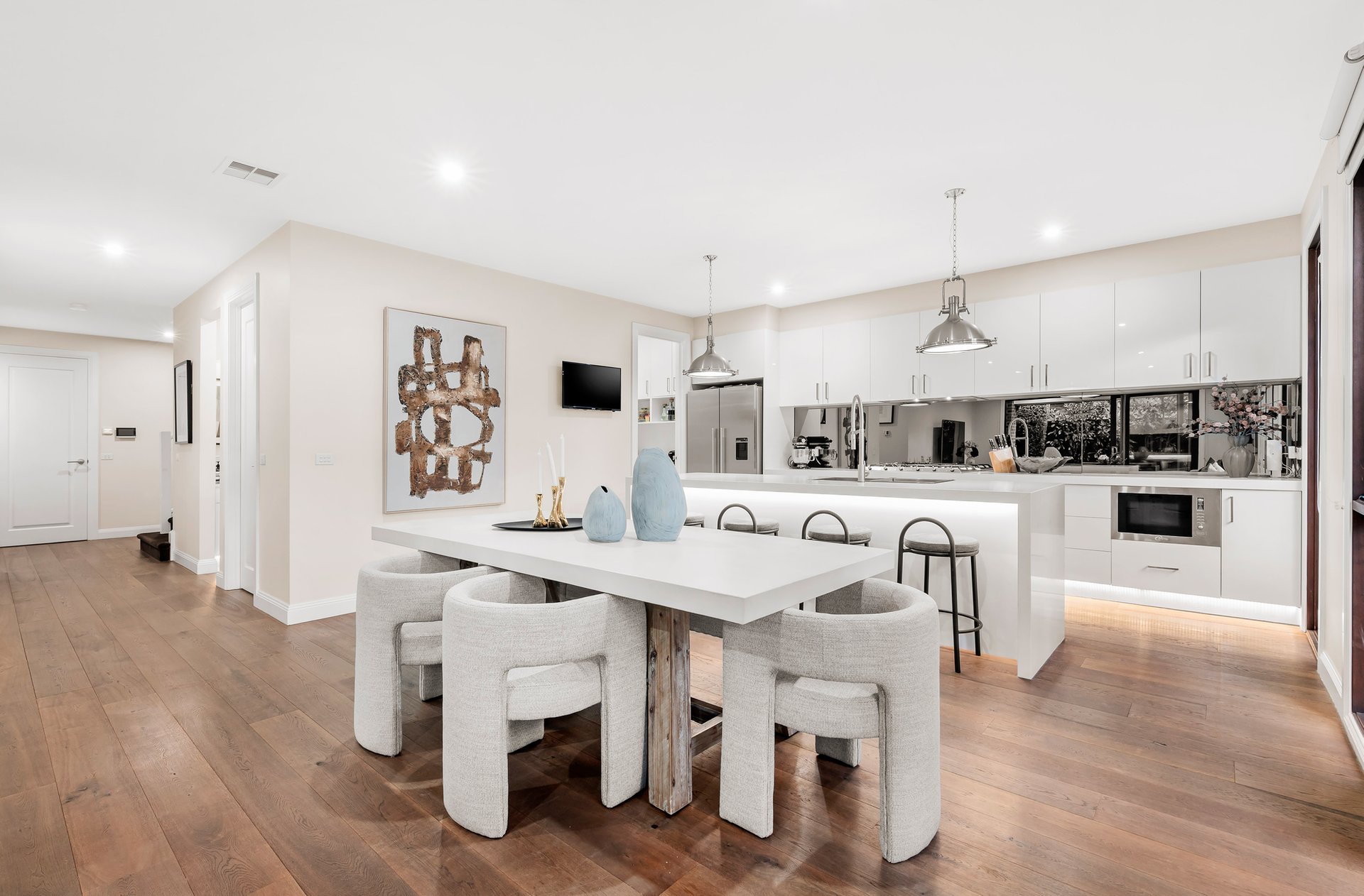 The heart of the home is the expansive open plan living, dining and kitchen area, where natural light pours in and every detail has been considered. The gourmet kitchen is a standout, boasting a large island bench ideal for meals and entertaining, premium SMEG appliances, a walk-in pantry, and sleek cabinetry offering ample storage.