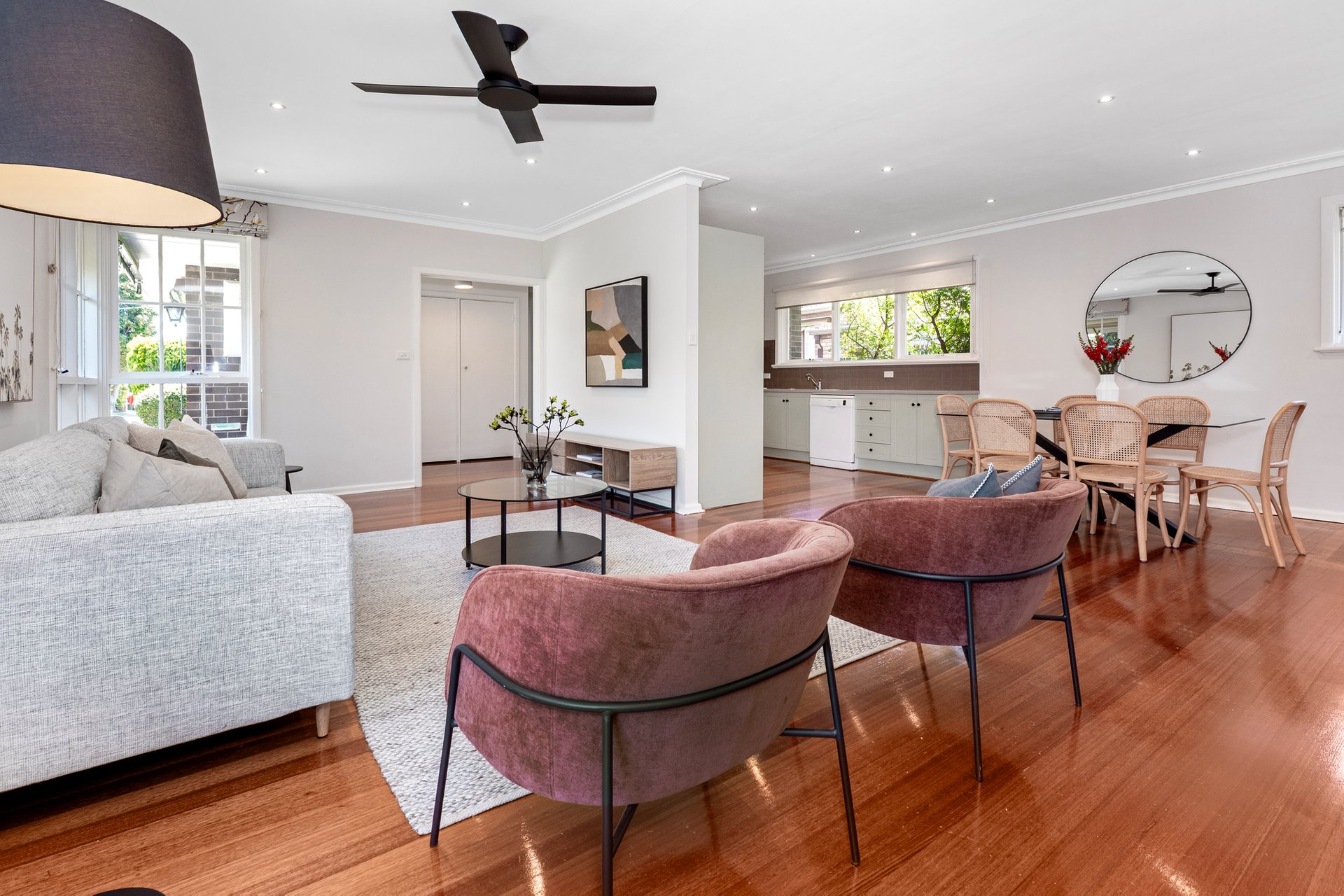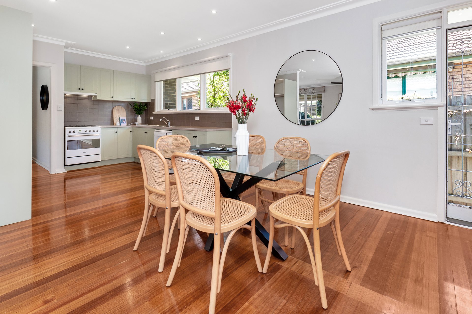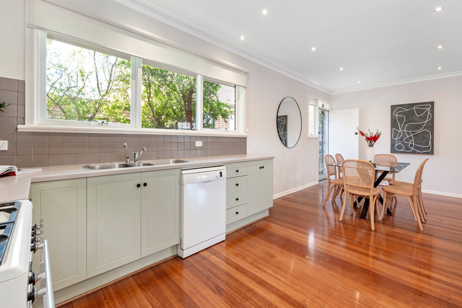 Opening to reveal the warmth of hardwood flooring and lofty ceilings, the distinct entrance hall gives way to a supersized living and dining zone that flows freely to offer space galore for relaxation or to gather with family and friends. Desirably open plan, the kitchen has been finished in a calming soft green and appointed with a chic white Smeg oven and a Bosch dishwasher, whilst outdoors is an easy-care space to enjoy the fresh air.