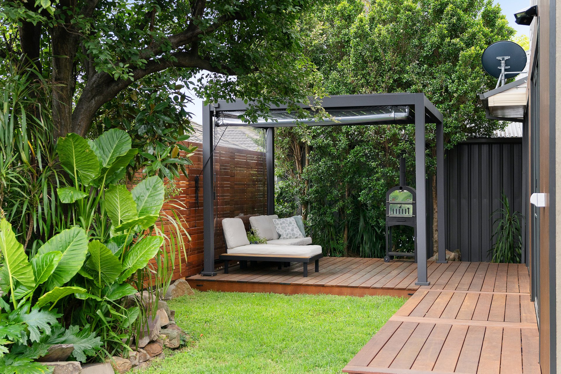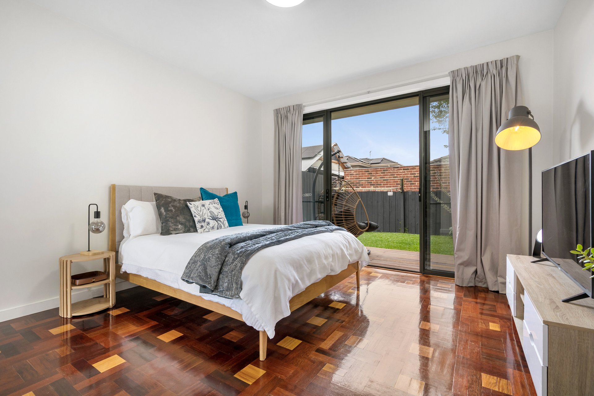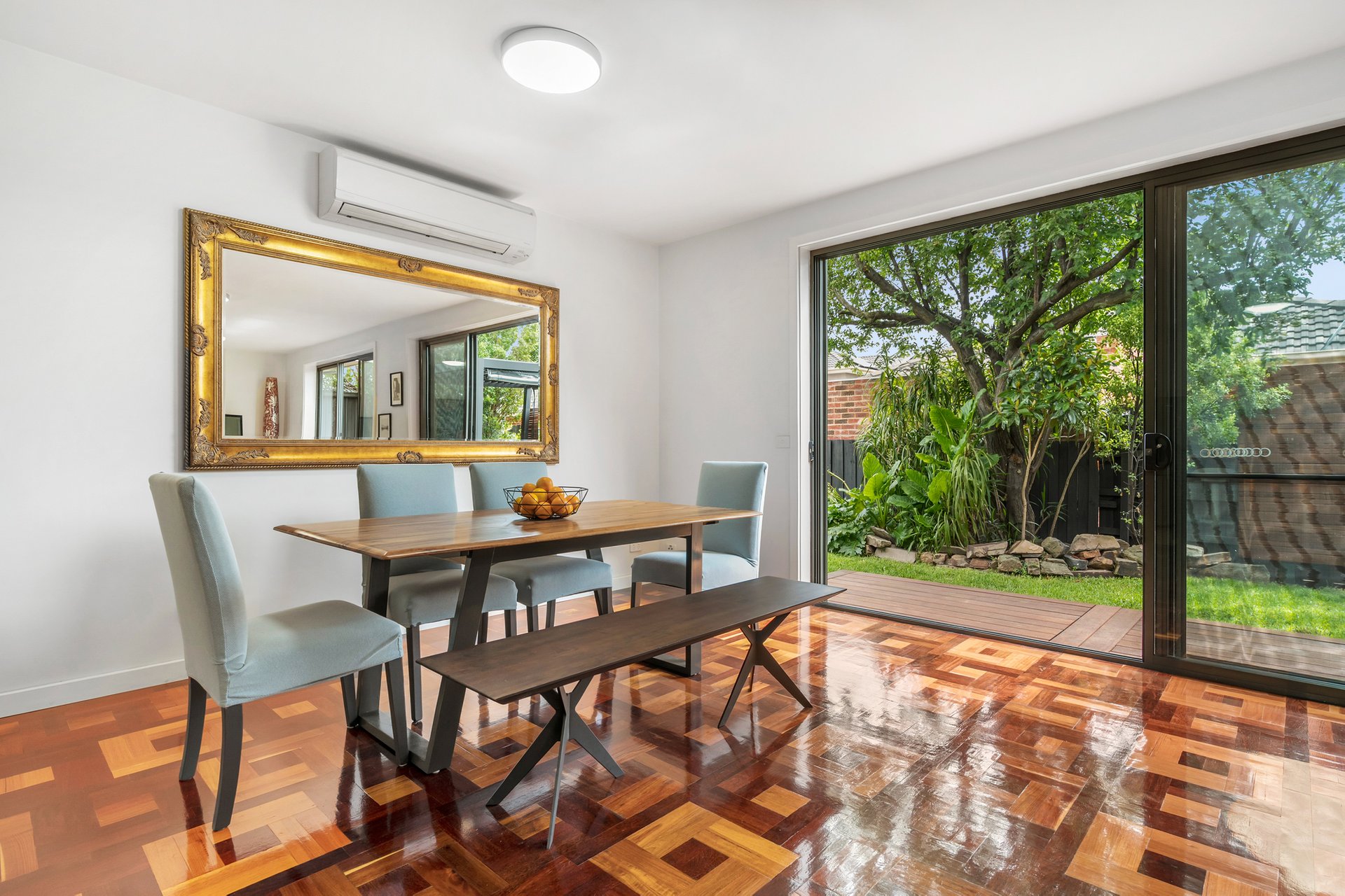 The home opens to a generous open-plan living, kitchen, and dining area, beautifully finished with hardwood parquetry flooring and flooded with natural light. Sliding doors create a seamless indoor–outdoor connection, opening onto a decked, undercover alfresco area that overlooks a large wrap-around backyard, making it ideal for relaxed living and effortless entertaining.