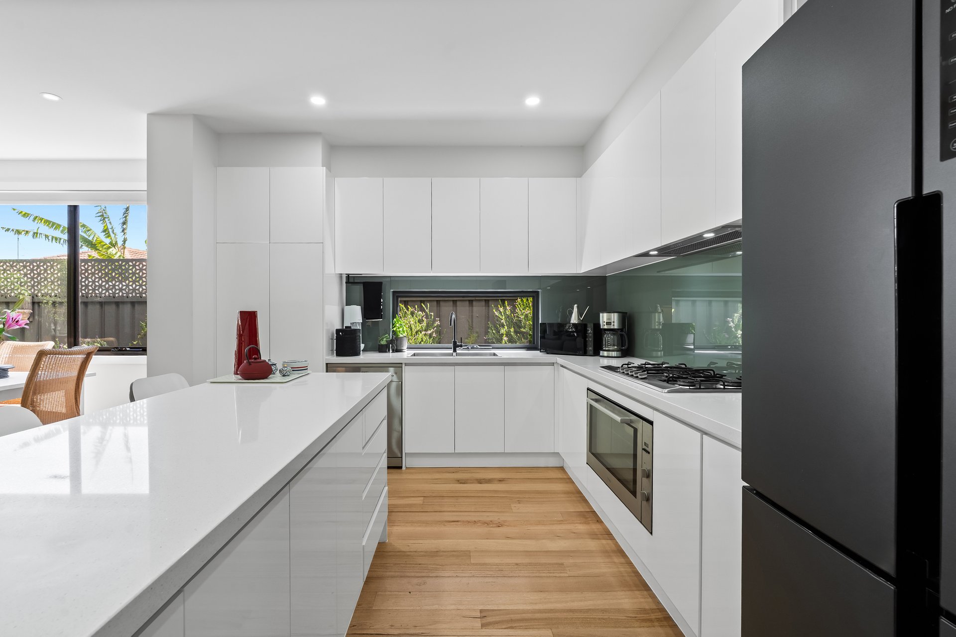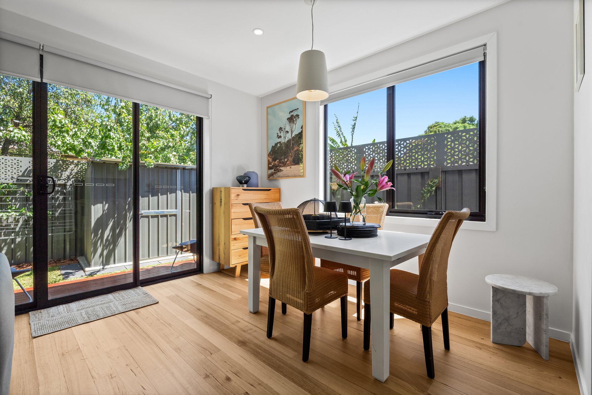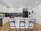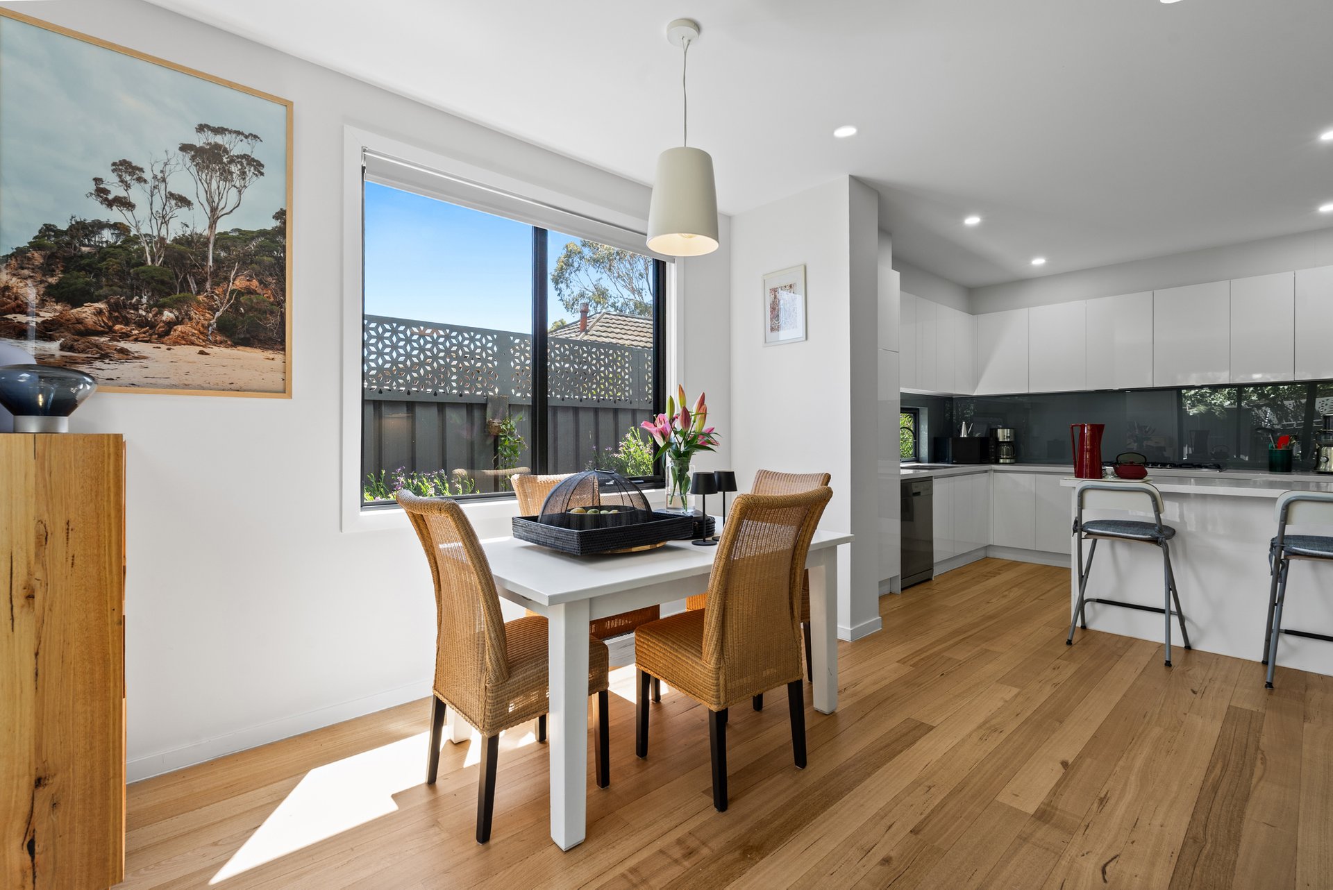 The ground floor is centered around a light-filled open-plan living and dining zone, with a generously sized kitchen at the heart of the home. A thoughtfully designed stone breakfast bar, gas cooktop, and double oven, offer both style and functionality for daily living and entertaining. The main living space flows effortlessly to a low-maintenance backyard complete with a small deck and shed. A ground-floor powder room and full-size laundry add everyday practicality.