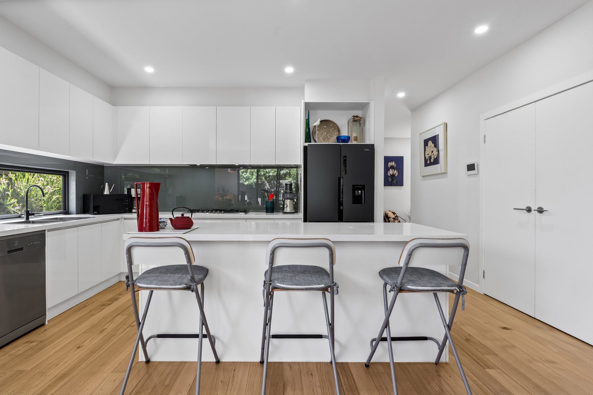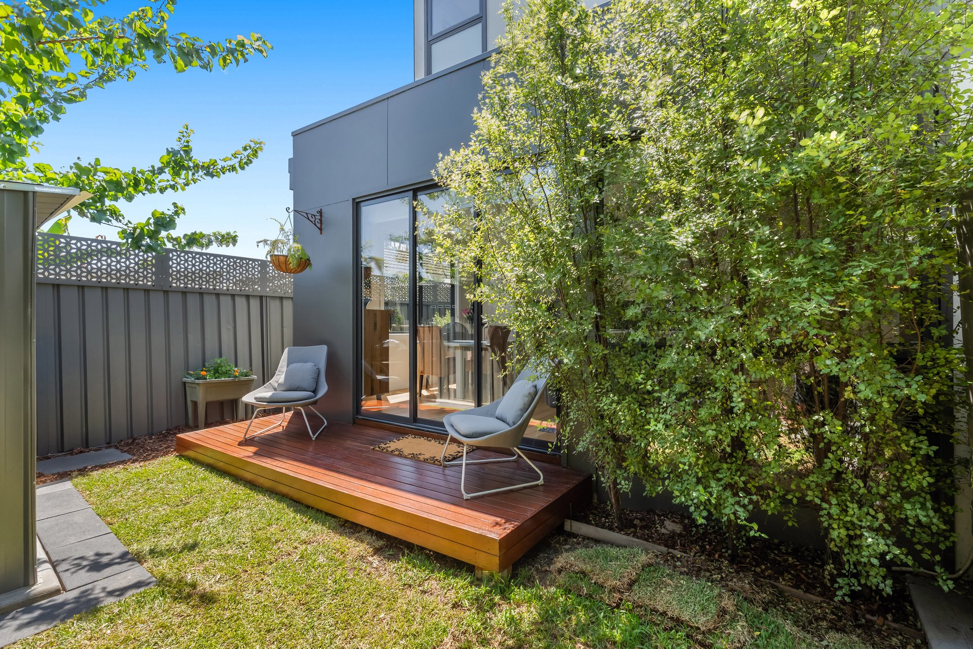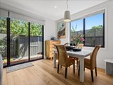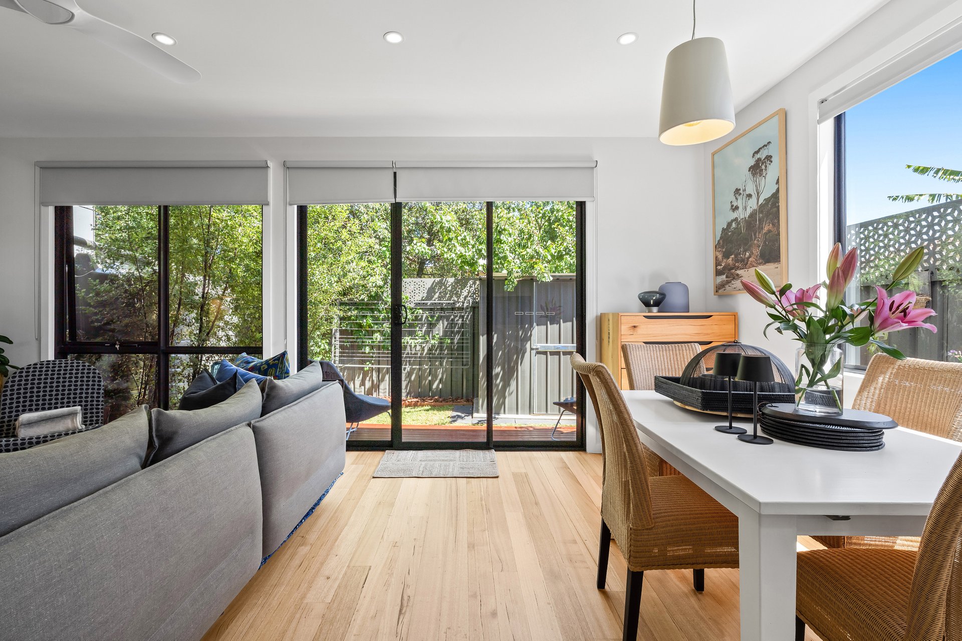 The ground floor is centered around a light-filled open-plan living and dining zone, with a generously sized kitchen at the heart of the home. A thoughtfully designed stone breakfast bar, gas cooktop, and double oven, offer both style and functionality for daily living and entertaining. The main living space flows effortlessly to a low-maintenance backyard complete with a small deck and shed. A ground-floor powder room and full-size laundry add everyday practicality.