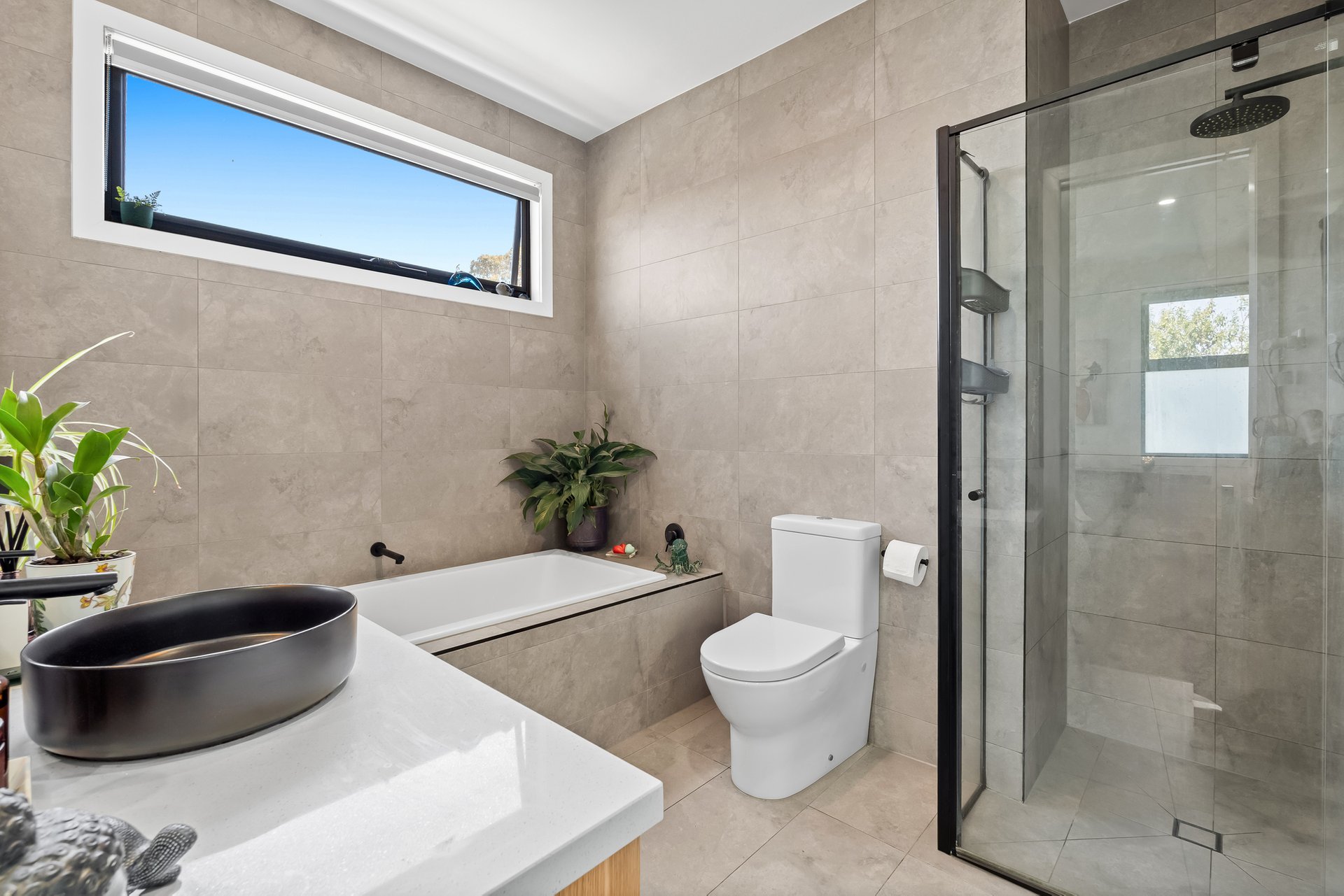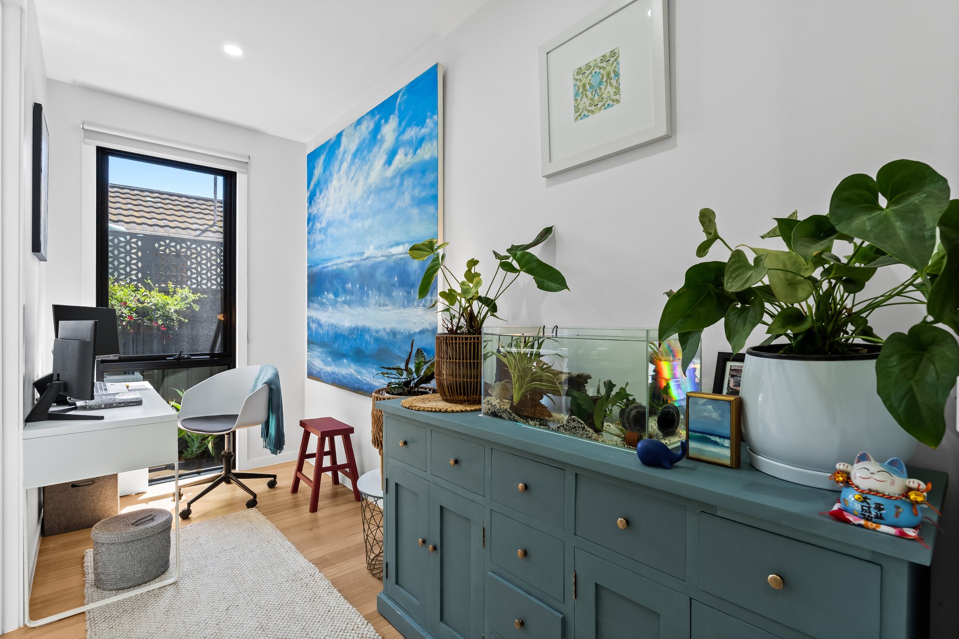 Upstairs, two generously sized bedrooms are serviced by a central bathroom featuring both a bathtub and shower. The master bedroom includes walk in robe and separate linen cupboard with clever bathroom / ensuite access. A landing area at the top of the stairs provides a cosy retreat space, perfect for reading / study or relaxation. Climate comfort is provided by ceiling fans and both upstairs/downstairs split systems.
