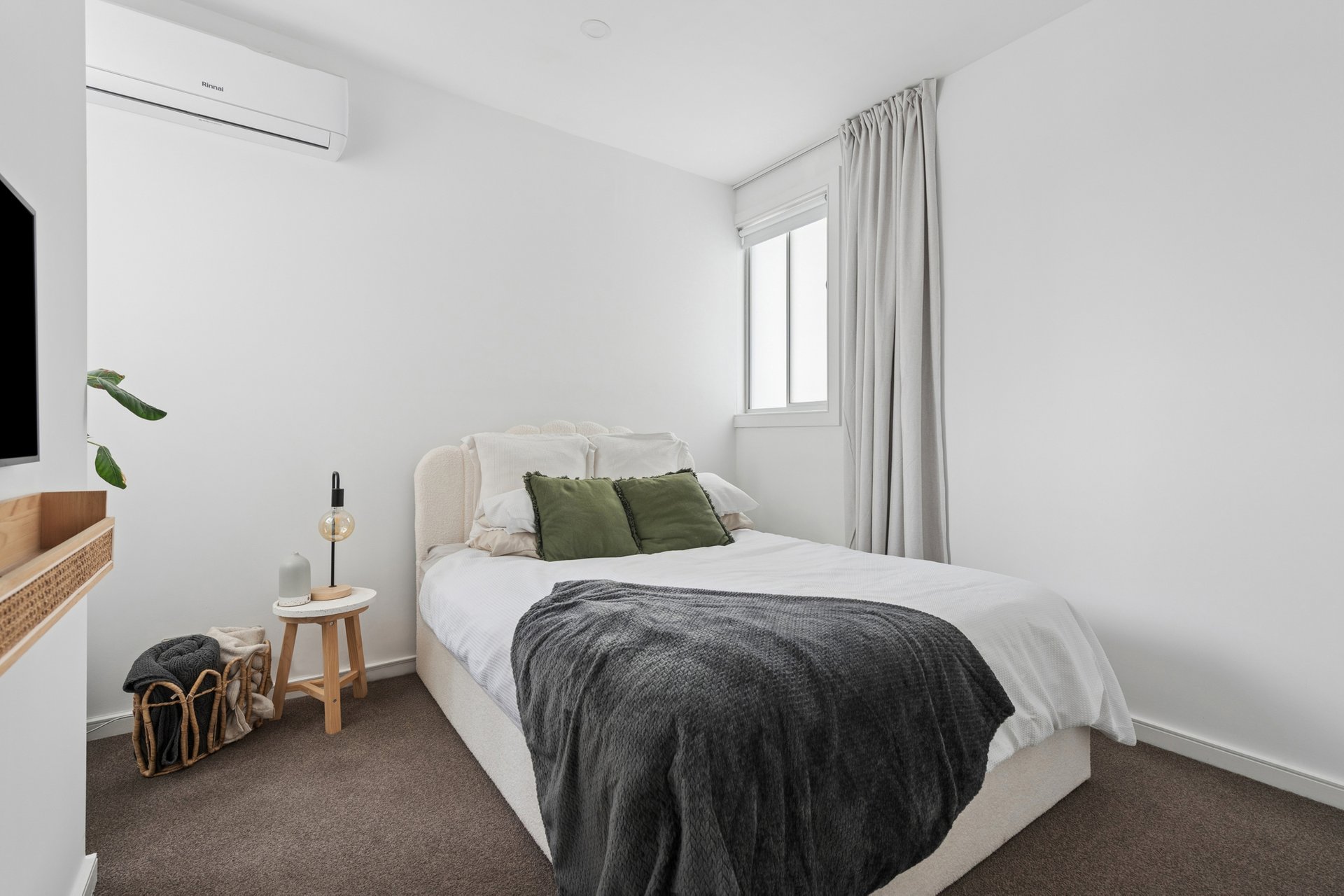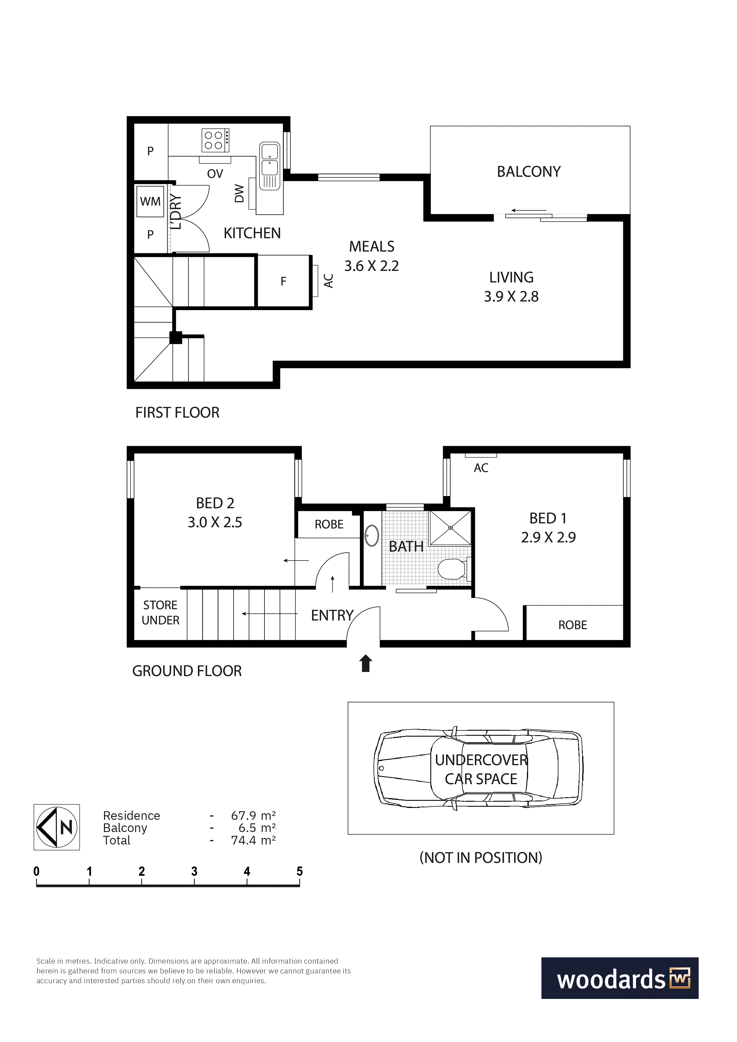 The layout is spread across two levels. Both bedrooms occupy the ground floor, positioned on either side of a bathroom with shower and toilet, each with built-in robes and a quiet sense of separation from the living spaces above. Upstairs, the living and dining room benefits from the elevation, drawing in natural light generously and stepping out to a private balcony. Stone benchtops, an electric cooktop, oven and dishwasher make up a well-appointed kitchen, with a Euro laundry and pantry tucked neatly within. Two split-system air conditioners and a car space via the rear laneway complete the package.