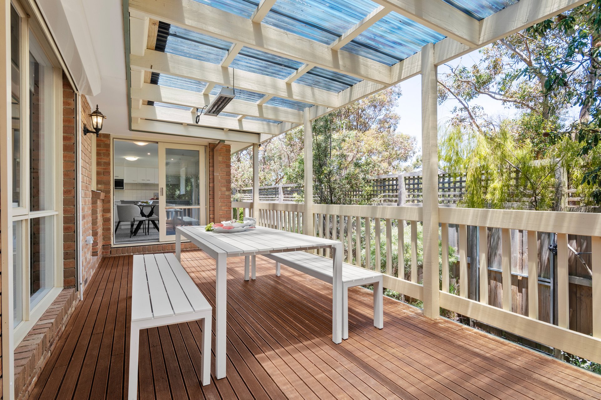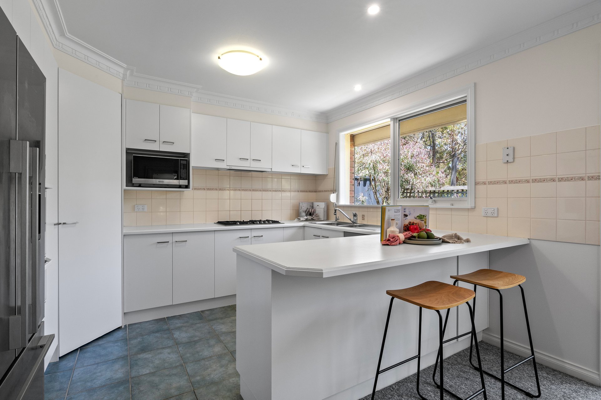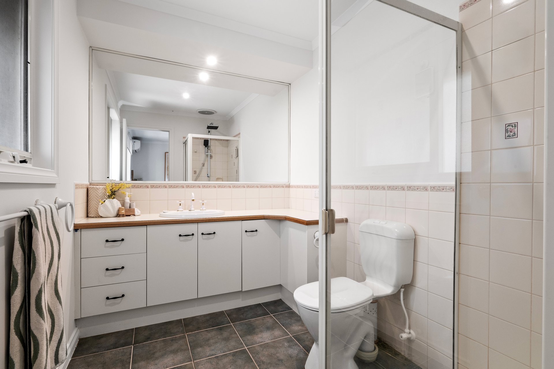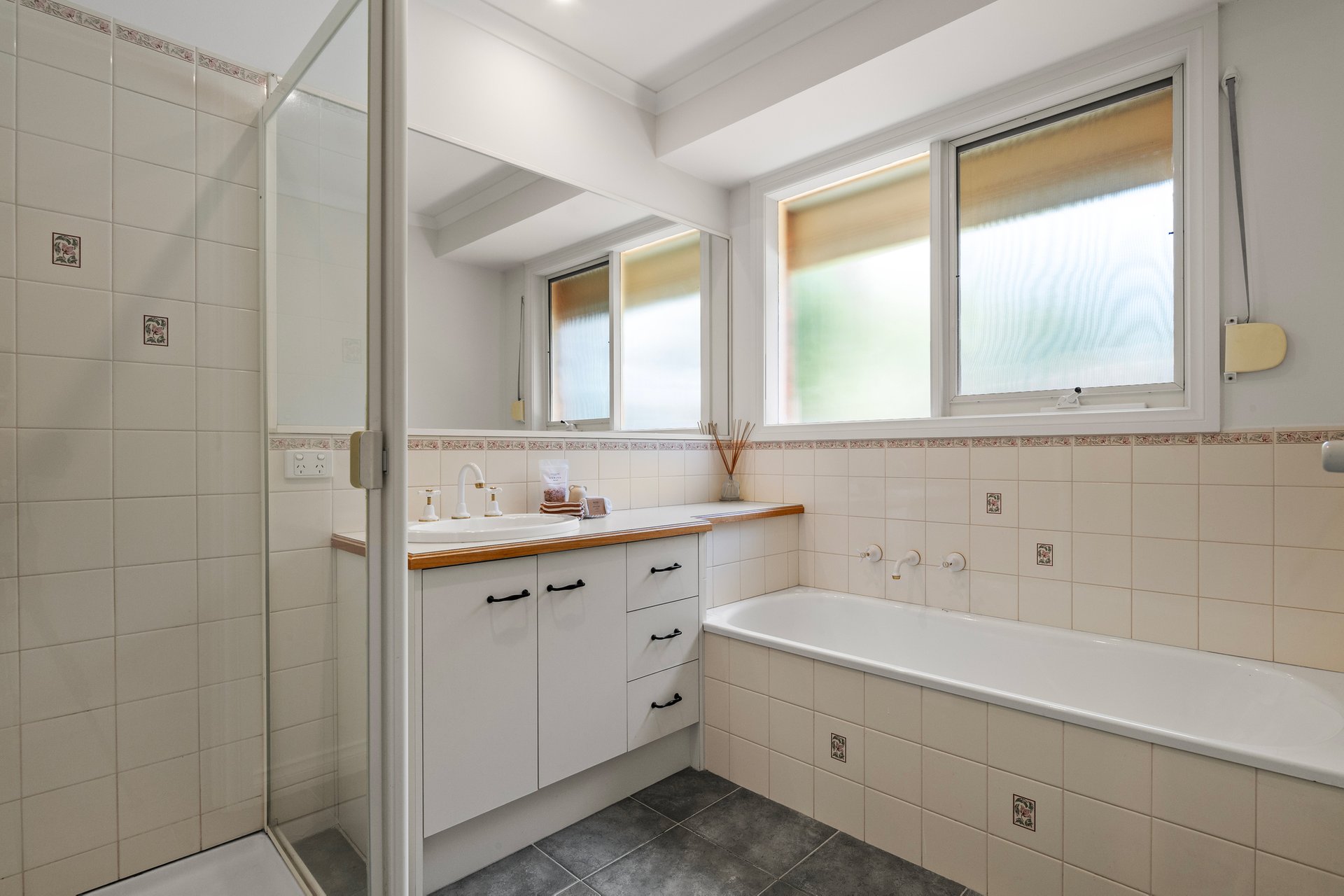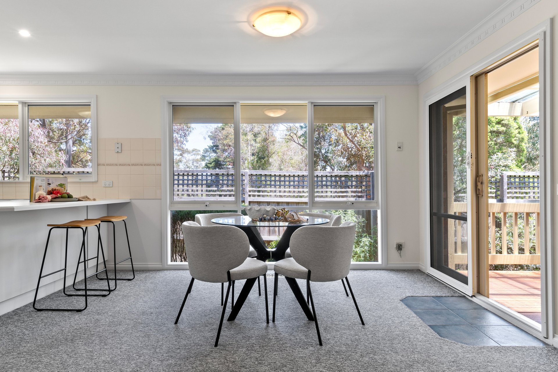 Double gates open to the home’s private driveway, offering effortless access to a remote double garage. Beyond a leadlight-adorned entrance, are two bright living zones for unwinding and gathering, including a spacious lounge and dining room, and a family-meals area overseen by a fully equipped kitchen. From here, you can step out onto a covered deck, where treed scenery and the soothing sounds of birdlife create a serene ambience for entertaining. Three generously proportioned bedrooms with built-in wardrobes provide a restful sleeping environment, with the king-sized master boasting a walk-in wardrobe and ensuite, and another bedroom featuring wall shelving and drawers. A communal bathroom with a shower, bathtub and vanity, along with a separate toilet and a laundry with a pet flap, complete the home’s floorplan.