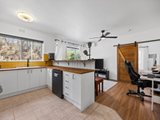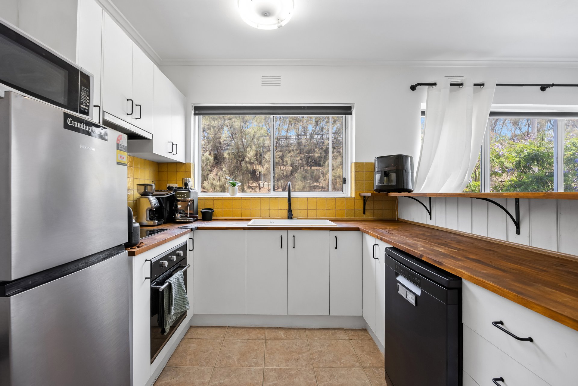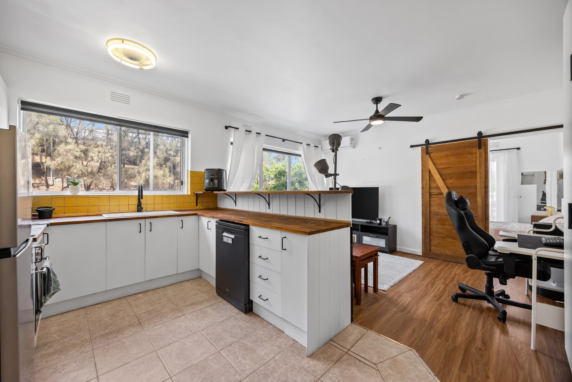 The bright open-plan living and dining area features floorboards, split-system heating/cooling and ceiling fans, flowing into an updated kitchen with induction cooktop, electric oven, dishwasher, timber benchtops and ample storage.