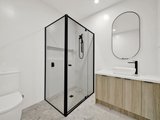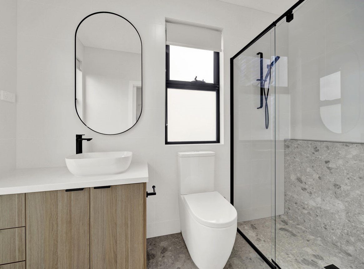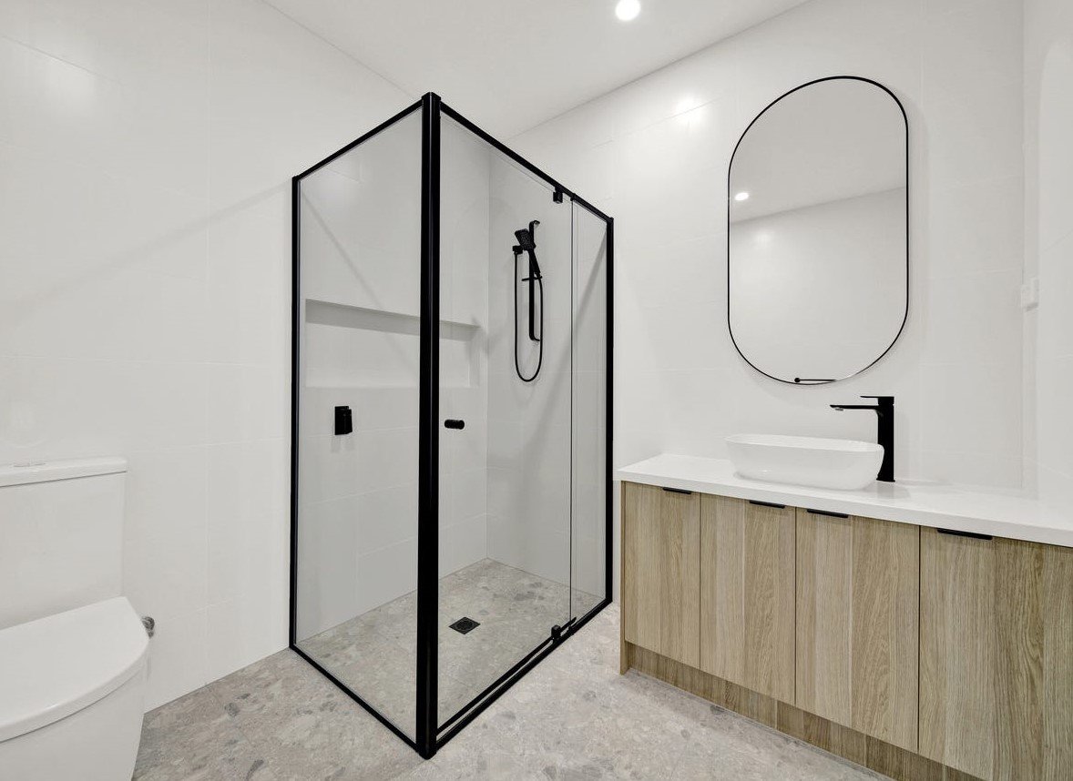 Both bathrooms showcase contemporary black-framed showers, stone-top vanities and timber cabinetry, bringing a consistent sense of quality throughout the home. The overall feel is calm, modern and incredibly easy to maintain.