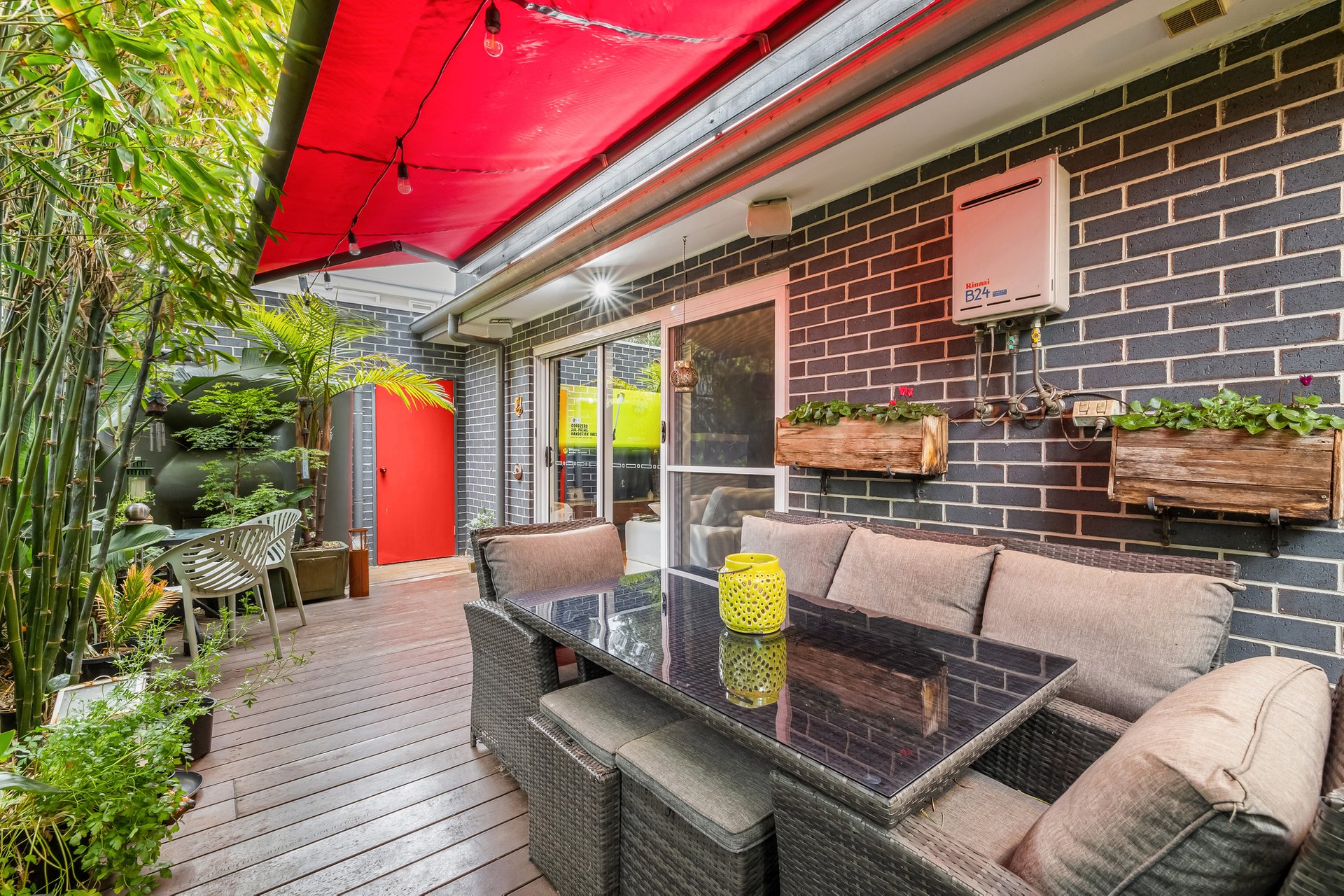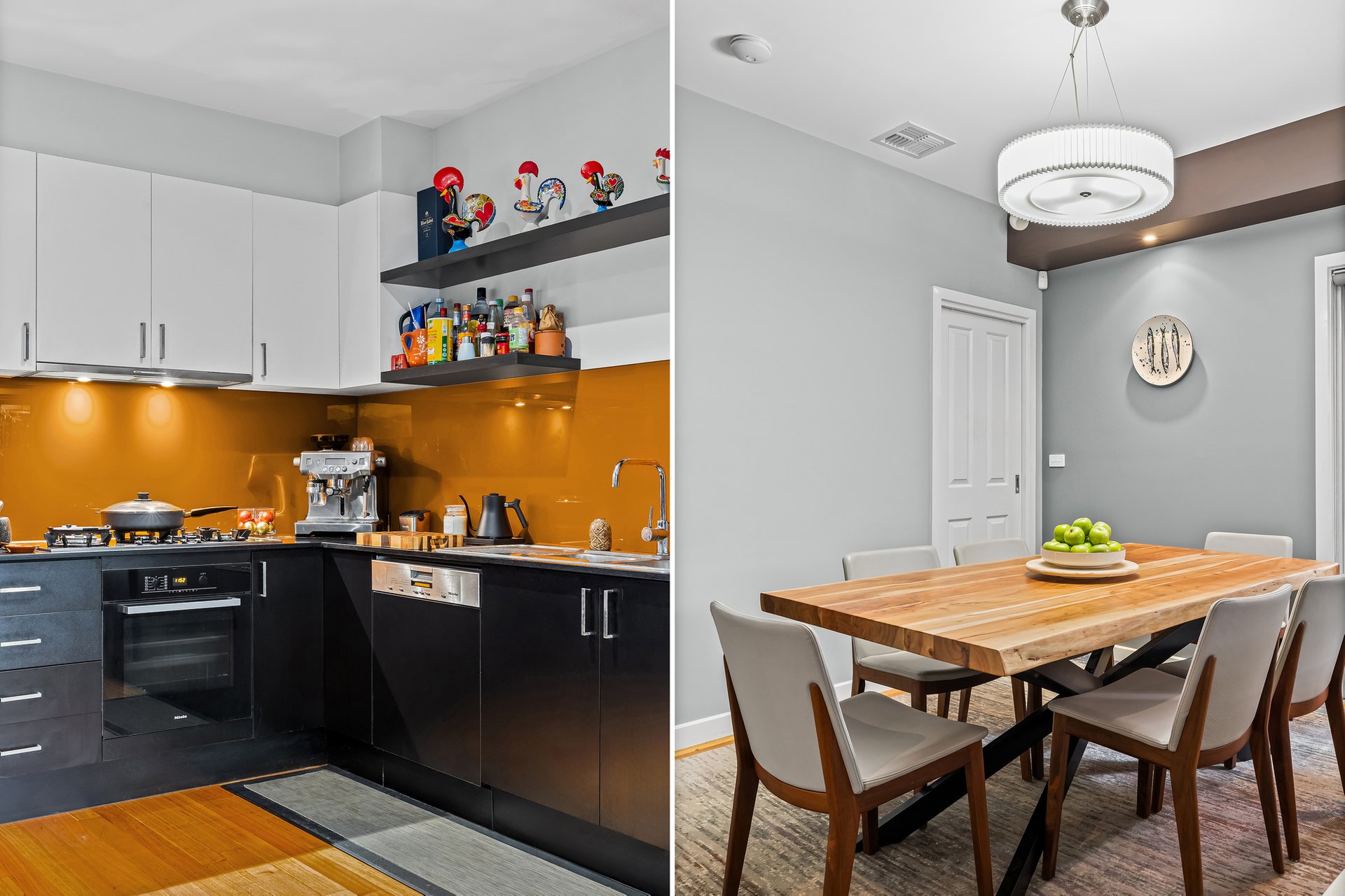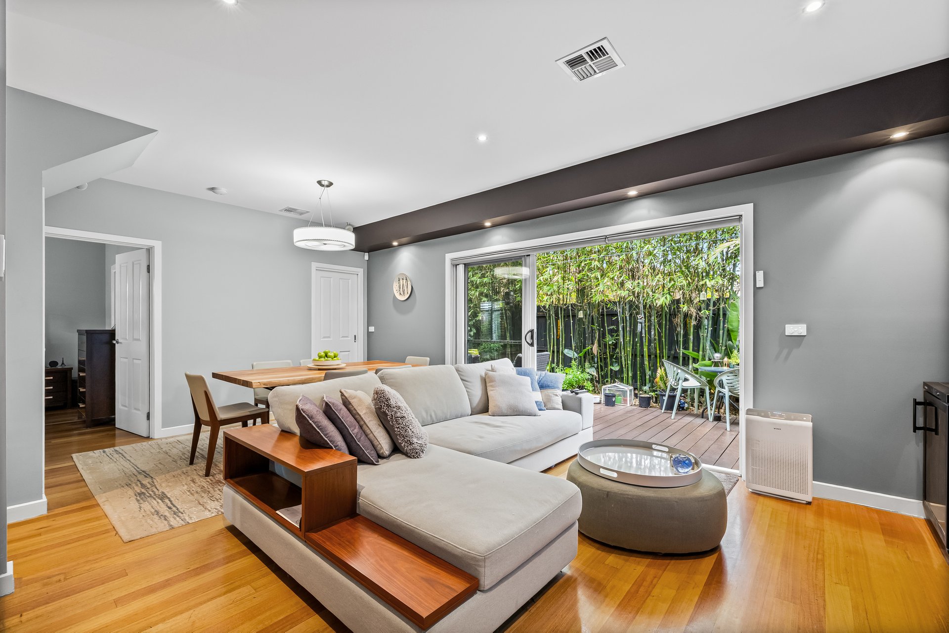 Step inside to a secure entry featuring a digital fingerprint door lock and alarm system, setting the tone for quality throughout. The open-plan living, dining, and kitchen area provides a warm, inviting space with Tasmanian oak floors, dimmable downlights, and Miele appliances in the sleek kitchen. Entertain with ease as glass doors open to a deck with integrated lighting and a spacious merbau decking courtyard, complete with a gas connection for barbecues and a 2060L rainwater tank.