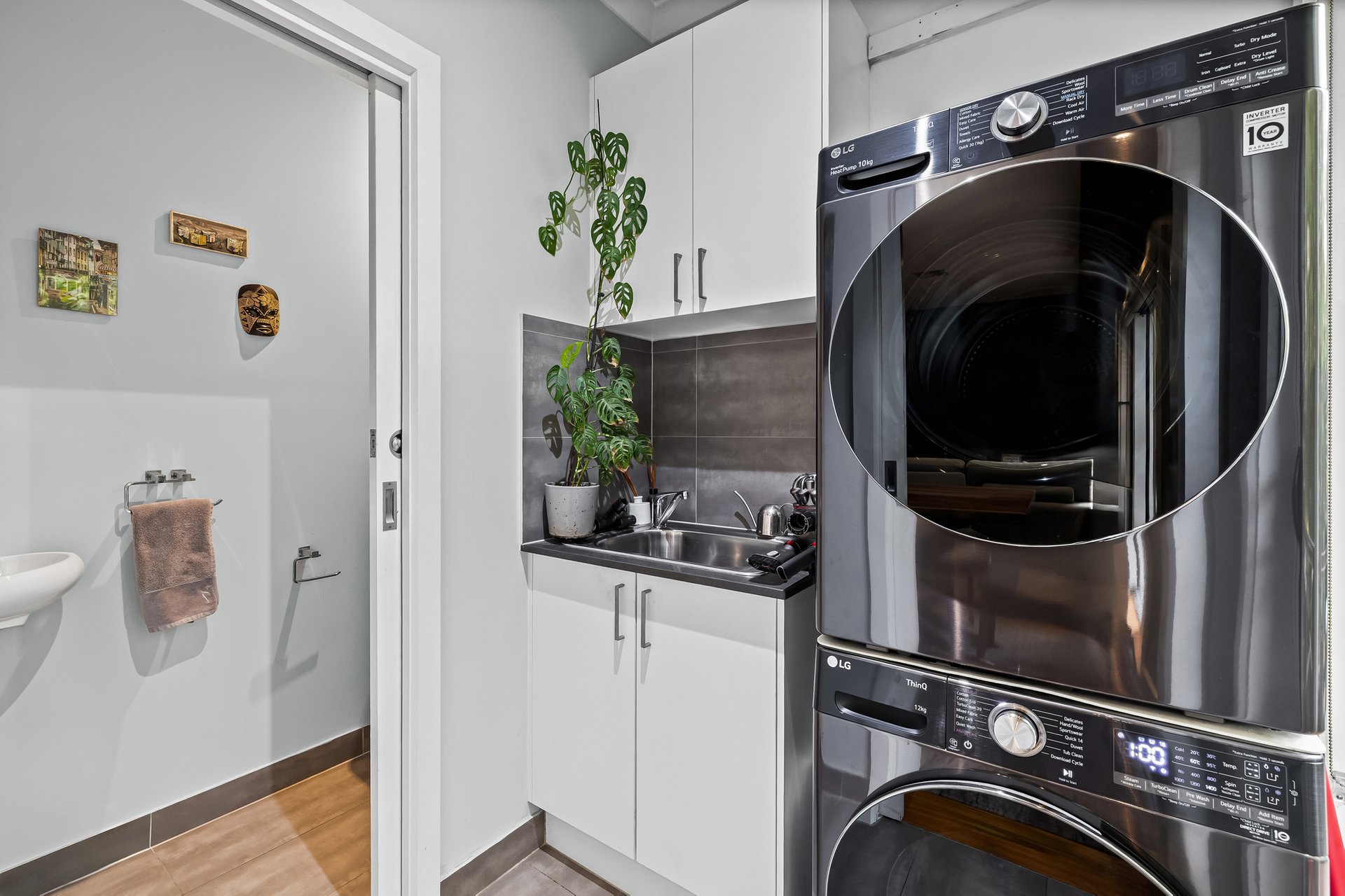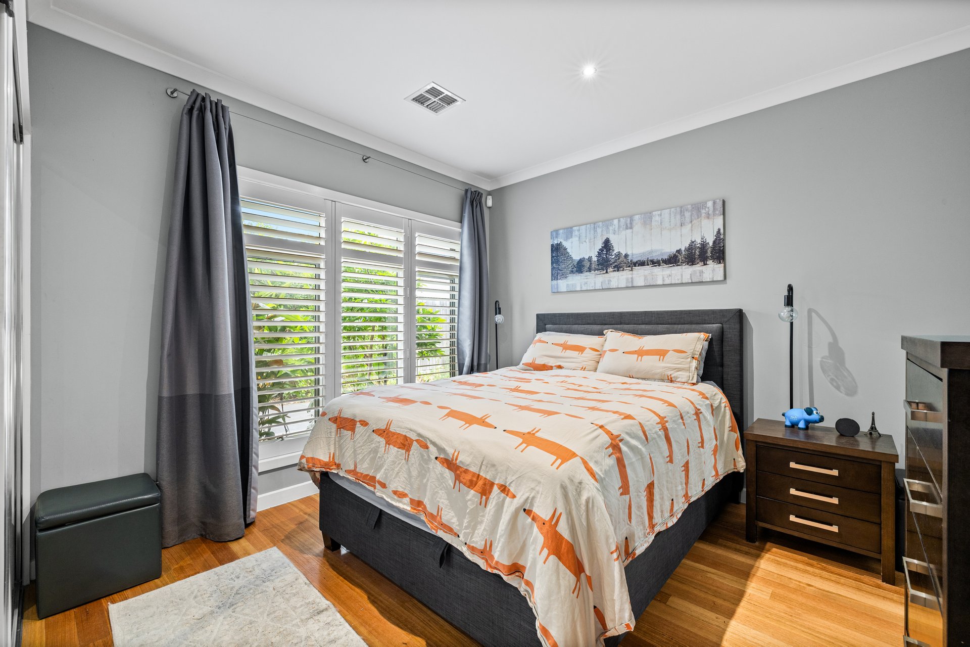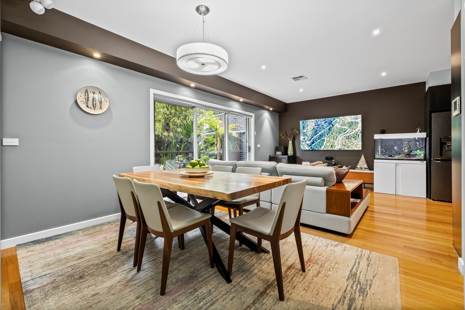 Step inside to a secure entry featuring a digital fingerprint door lock and alarm system, setting the tone for quality throughout. The open-plan living, dining, and kitchen area provides a warm, inviting space with Tasmanian oak floors, dimmable downlights, and Miele appliances in the sleek kitchen. Entertain with ease as glass doors open to a deck with integrated lighting and a spacious merbau decking courtyard, complete with a gas connection for barbecues and a 2060L rainwater tank.