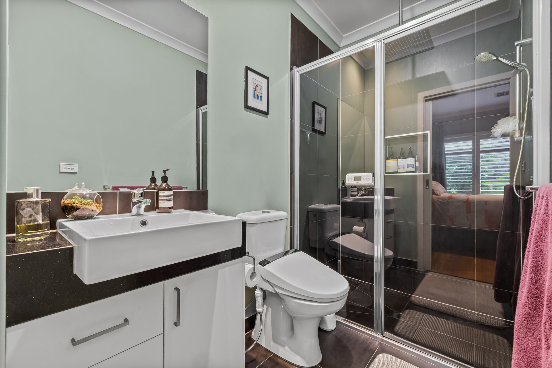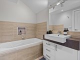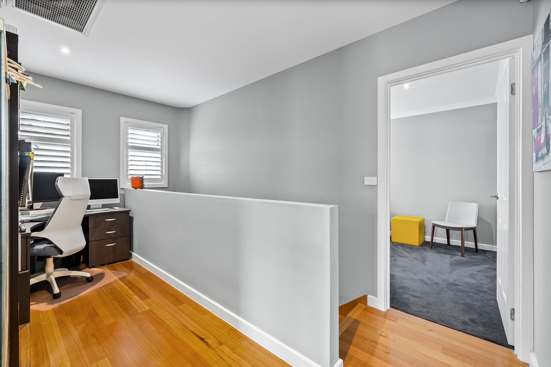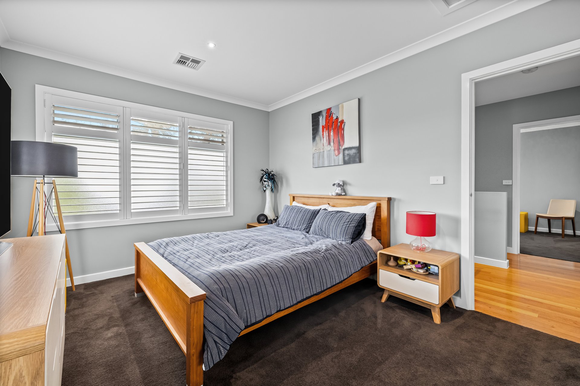 Upstairs, two bedrooms with built-in robes and plantation blinds are complemented by a separate study area, while a third bedroom offers flexibility on the lower level. The main bathroom features a relaxing bathtub, and the ensuite showcases a luxurious rain shower. Comfort is enhanced by ducted air conditioning, electric blinds, and surround sound wiring.