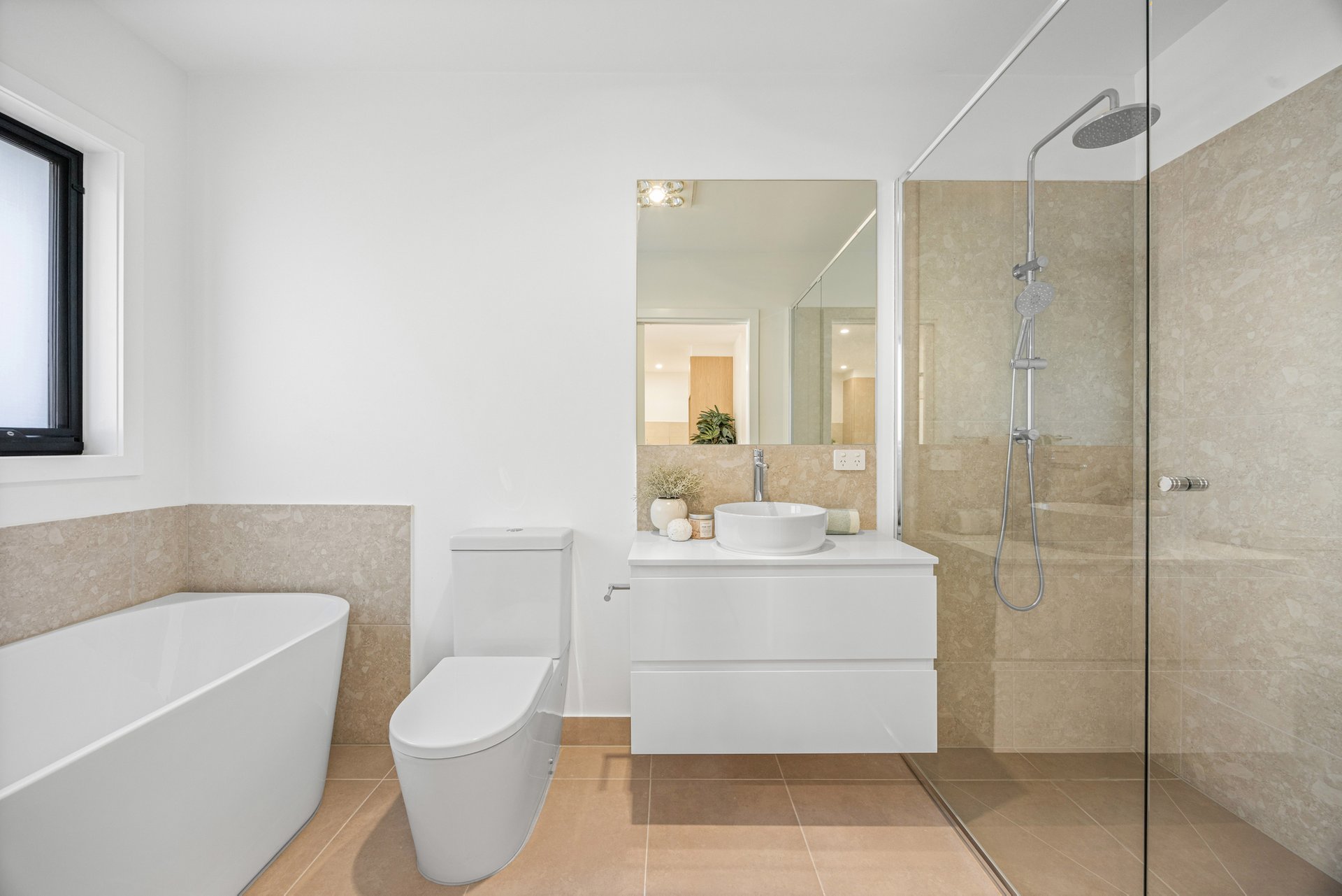 - Tiled bathrooms with freestanding back to wall bathtubs, twin-head showers and wall-hung vanities with 20mm stone benchtops