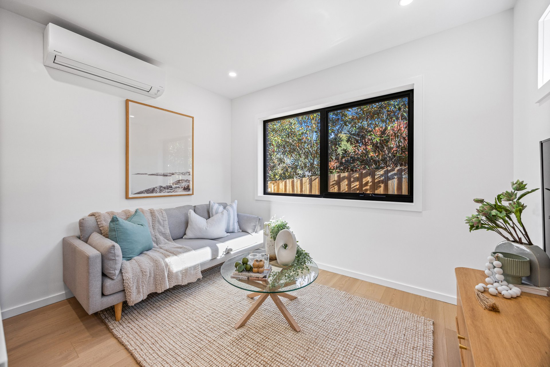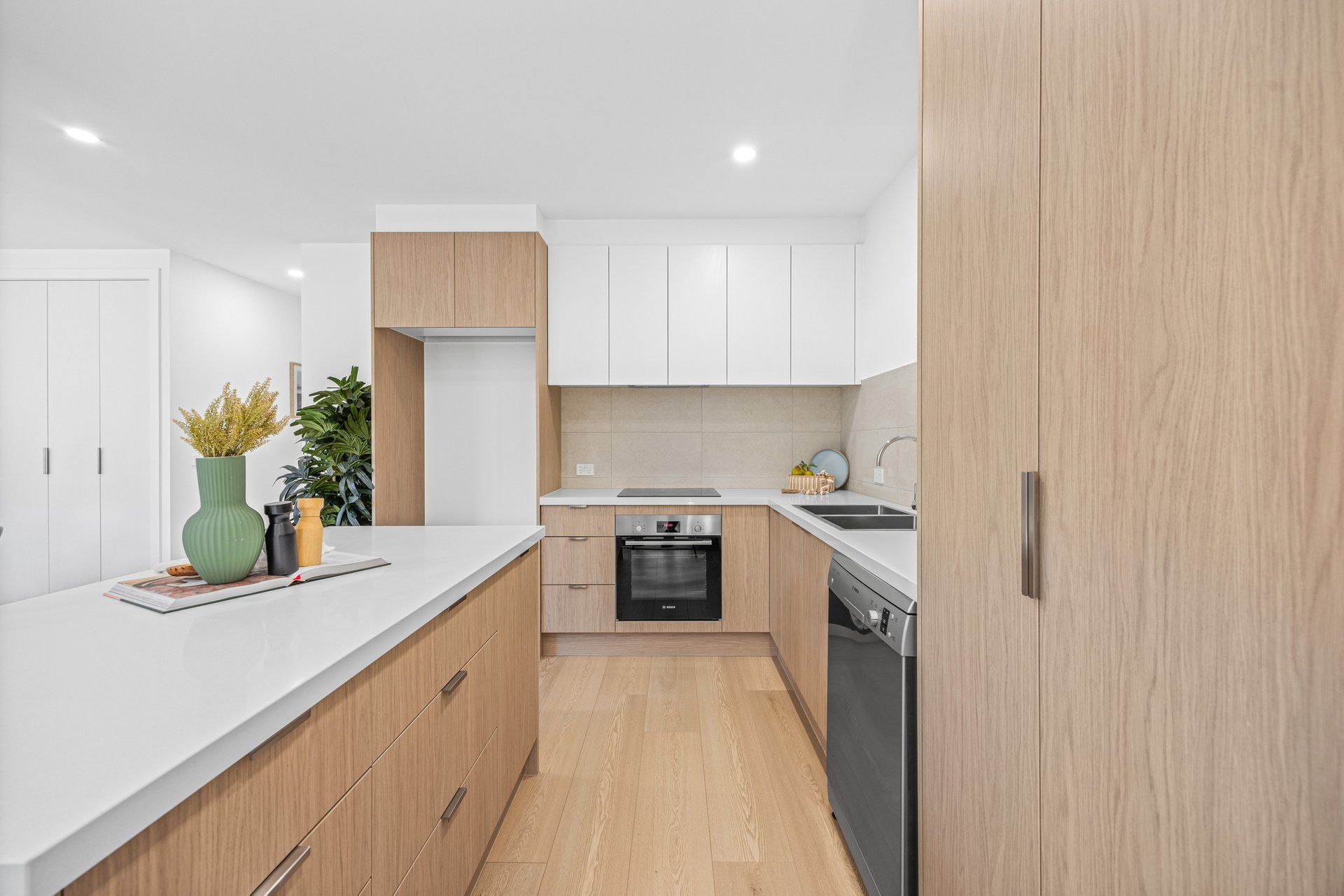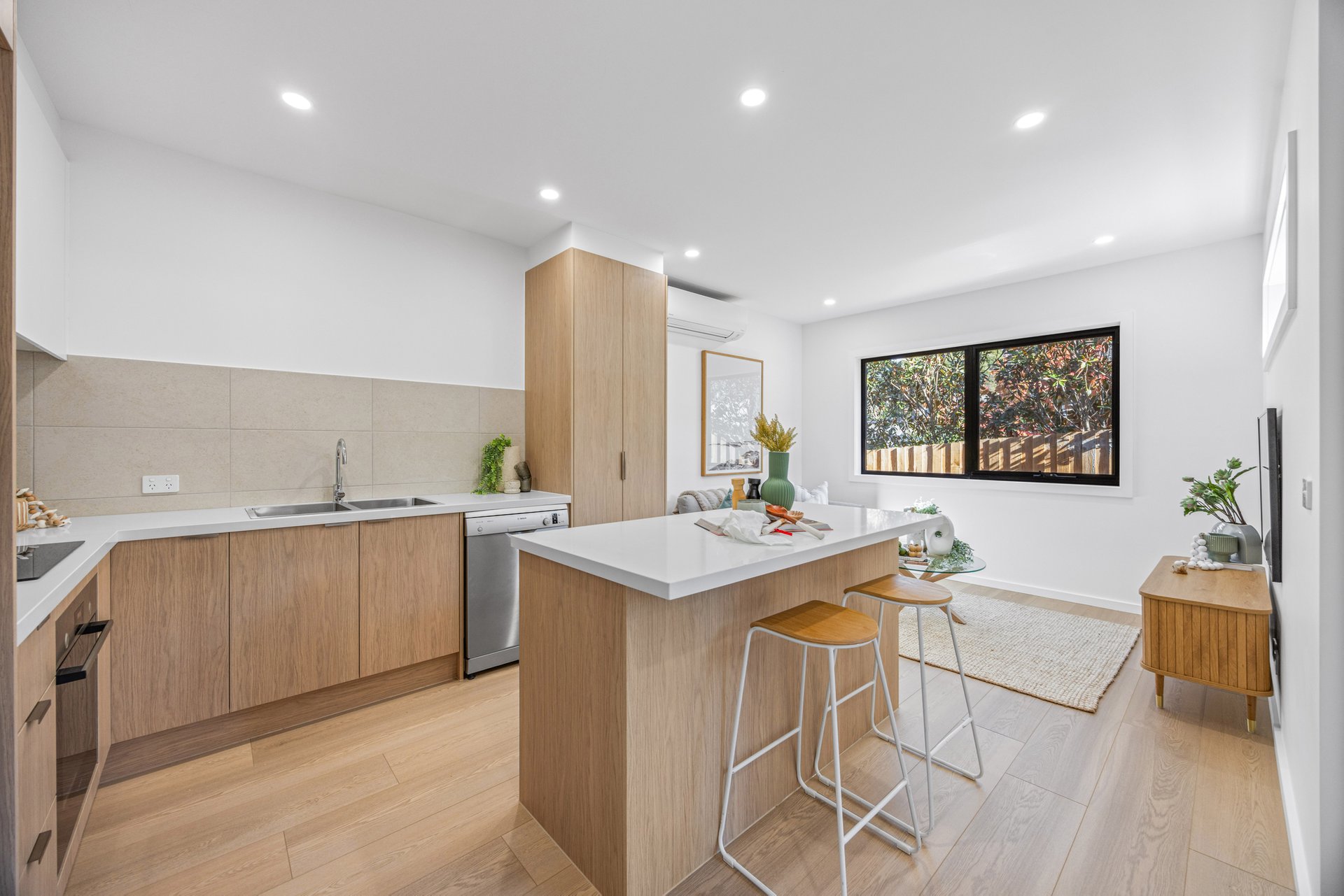 Spacious open plan living and dining rooms sit at the heart of each home, flowing naturally to private courtyards. Kitchens are fitted to a superb standard, boasting Bosch cooking appliances, Schweigen undermount rangehoods, gloss wrap soft close cabinetry, tiled splashbacks and 40mm edge YDL Crystalline Silica-free benchtops. Oak-look laminate floating floorboards, soft carpet and tiled wet areas complete the interiors with a warm, polished finish.