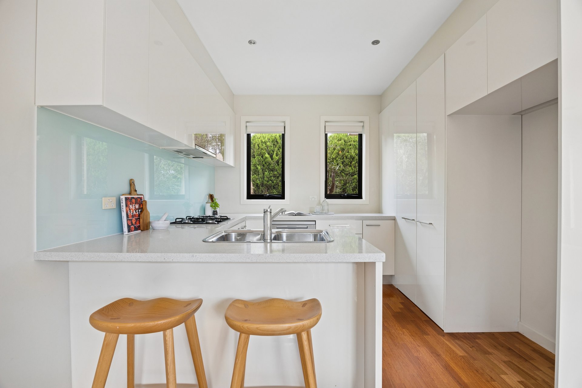 Timber floors run through the open-plan living and dining room, where a double sliding door, with a pet door alongside, opens directly to the sunlit alfresco patio. The kitchen keeps pace with stone benchtops, a glass splashback, dishwasher and a breakfast bar, just as suited to preparing a quiet weeknight meal as it is to cooking for a crowd.