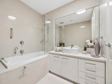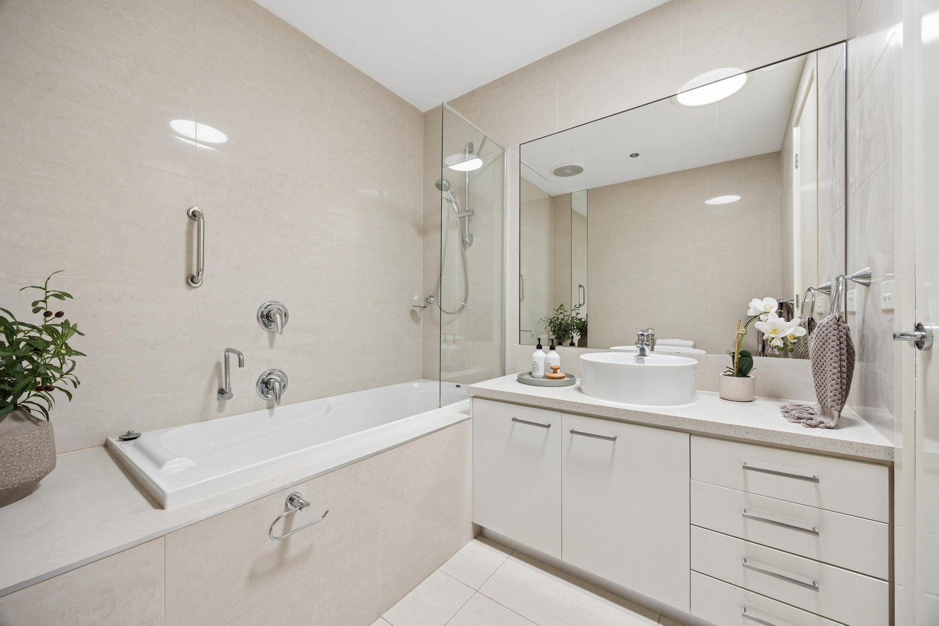 The main bedroom has a built-in robe and a skylit ensuite with bath, walk-in shower and vessel basin above a wide vanity with excellent storage. The second bedroom is also fitted with cupboards and its own door into a matching skylit bathroom, giving both rooms a level of privacy not often found in a unit. The third room works as a bedroom or a quiet study with garden outlook.