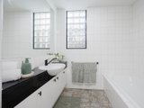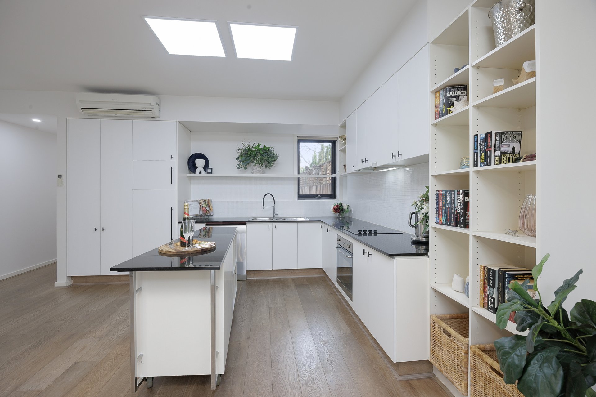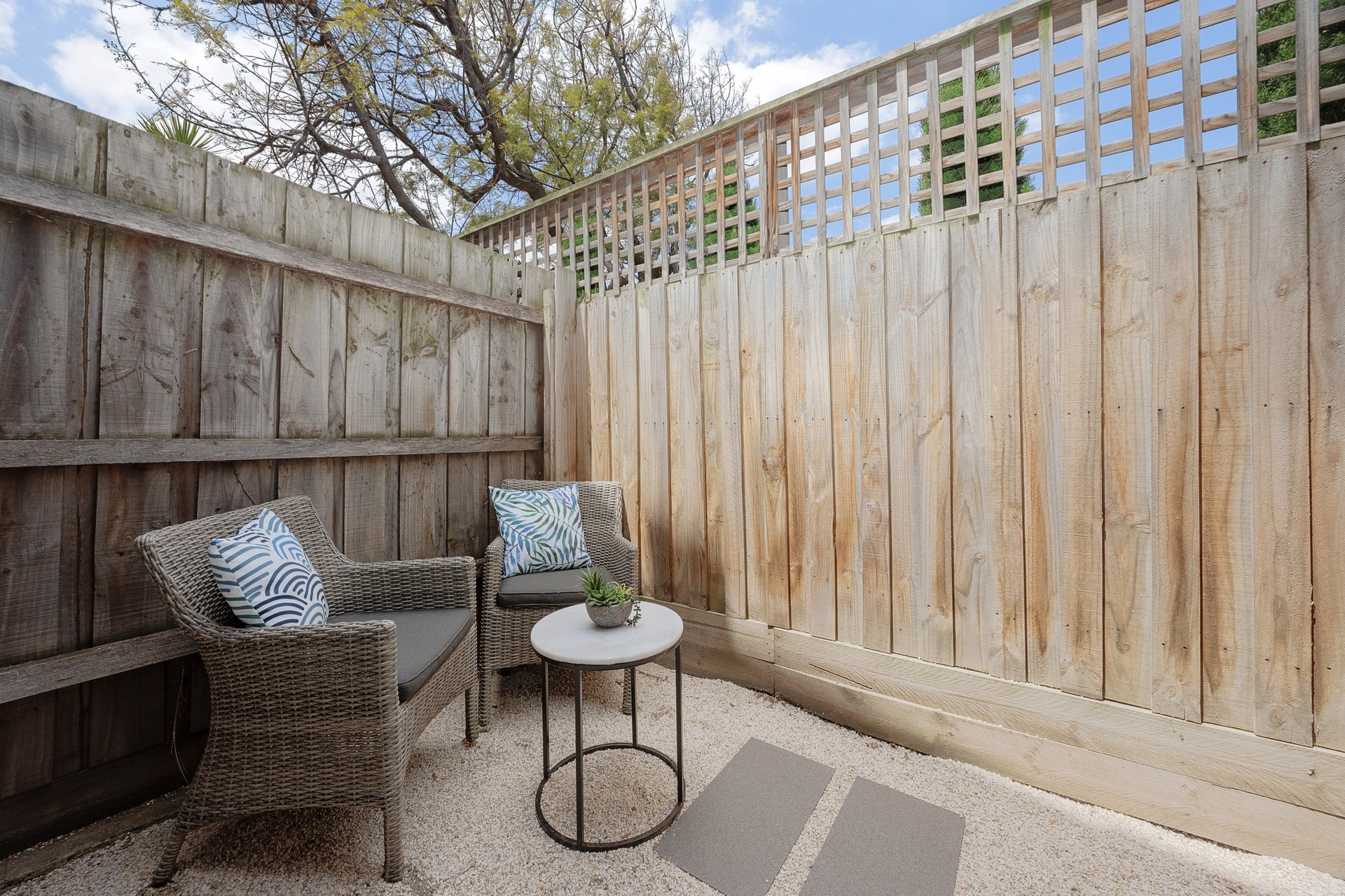 The generous bedrooms feature built-in robes – the main with French-door access to a second private courtyard with extra storage space. The large, fully tiled central bathroom includes a walk-in shower, a stone vanity, full sized bath and toilet. Thoughtful inclusions, such as the handy shelving and drawers in the hallway nook really give this stunner an edge.