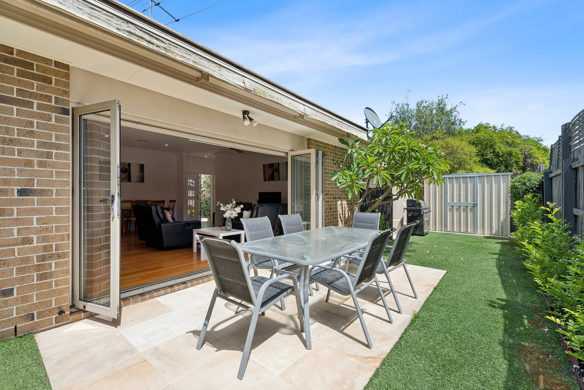 Inside, a generous living and dining room flows straight into an open-plan kitchen with stone benchtops, a 90cm five-burner gas cooker and stainless-steel dishwasher. Bi-fold doors peel back to a north-facing patio with an electric awning and an easy-care garden yard that wraps around the back. It’s a great setup for entertaining, for children to run around, or for enjoying some outdoor downtime.