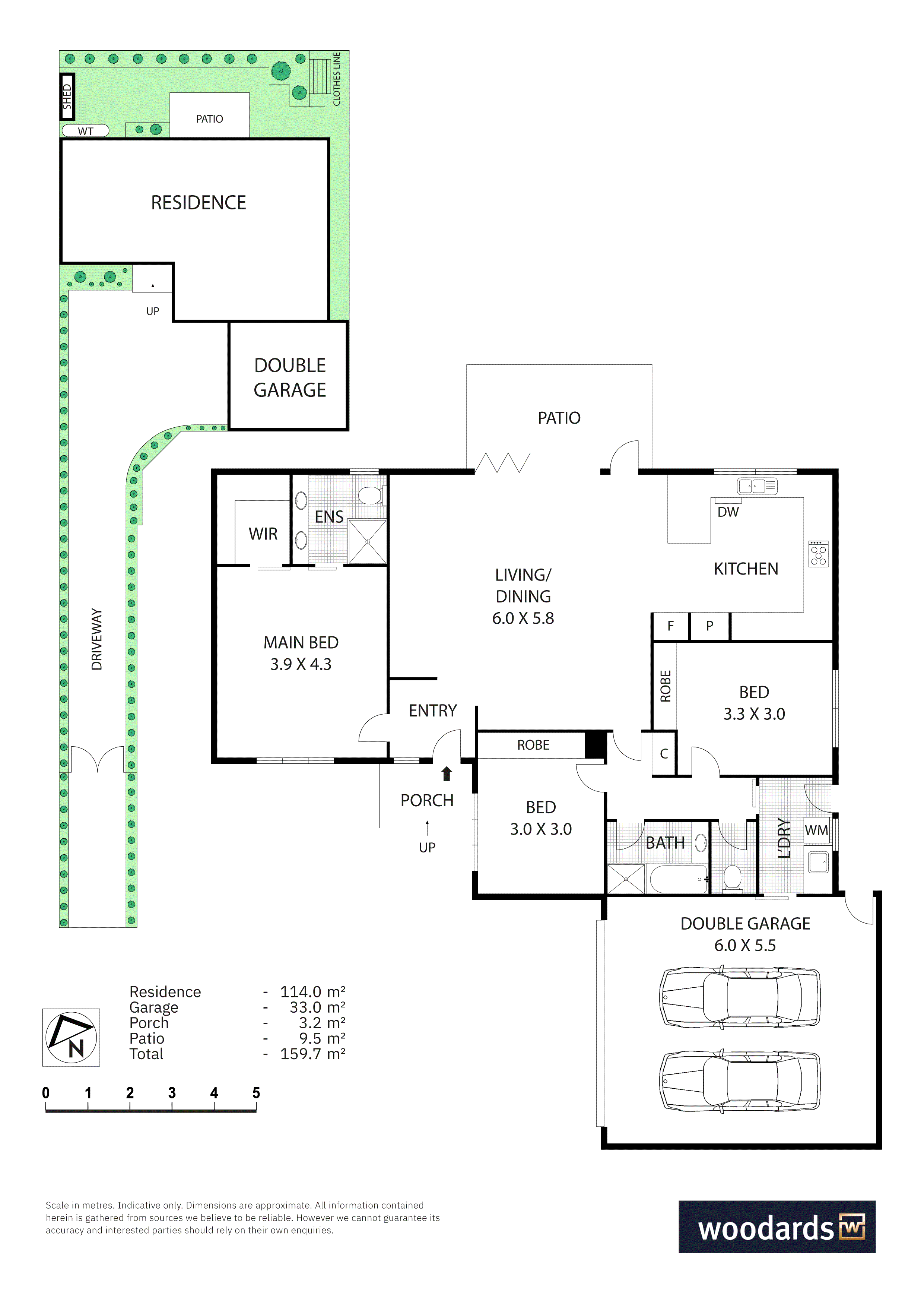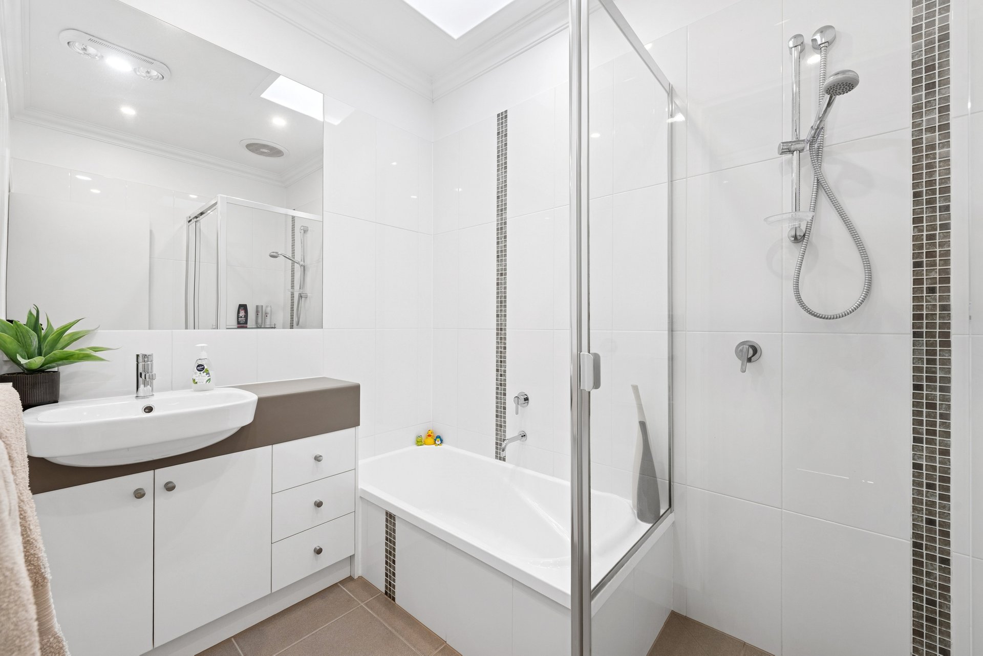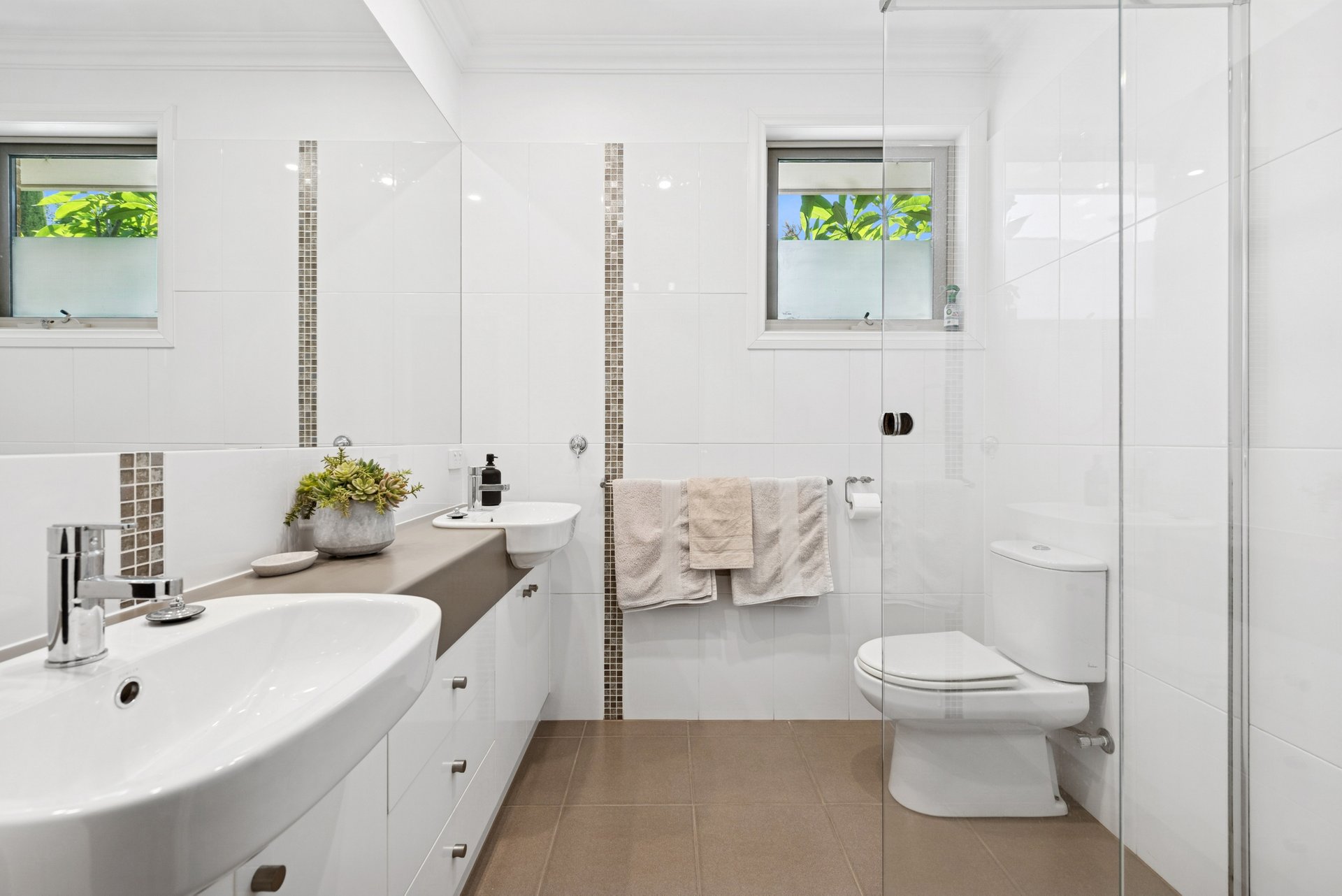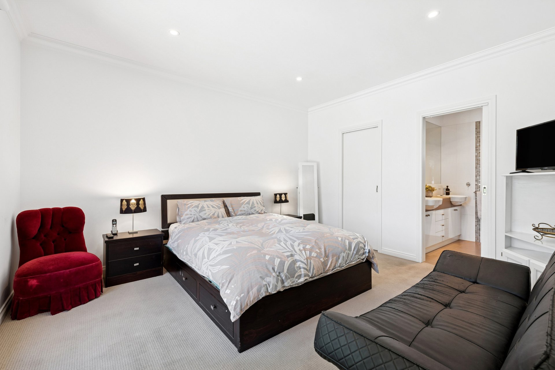 The main bedroom sits in its own zone with a walk-in robe and ensuite featuring a double vanity, shower and toilet. Two further bedrooms include built-in robes and are served by a central bathroom with bath and shower, plus a separate toilet.