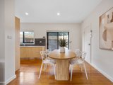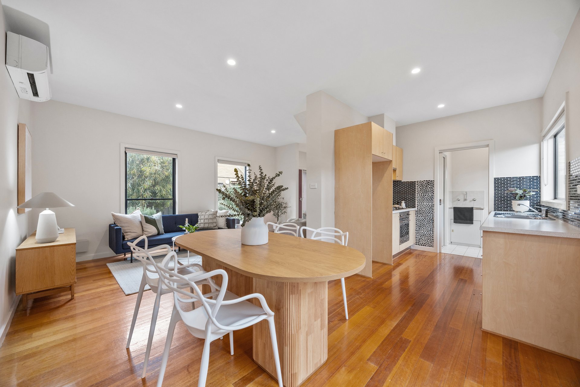 The open-plan living and dining area features sleek hardwood flooring and a split system for year-round comfort, while sliding doors extend the space to a well-maintained courtyard, a private retreat ideal for relaxed entertaining. The double galley kitchen sits just off the dining area, equipped with a Blanco gas stove, electric oven, laminate benchtops, and ample storage above and below.