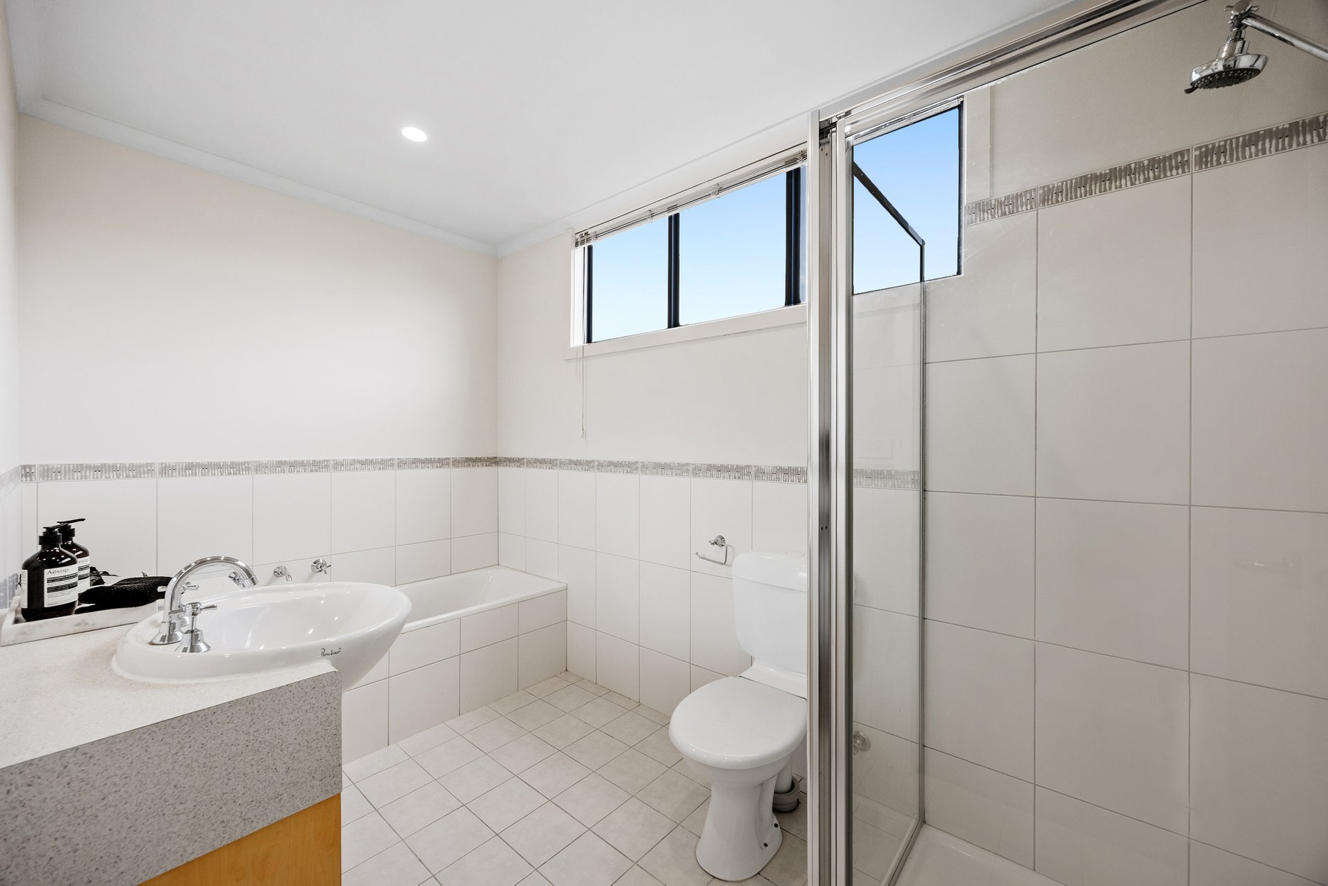 Upstairs, two carpeted bedrooms offer built-in robes, plush comfort, and an abundance of natural light with one opening out to a private balcony. The tiled bathroom includes a bathtub and modern laminate vanity, while a separate downstairs WC adds convenience.