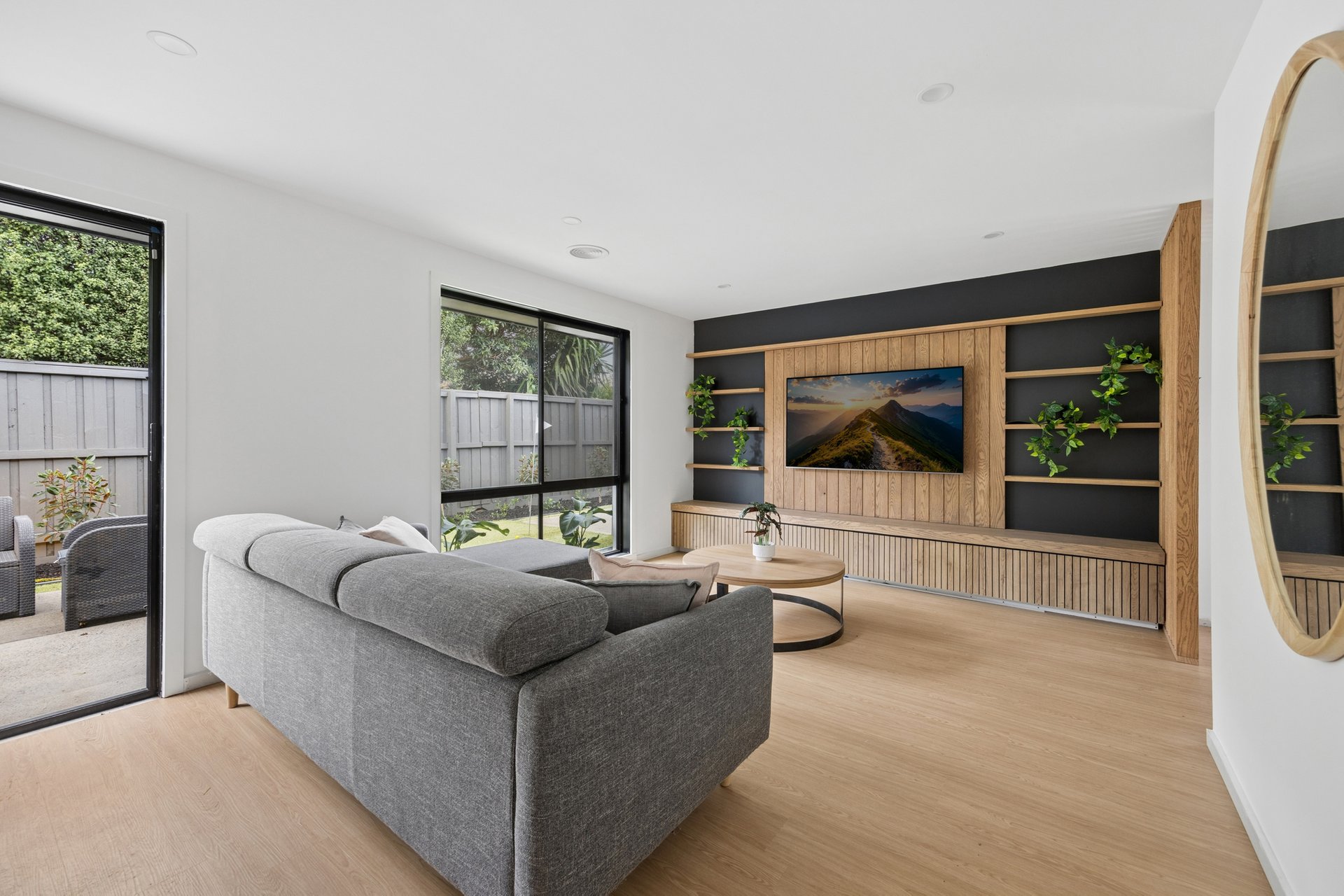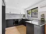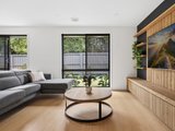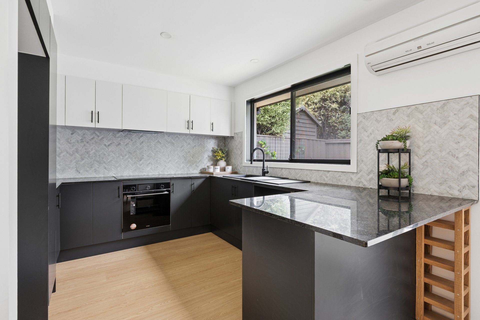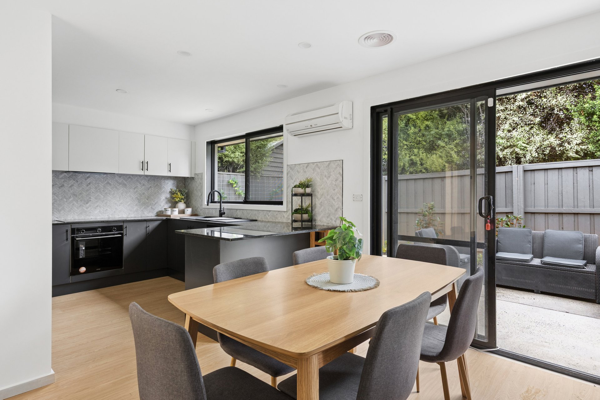 Inside, the generous open-plan living and dining room is fitted with a custom-designed wall unit that brings both style and practicality to the space. Sliding doors connect to a sunny north-facing patio and a low-maintenance garden with established plants to nurture. As enjoyable to cook in as it is to look at, the kitchen is appointed with stone benchtops and herringbone-patterned splashback tiles.