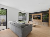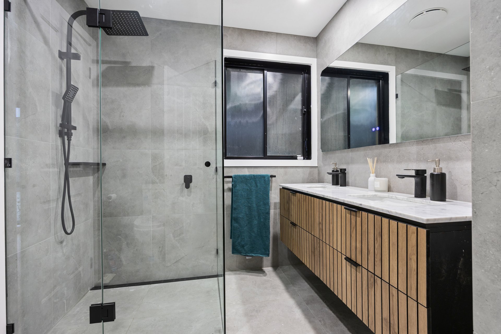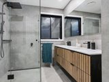 The three bedrooms are well-proportioned, all featuring built-in robes. The main links directly to the sleek semi-ensuite bathroom, where twin vanities, floor-to-ceiling tiles, a frameless shower and black tapware combine to create a refined hotel-like ambience. A European laundry keeps things neat and unobtrusive.