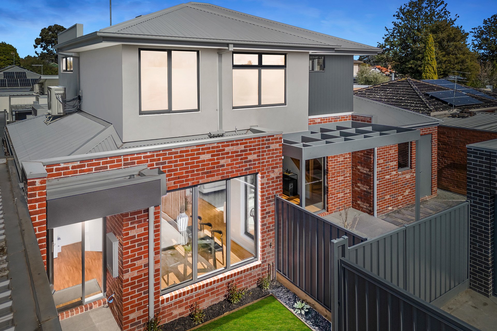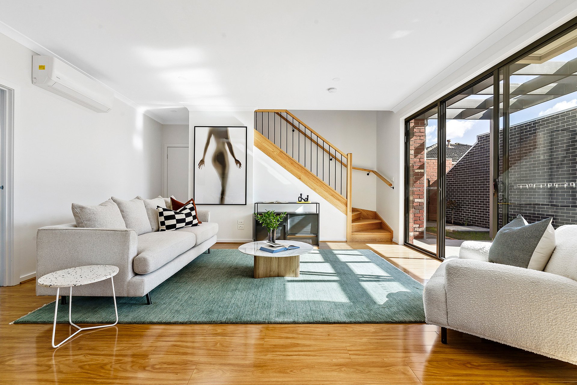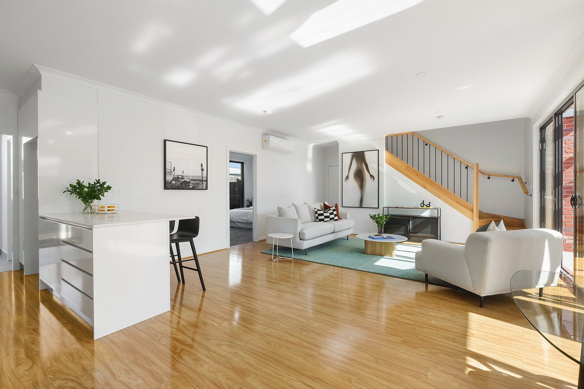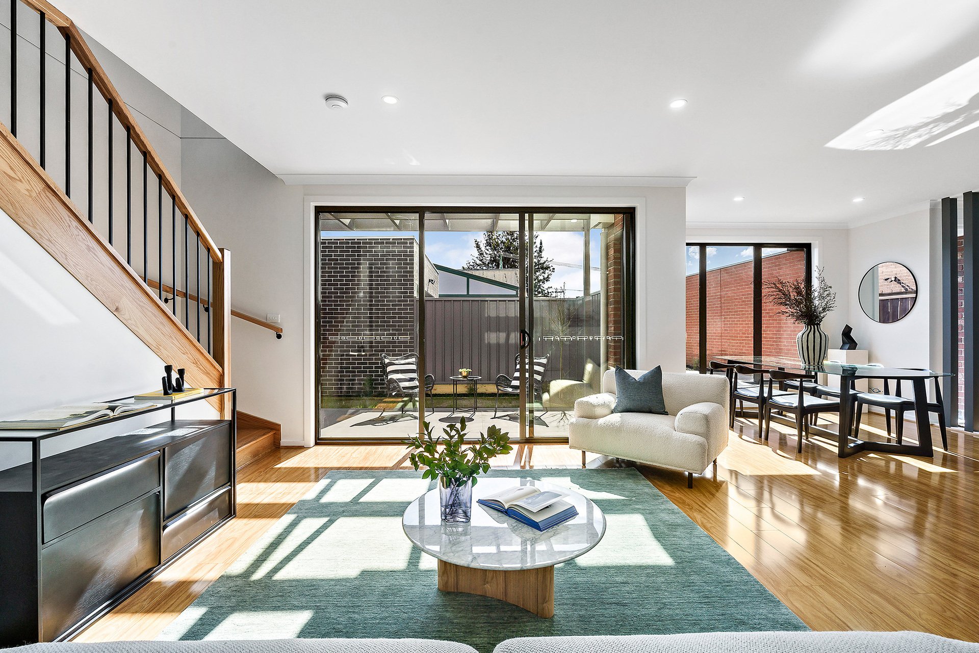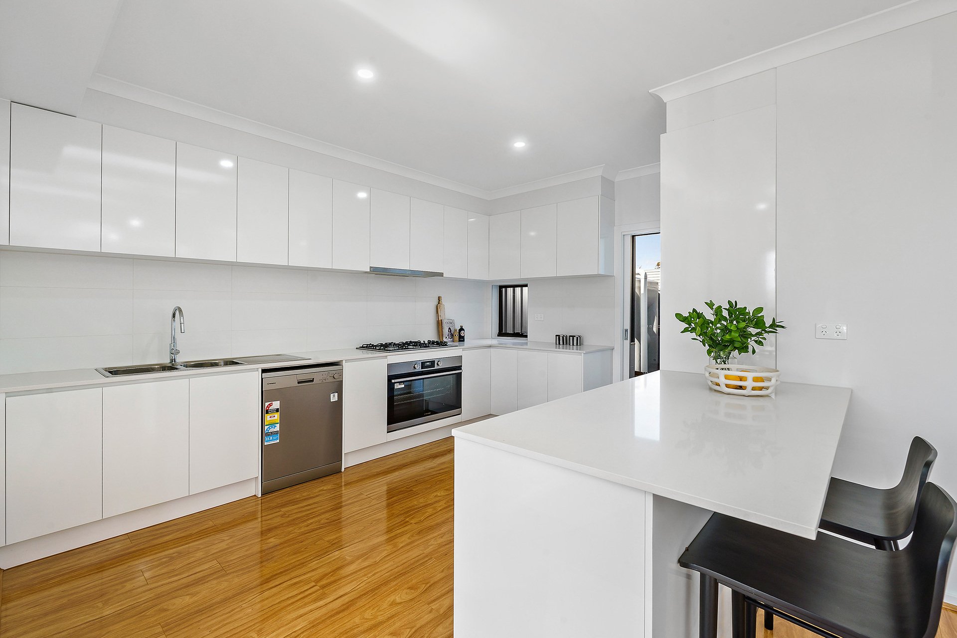 The home features four generously sized bedrooms, including master suites on both the ground and upper floors, providing flexibility and privacy for all family members. The layout includes large courtyards, with the main courtyard showcasing a desirable north aspect, perfect for outdoor entertaining and relaxation. Inside, the large open kitchen is a chef's dream, equipped with a 900mm stainless steel oven and cooktop, a dishwasher, and stunning stone benchtops.