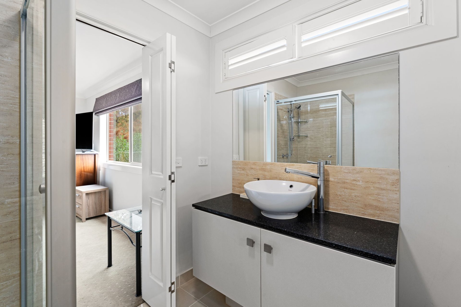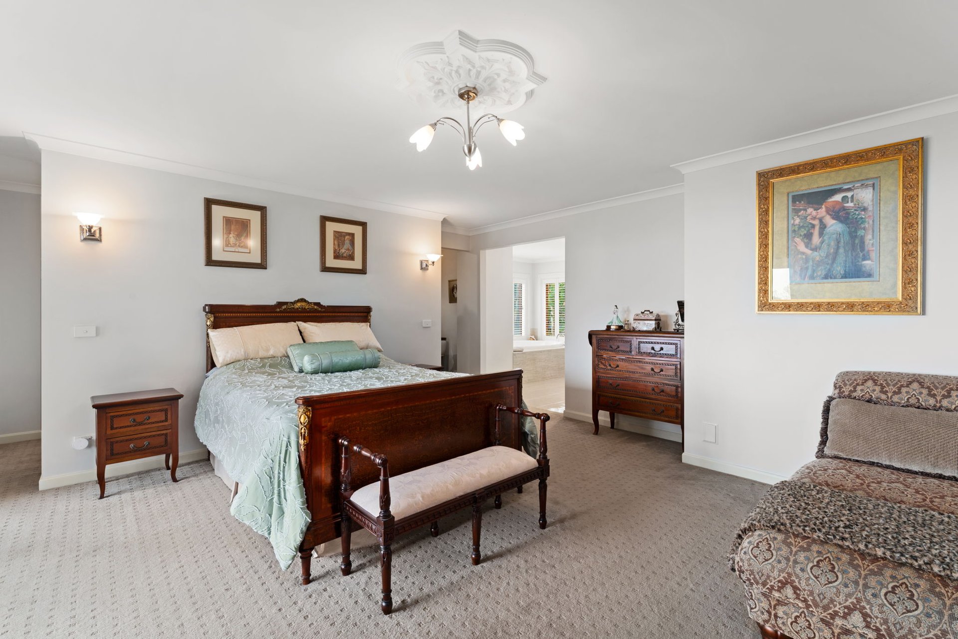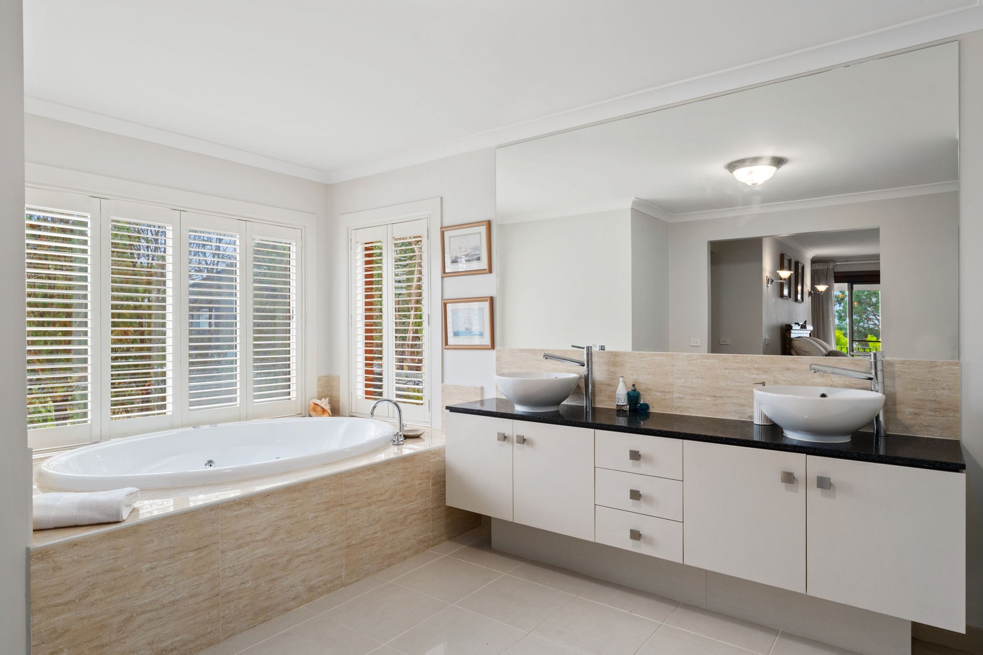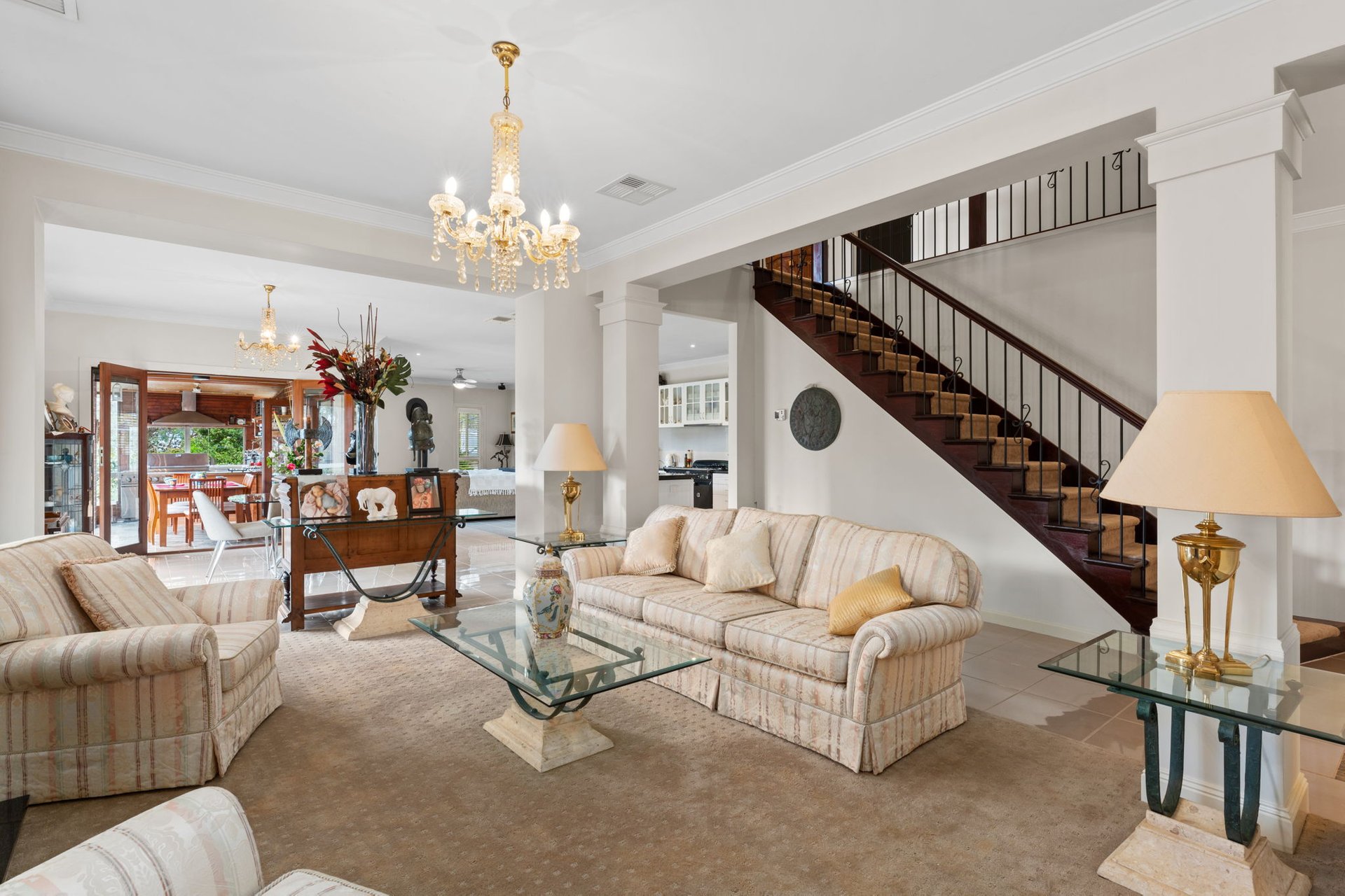 A wrought-iron staircase rises to three generous ensuite bedroom suites, including the primary bedroom that holds sanctuary status, complete with a vast dual-sided walk-in robe, spa bathroom and private balcony capturing elevated bay views. This upper layout intentionally caters to multigenerational/guest needs, with two additional lounge rooms offering private retreat for all.