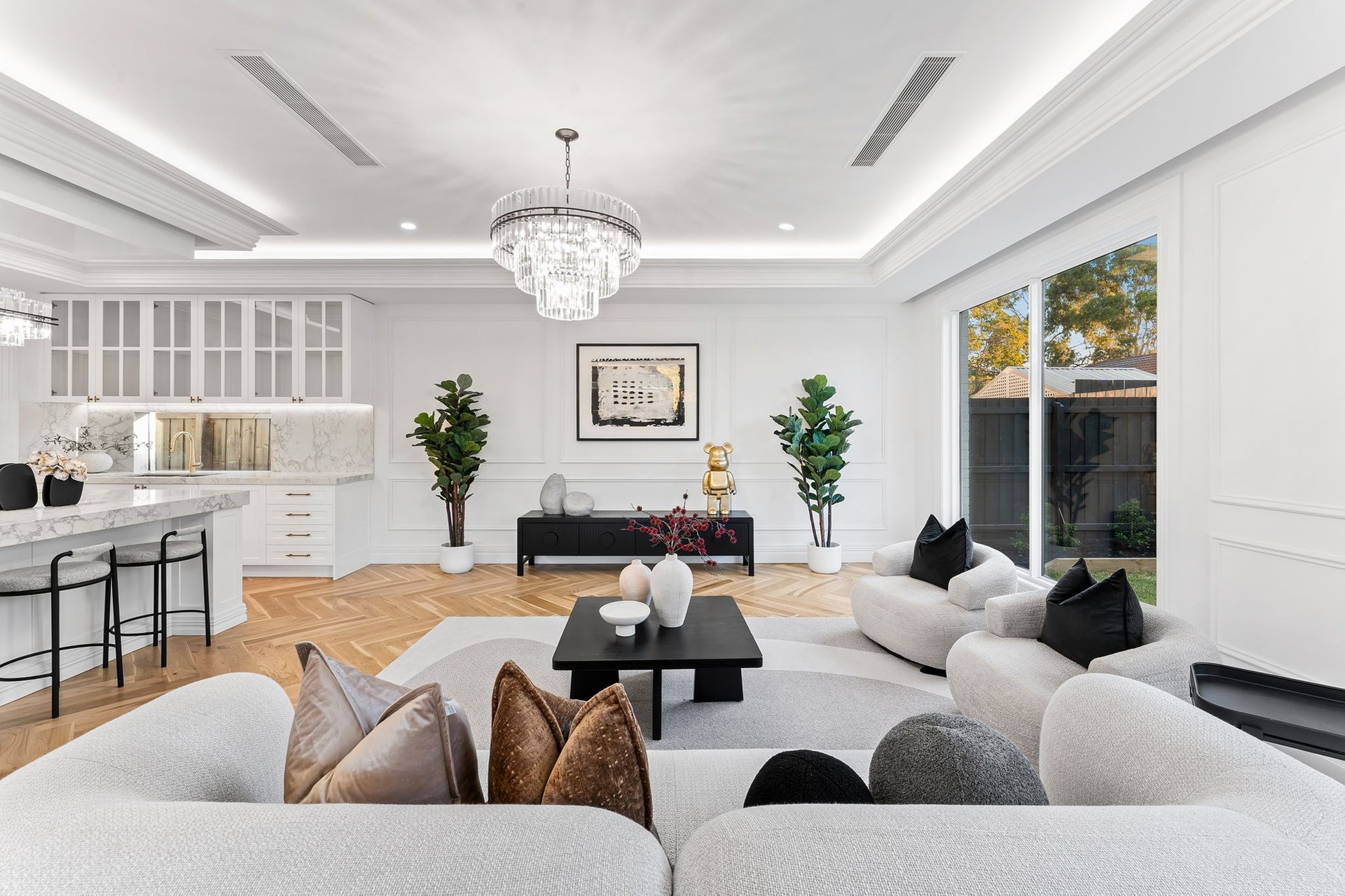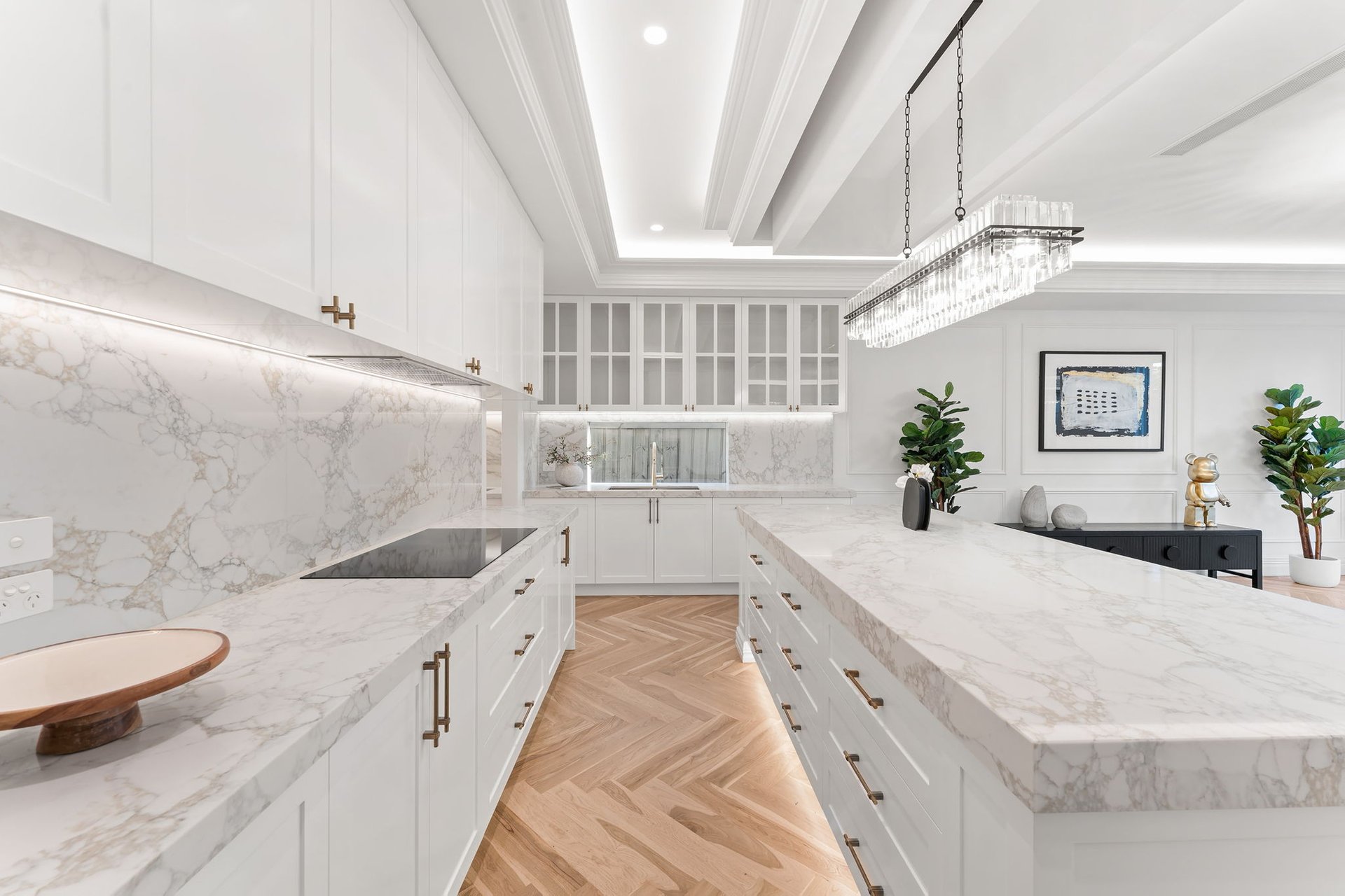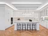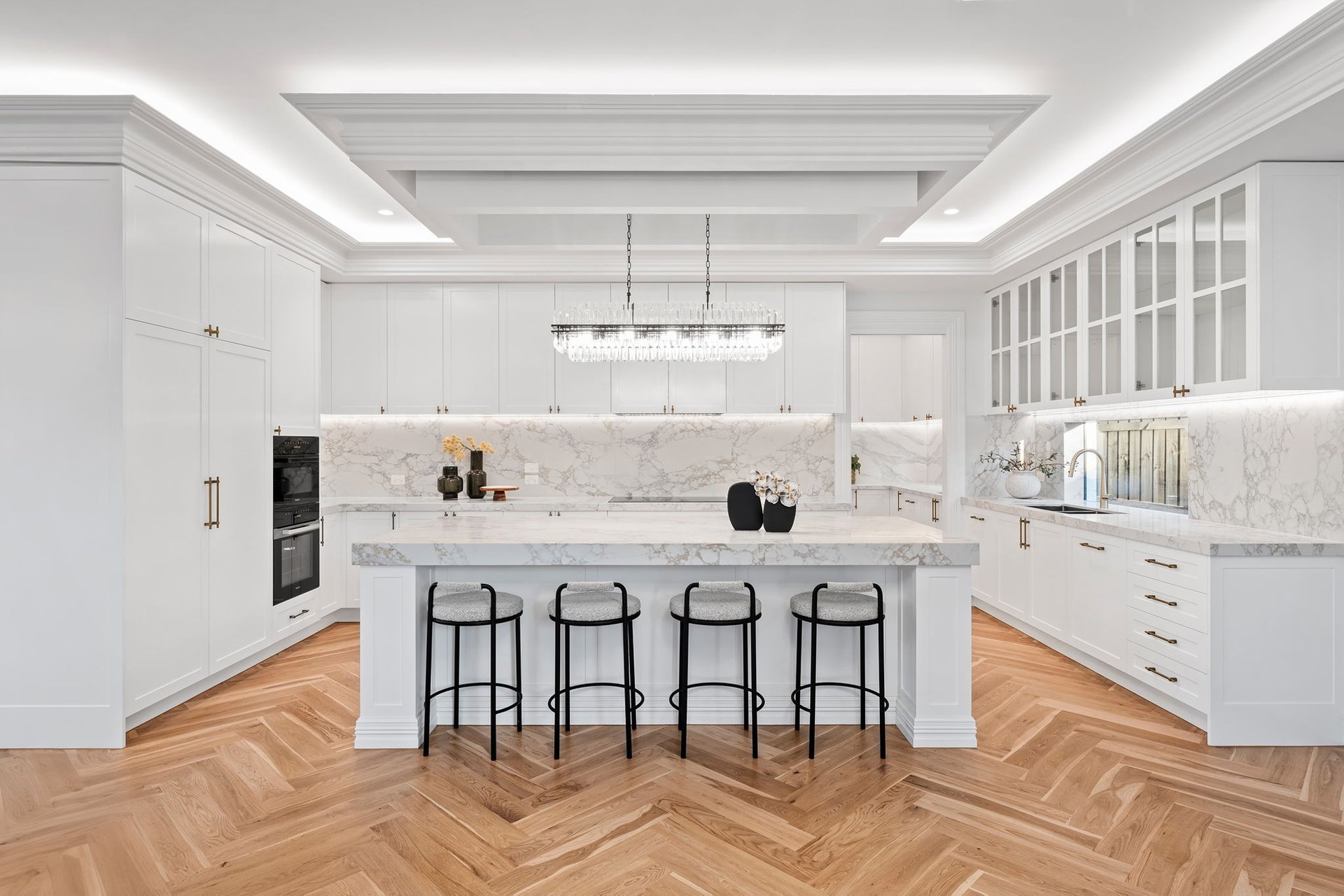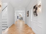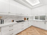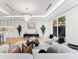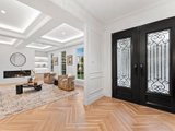 Accessed through bespoke double doors with a digital lock, sophistication is exhibited across two lavishly appointed levels. Tall ceilings with chandeliers, exquisite parquetry timber flooring and elaborate detailing such as wainscot wall panelling, decorative bulkheads and tall colonial windows elevate the home’s spaces.