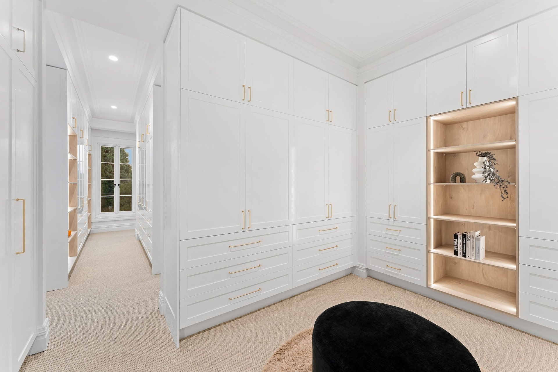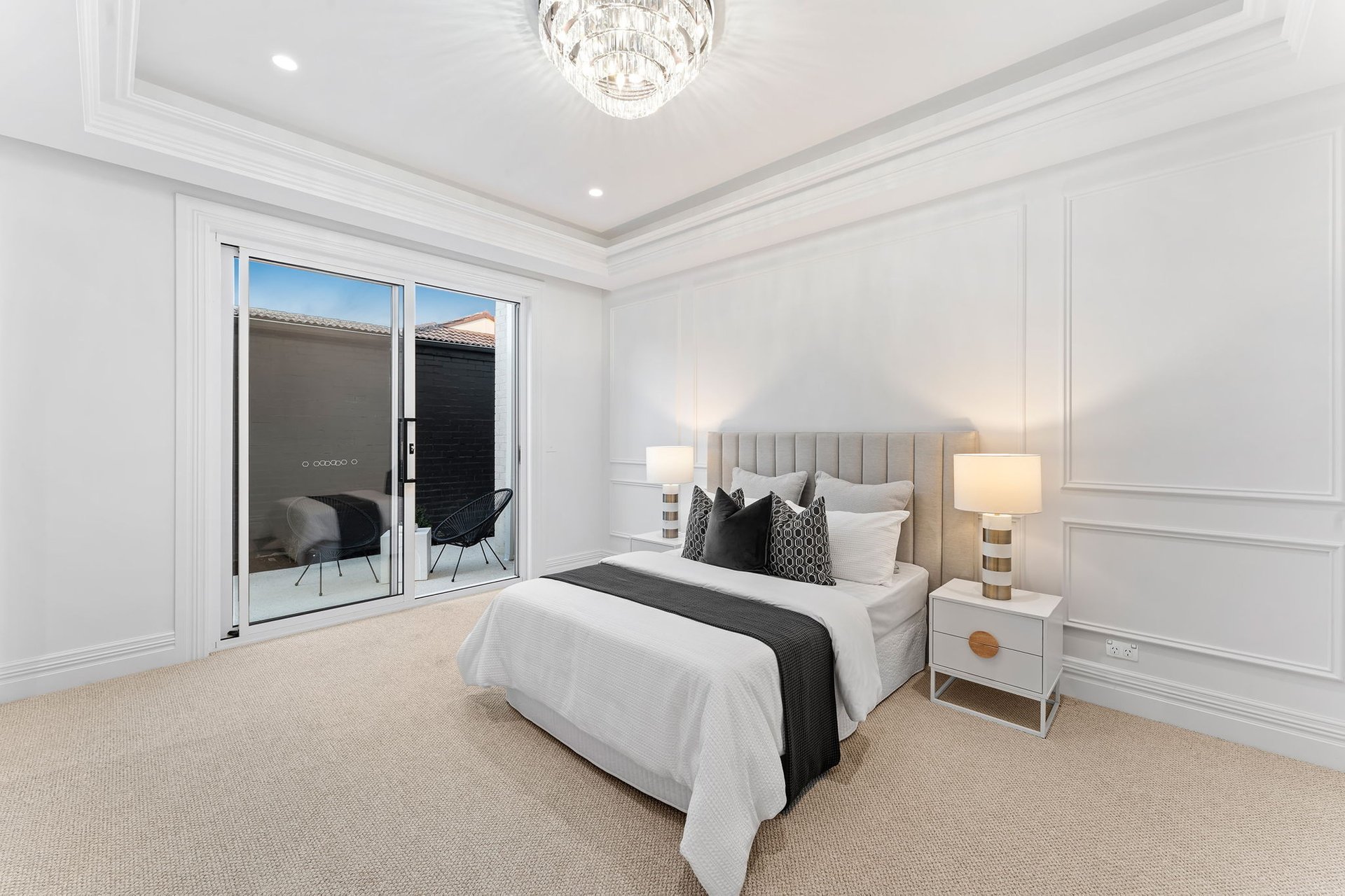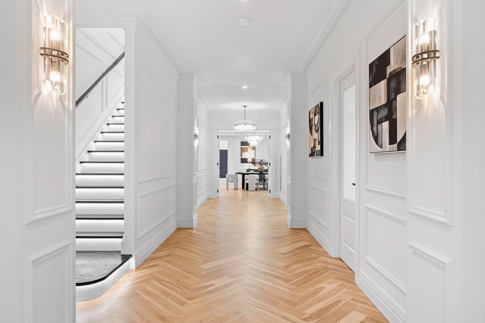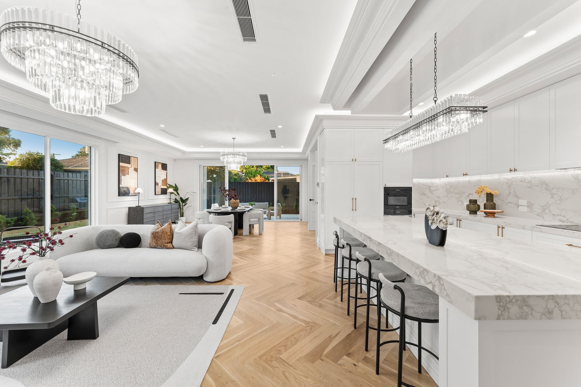 Accessed through bespoke double doors with a digital lock, sophistication is exhibited across two lavishly appointed levels. Tall ceilings with chandeliers, exquisite parquetry timber flooring and elaborate detailing such as wainscot wall panelling, decorative bulkheads and tall colonial windows elevate the home’s spaces.