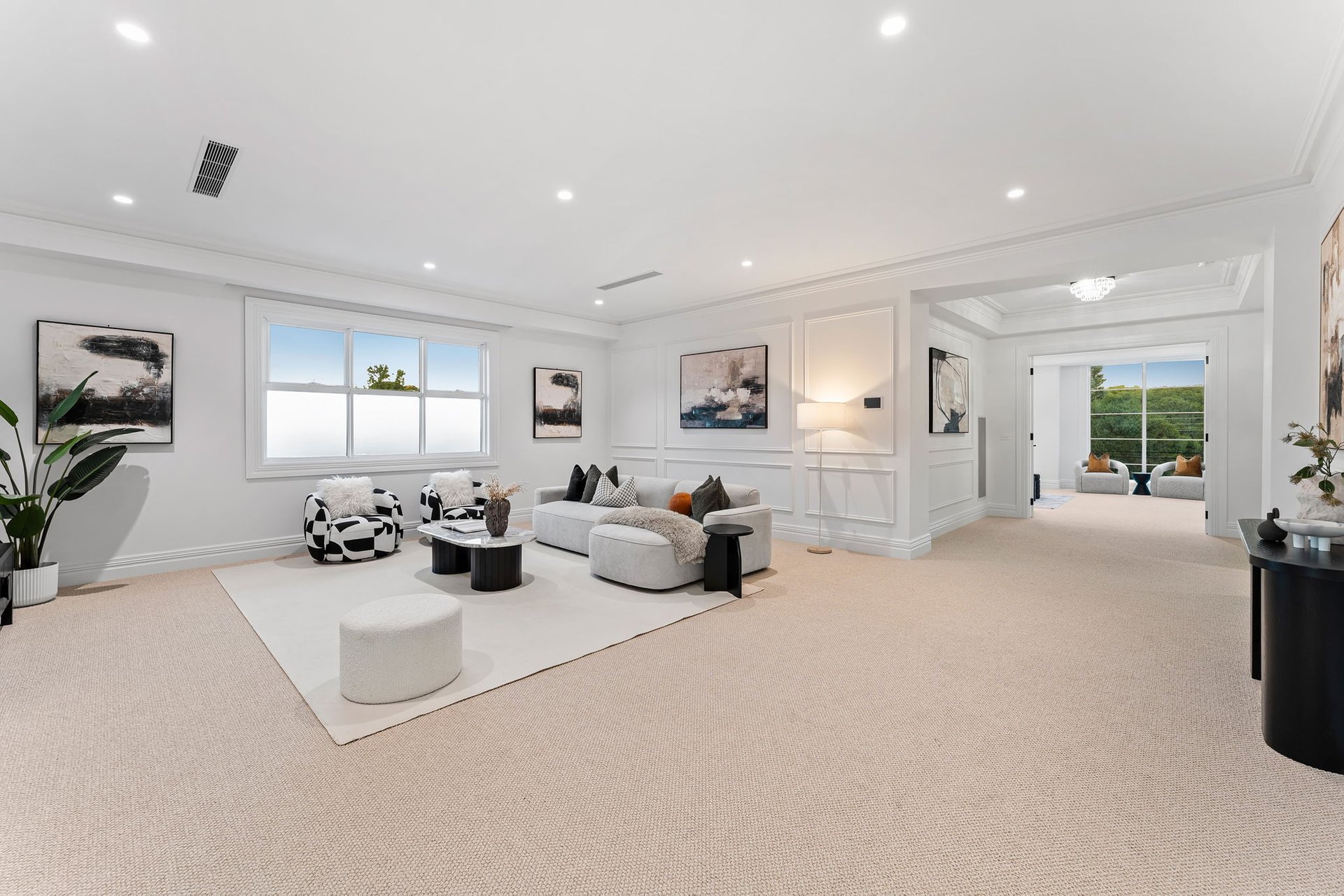 An instant sense of arrival is asserted as you approach its stately entrance, introduced by an automatic gated driveway and a pedestrian gate with camera intercom. Exposed aggregate and paved pathways frame the residence, softened by landscaped gardens.