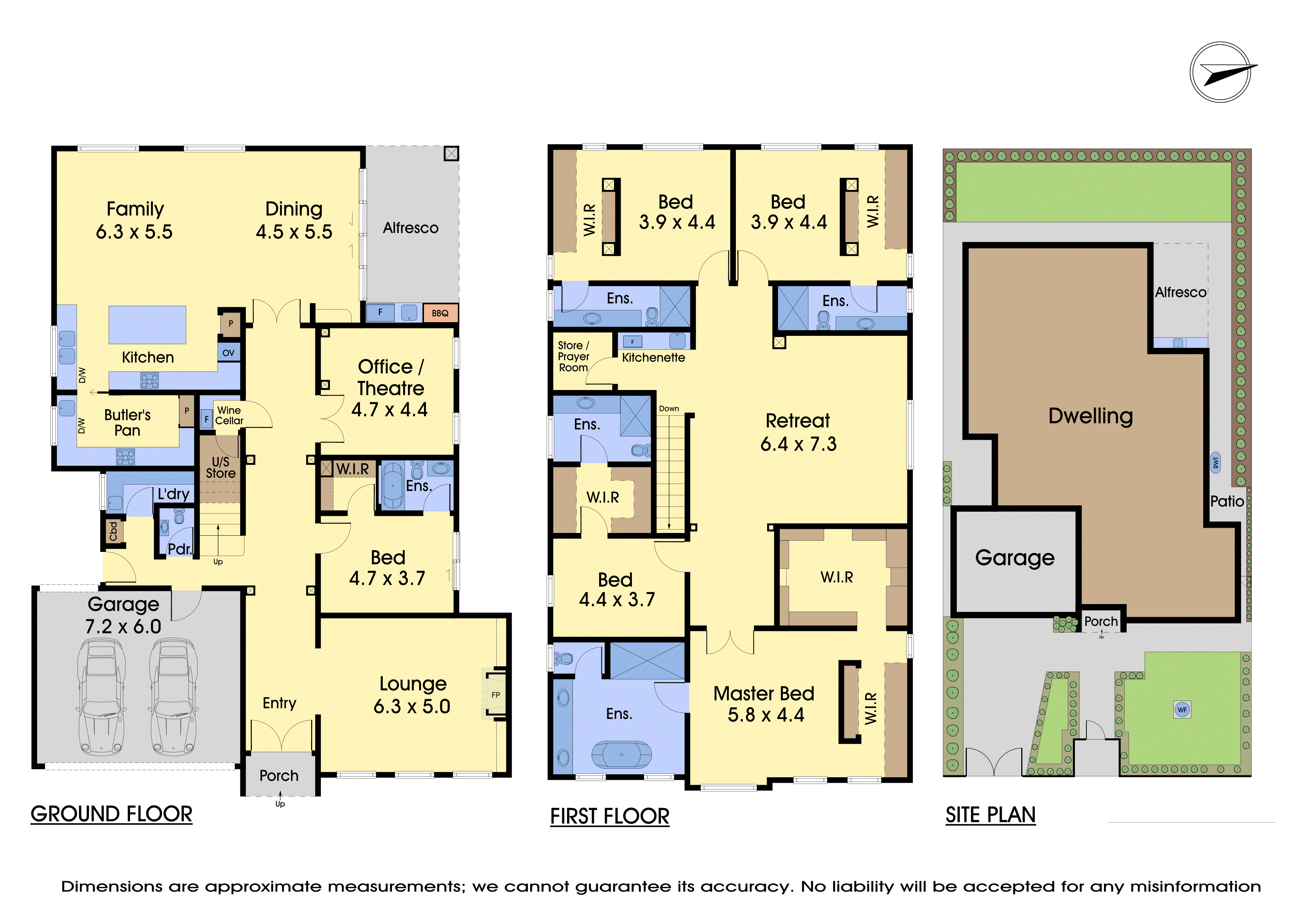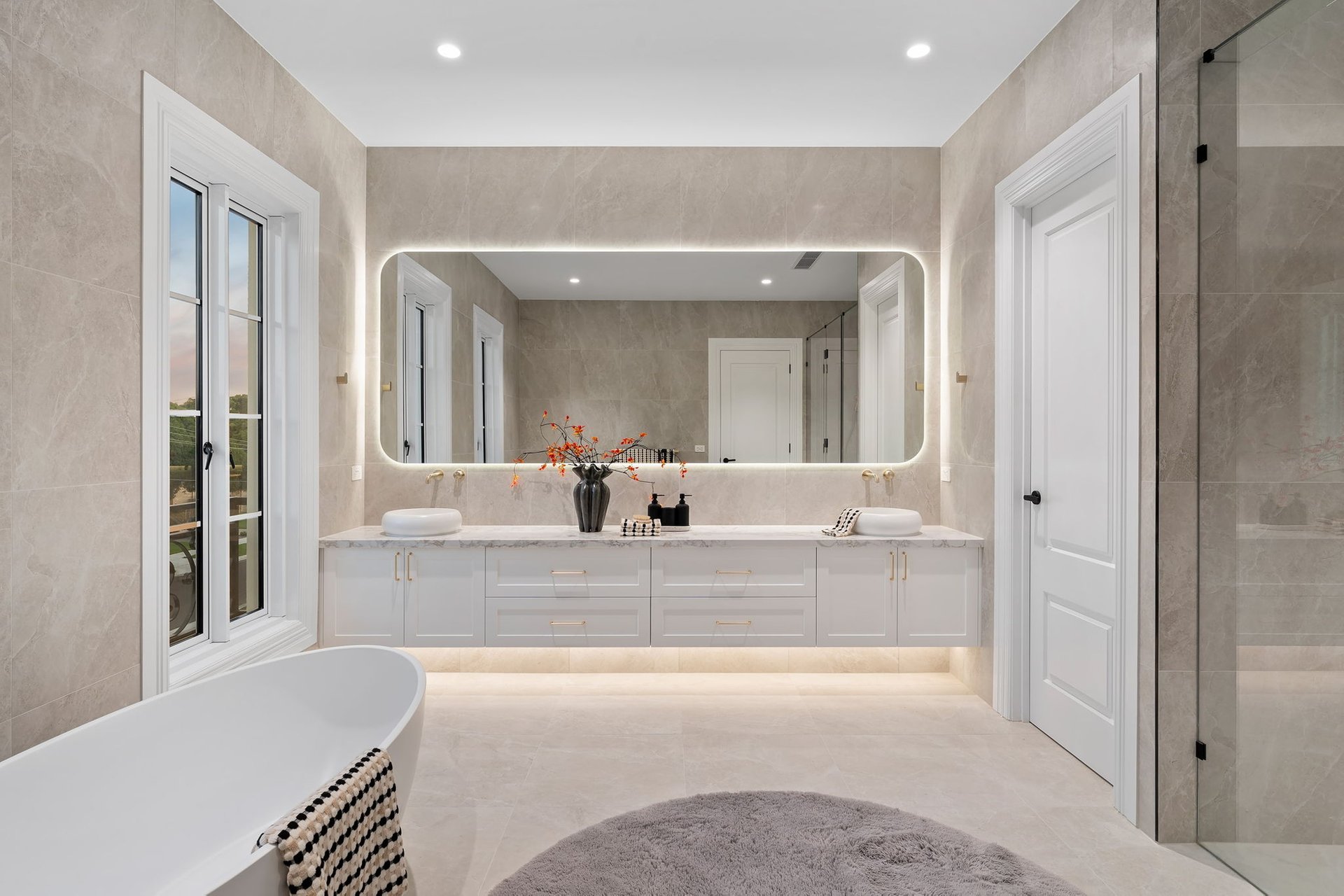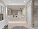 Deluxe accommodation comprises five king-sized master suites with fitted-out walk-in wardrobes and elegant fully tiled ensuites. One is located on the ground floor with its own private alfresco, while the primary suite upstairs is complemented by a retreat, a dressing room and an extravagant ensuite with a freestanding soaker tub.