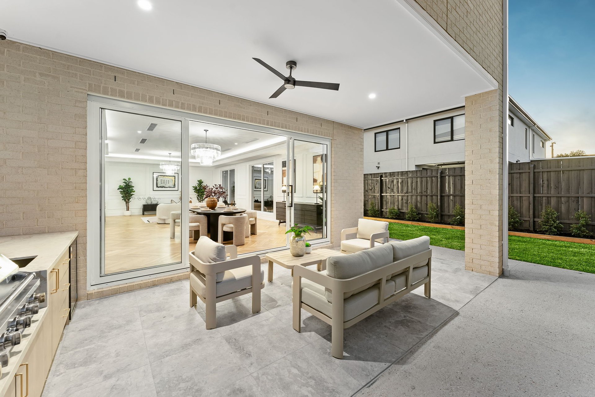 Refined living begins with a formal lounge to the right, where a slimline gas fireplace is framed by custom cabinetry. A sprawling open plan family and dining room is the heart of the home, crowned by a glamorous kitchen. The gourmet chef will be able to flex their culinary skills here, featuring premium Miele and SMEG appliances, including an integrated fridge and freezer, stone benches and splashbacks, a significant breakfast island and a butler’s pantry with an additional cooktop and rangehood. Sliding doors link this hub with a stunning backyard setting, where a covered alfresco with an outdoor kitchen, ceiling fan and lighting invites year-round entertaining.