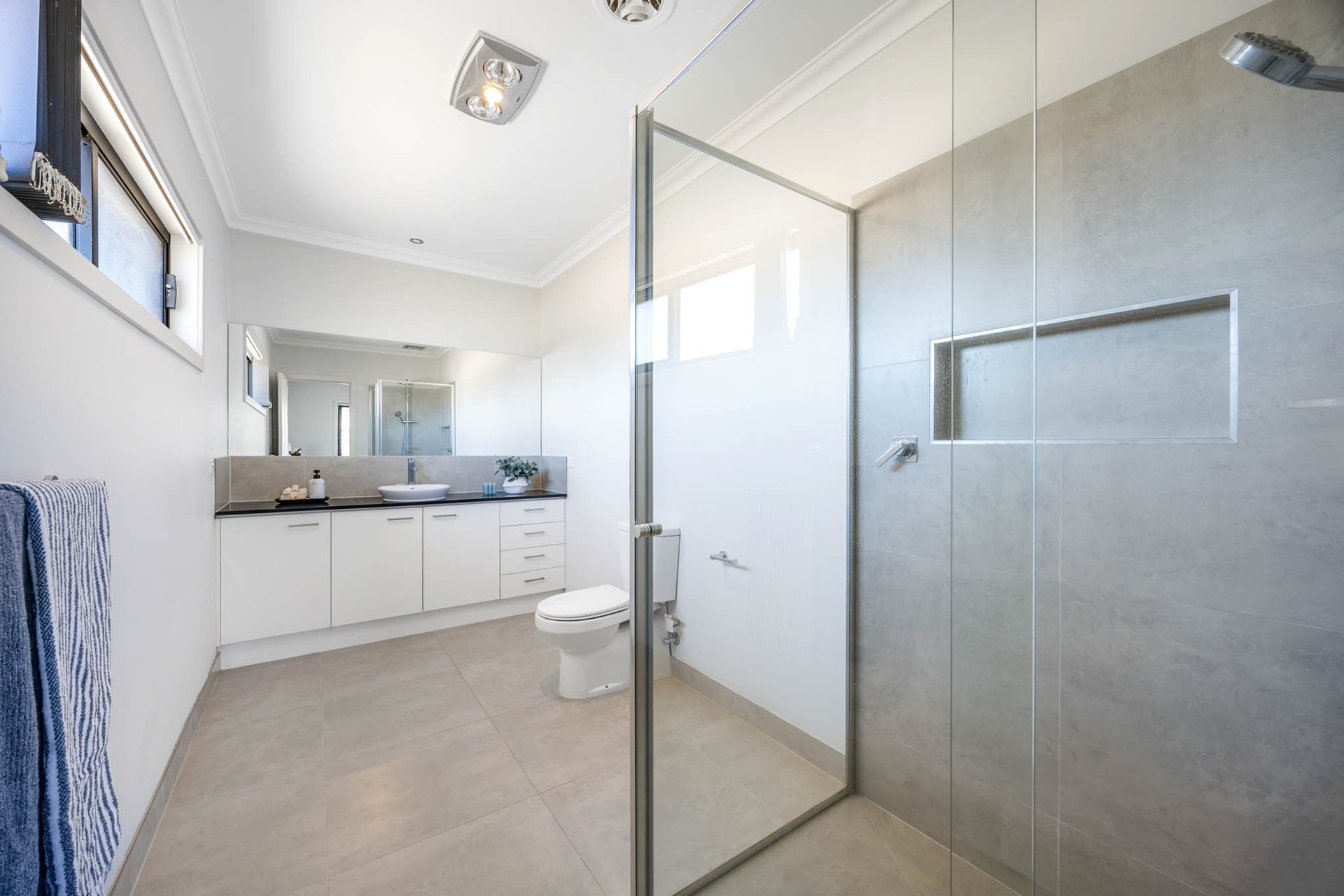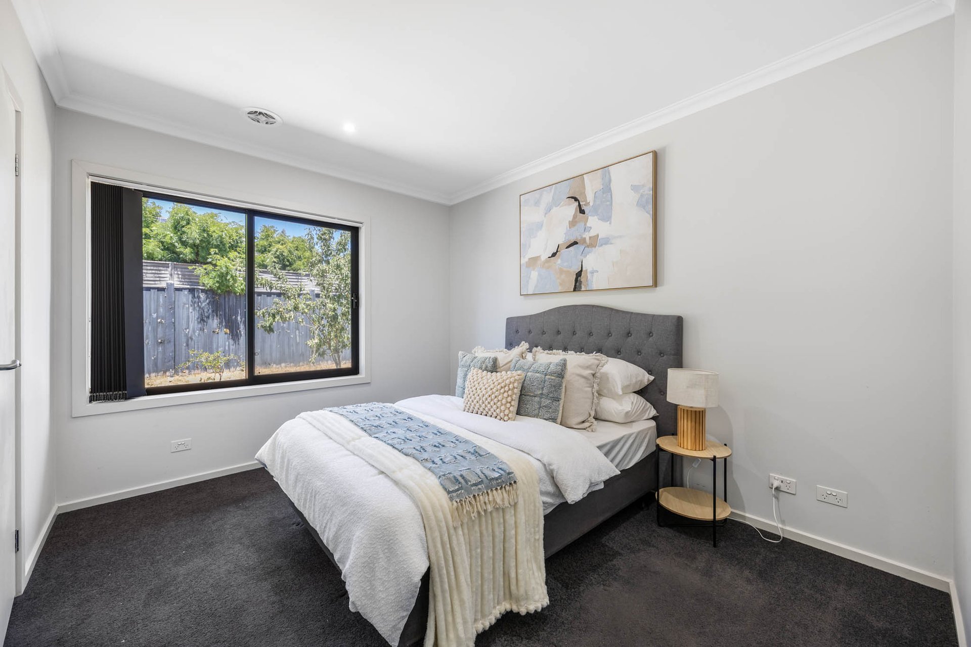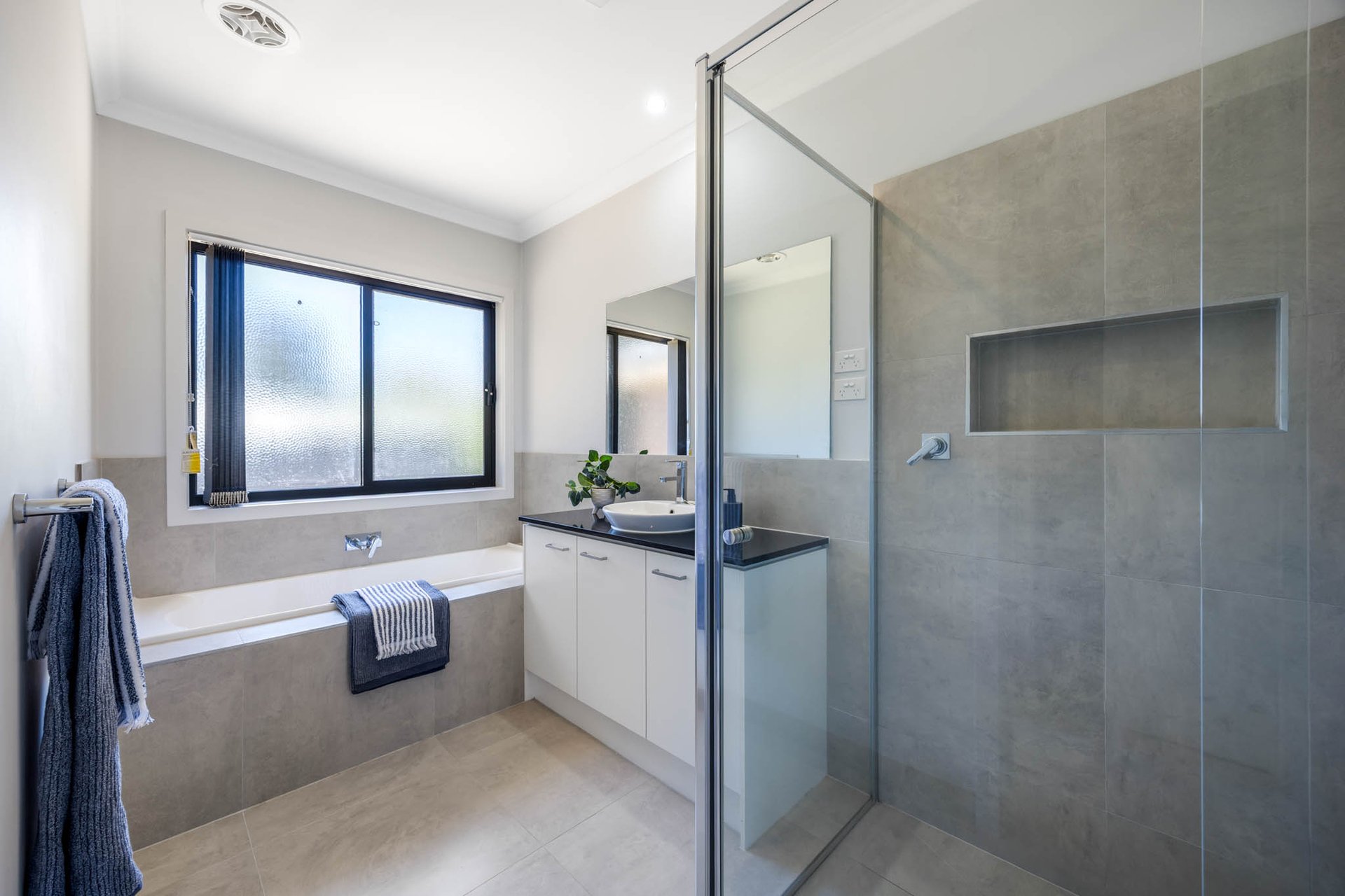 Accommodation comprises three generously proportioned bedrooms, each appointed with walk-in robes, alongside two beautifully finished bathrooms in soft neutral tones with stone-topped vanities. The main bathroom includes both shower and bath, while the privately positioned primary suite enjoys its own ensuite. Completing the home is the convenience of an integrated double garage.