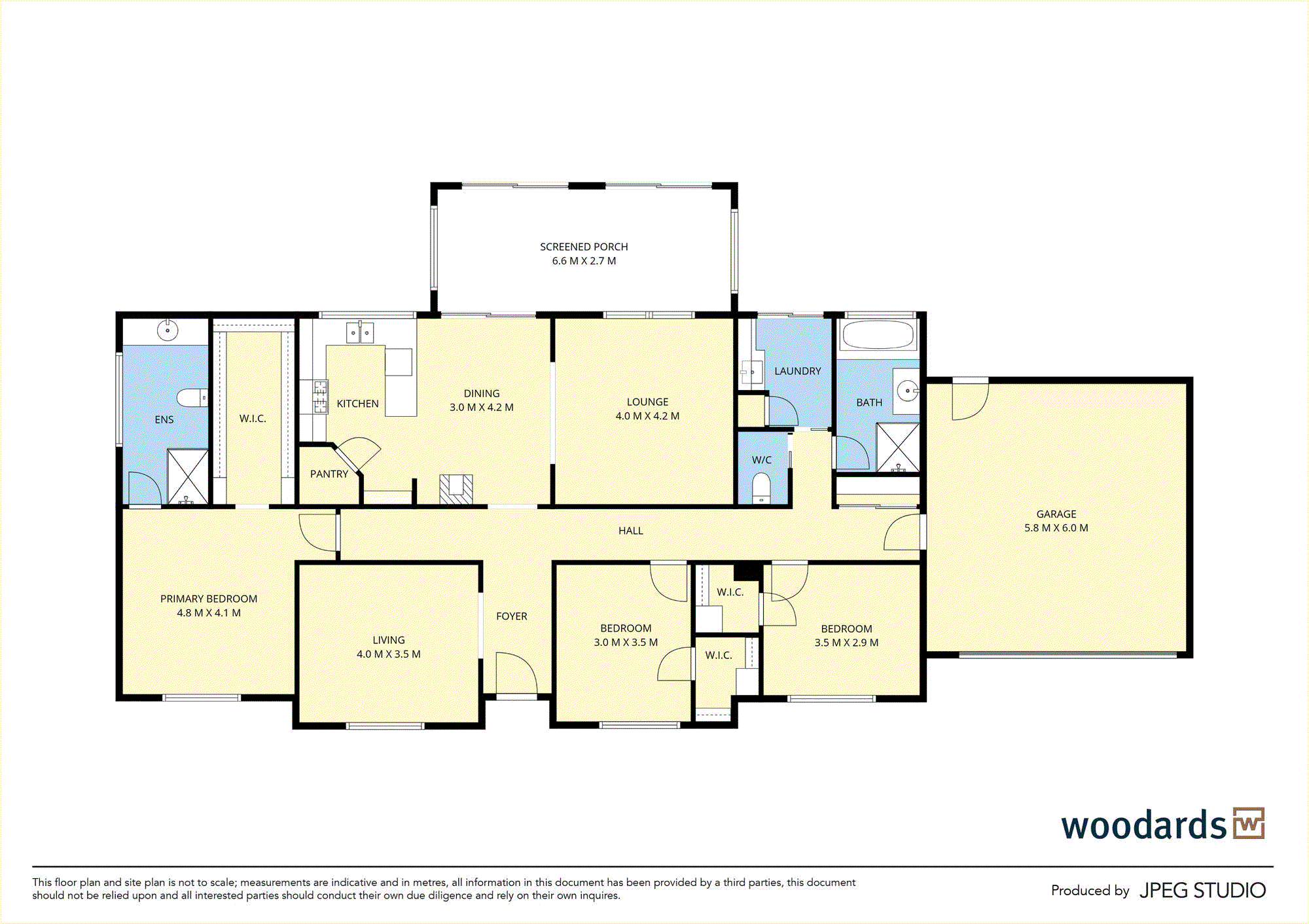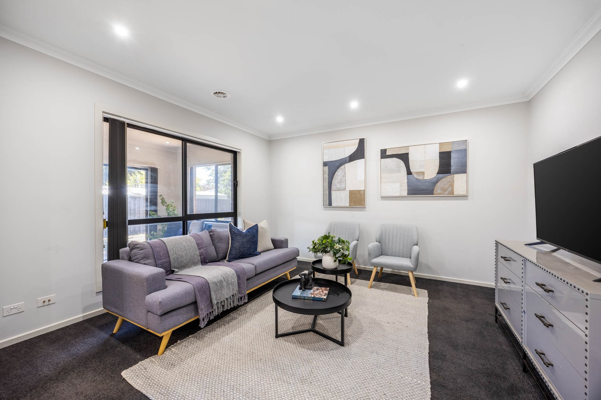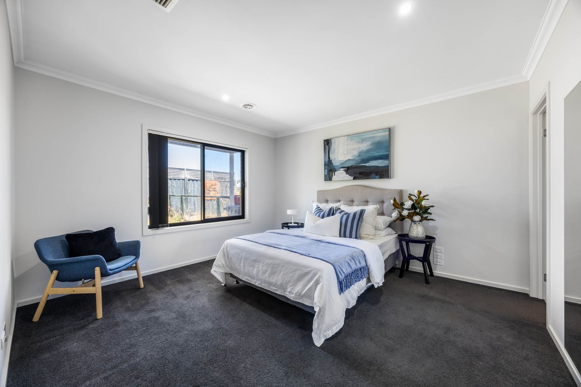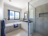 Accommodation comprises three generously proportioned bedrooms, each appointed with walk-in robes, alongside two beautifully finished bathrooms in soft neutral tones with stone-topped vanities. The main bathroom includes both shower and bath, while the privately positioned primary suite enjoys its own ensuite. Completing the home is the convenience of an integrated double garage.
