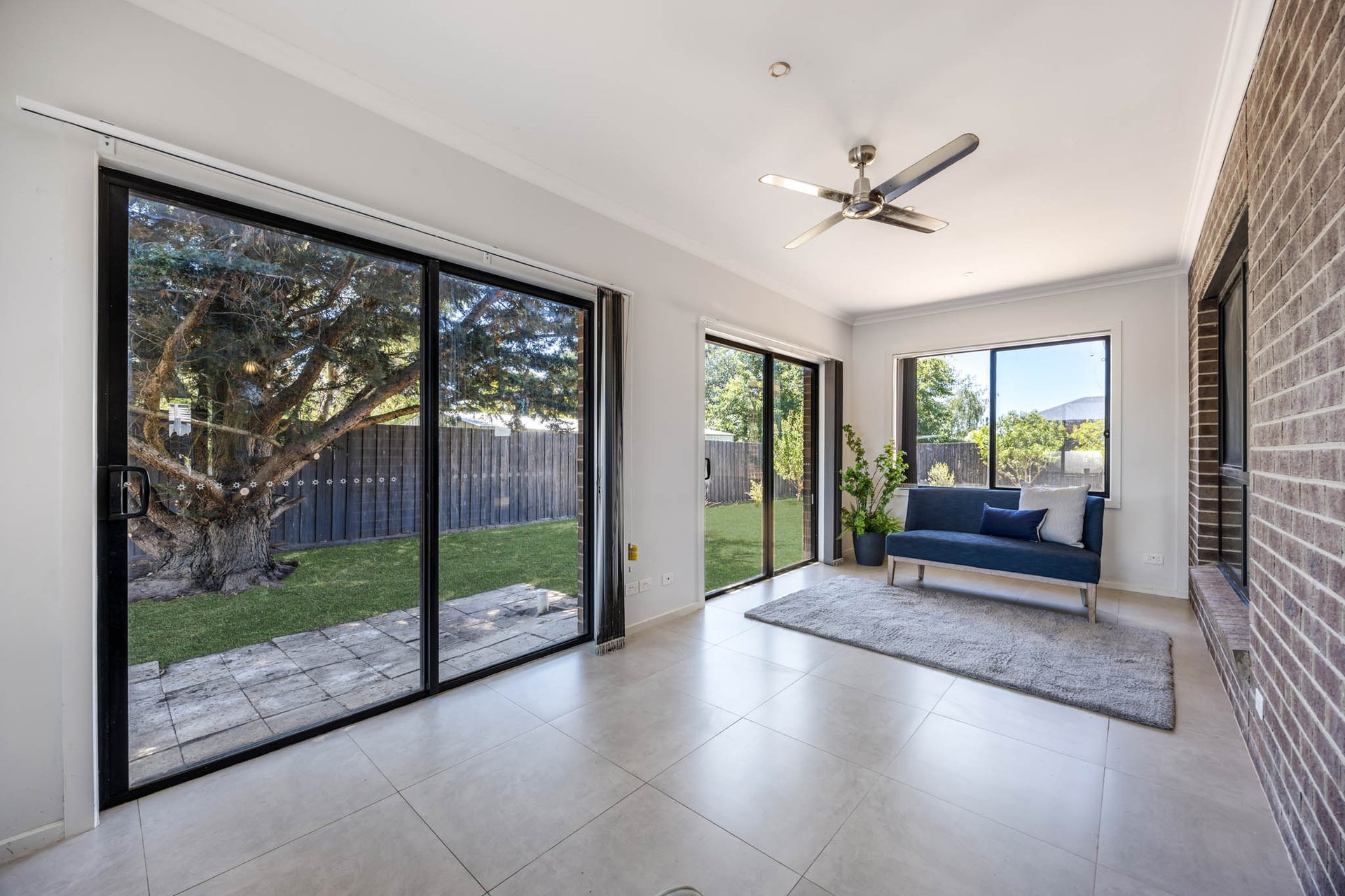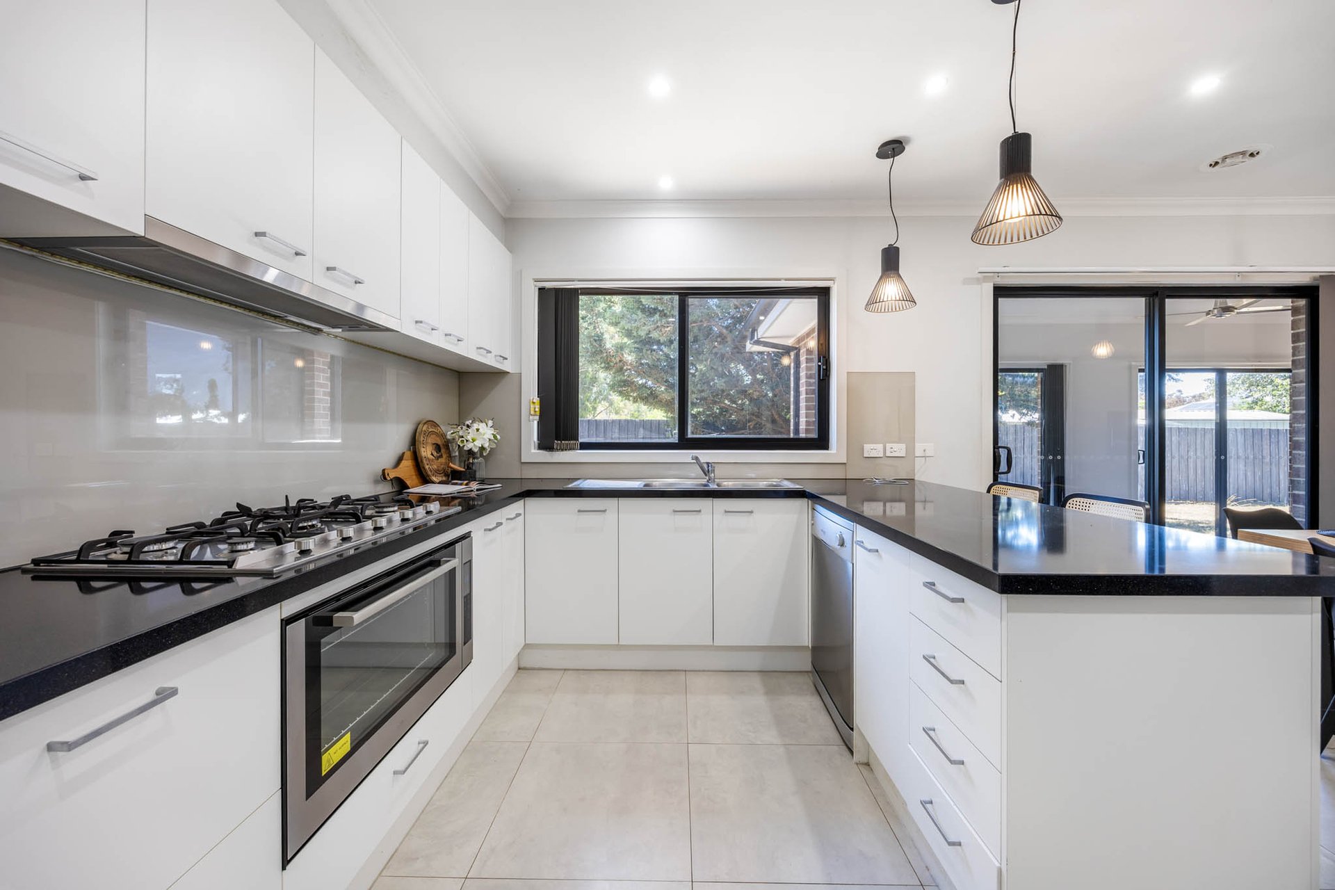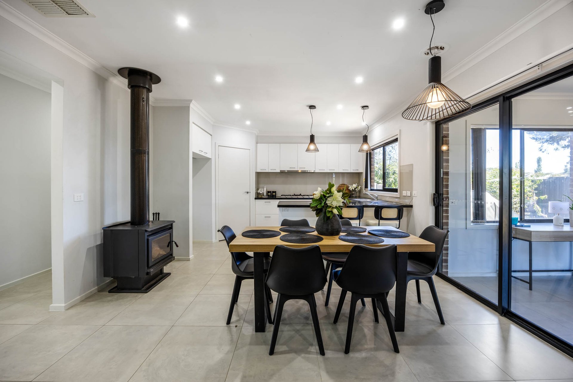 A welcoming foyer sets the tone for spacious interiors that unfold across distinct yet connected zones designed for everyday ease and effortless entertaining. Living domains are thoughtfully arranged with a frontage living area complemented by a sublime white kitchen at the heart of the home, showcasing deep inky stone benchtops, bar seating, glass splashback, oven, gas cooktop and dishwasher. Adjoining open-plan dining is warmed by a charming wood-fuelled heater, while a separate lounge offers a calming retreat. To the rear, a light-bathed screened porch draws the eye to the garden outlook, inviting relaxed enjoyment in every season.