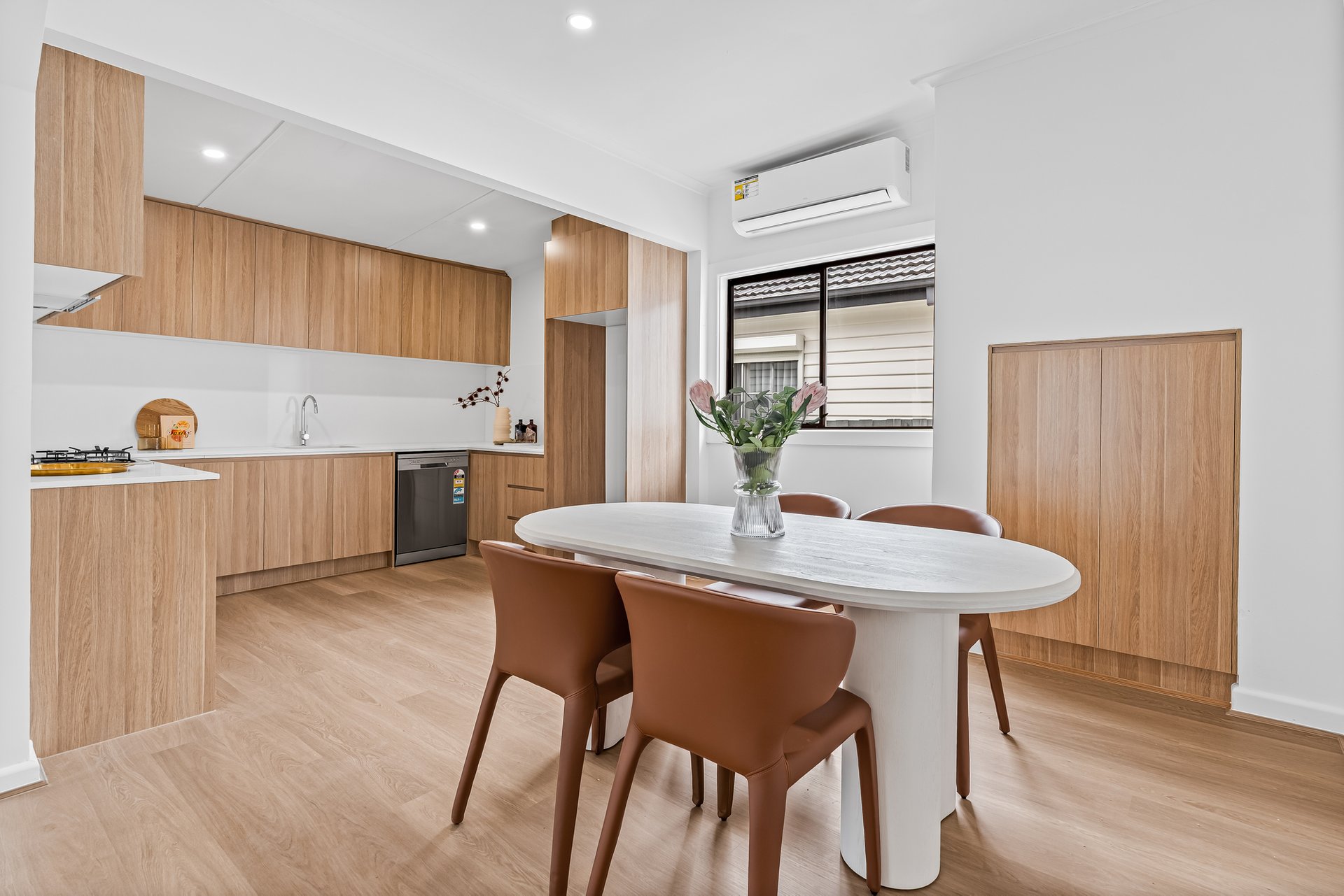 Inside, large windows fill every room with natural light, while floating floorboards and modern furnishings create a fresh, contemporary feel. The spacious living room, complete with air conditioning, provides a comfortable retreat ideal for relaxing or entertaining. The open-plan kitchen and dining area is fitted with a dishwasher and sleek finishes, flowing seamlessly through to the outdoor entertaining space.
