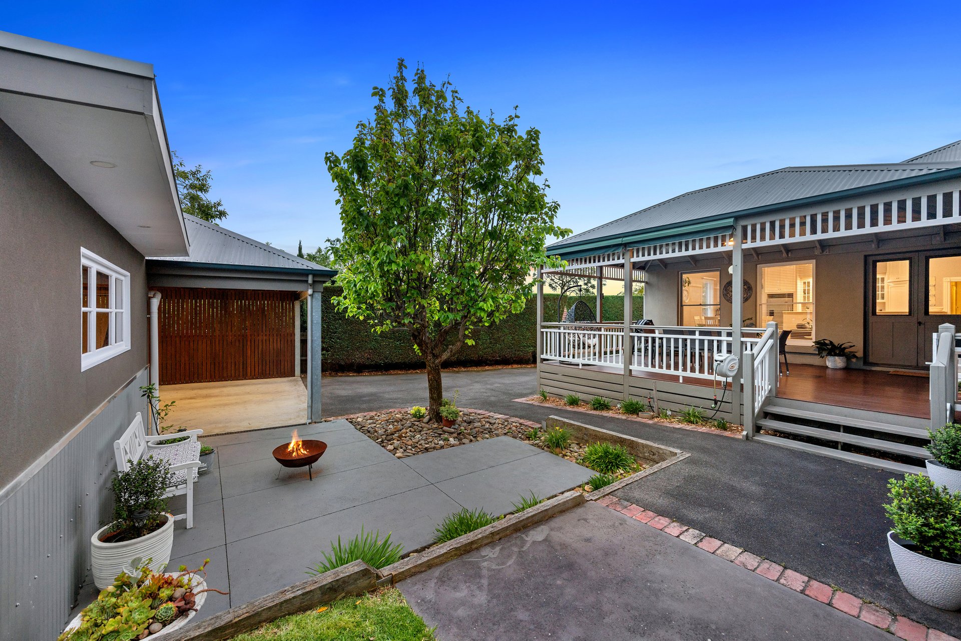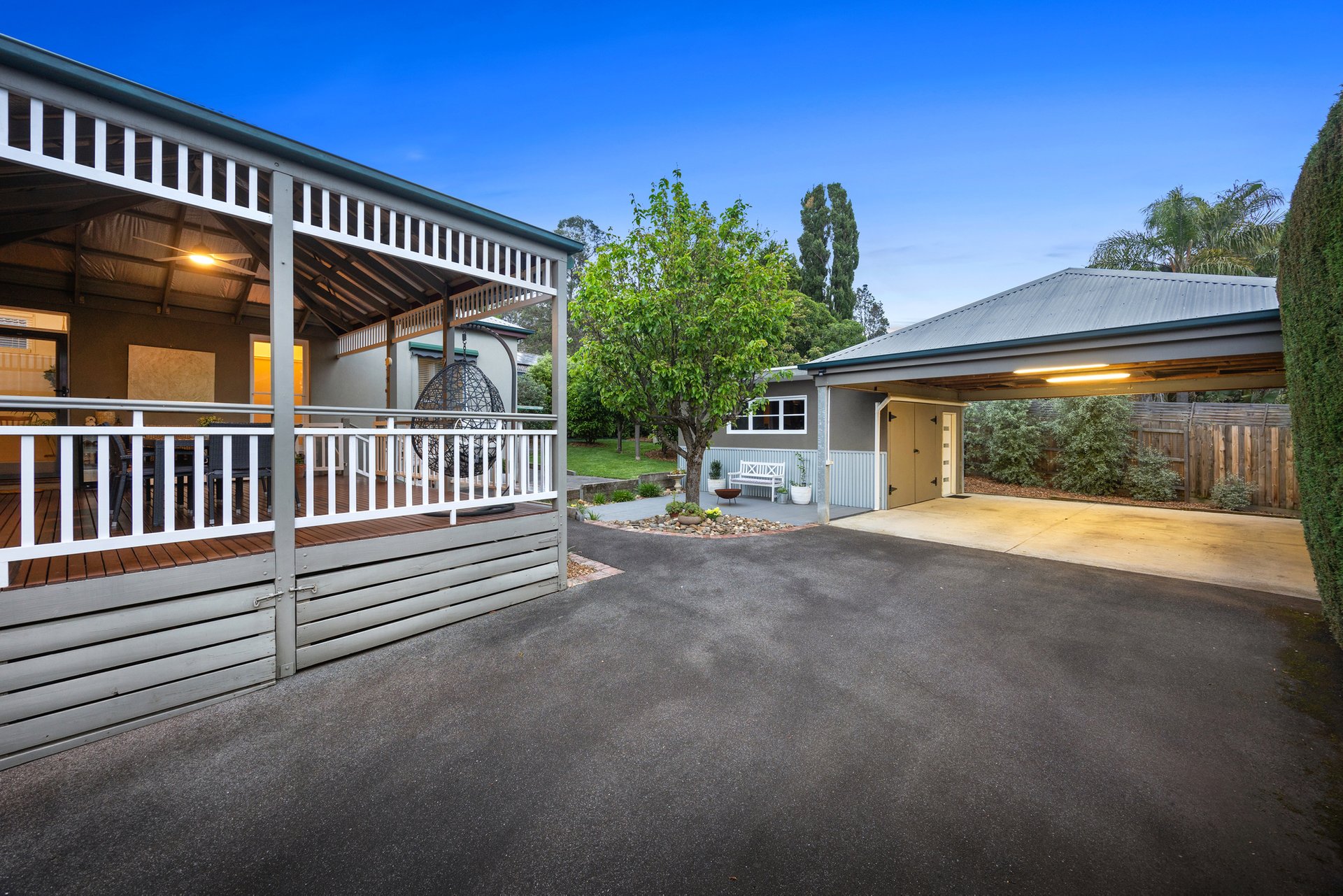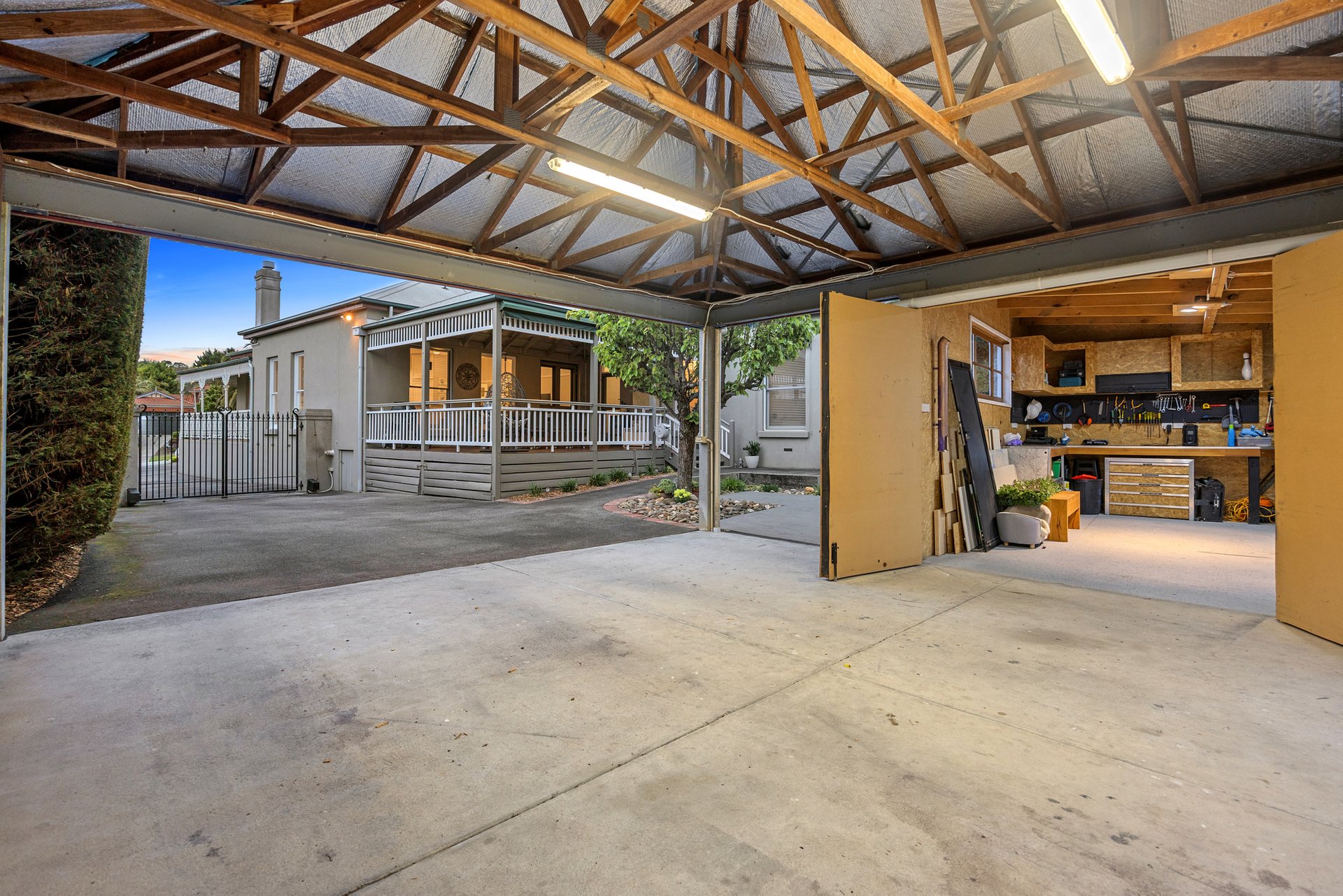 Inside, rooms painted in neutral tones complement the home’s authentic detailing, from tall ceilings, deep cornices and arched hallways, to polished floorboards, profiled skirting boards and picture rails that evoke true period character. Formal and casual living zones offer space and versatility, including a refined lounge room with a gas fireplace, and a family/dining area that is crowned by a beautifully appointed kitchen and opens via French doors to a spacious covered entertaining deck. The supremely private backyard is in full view from here, complete with a firepit and a flexible workshop/hobby room next to a double carport.