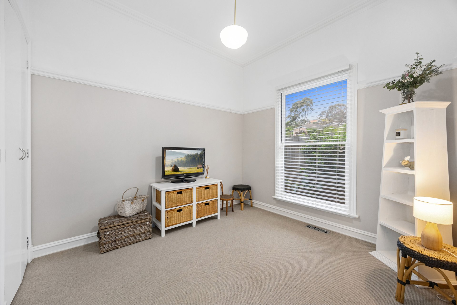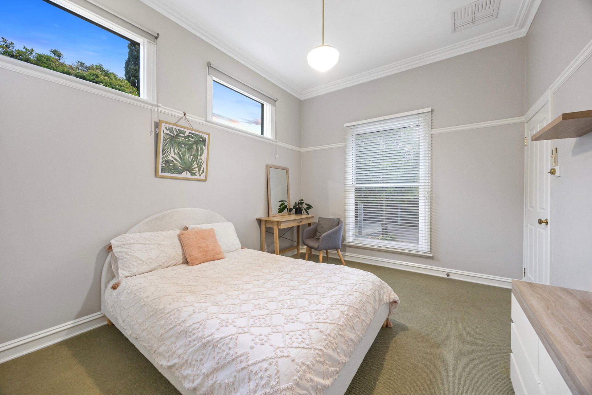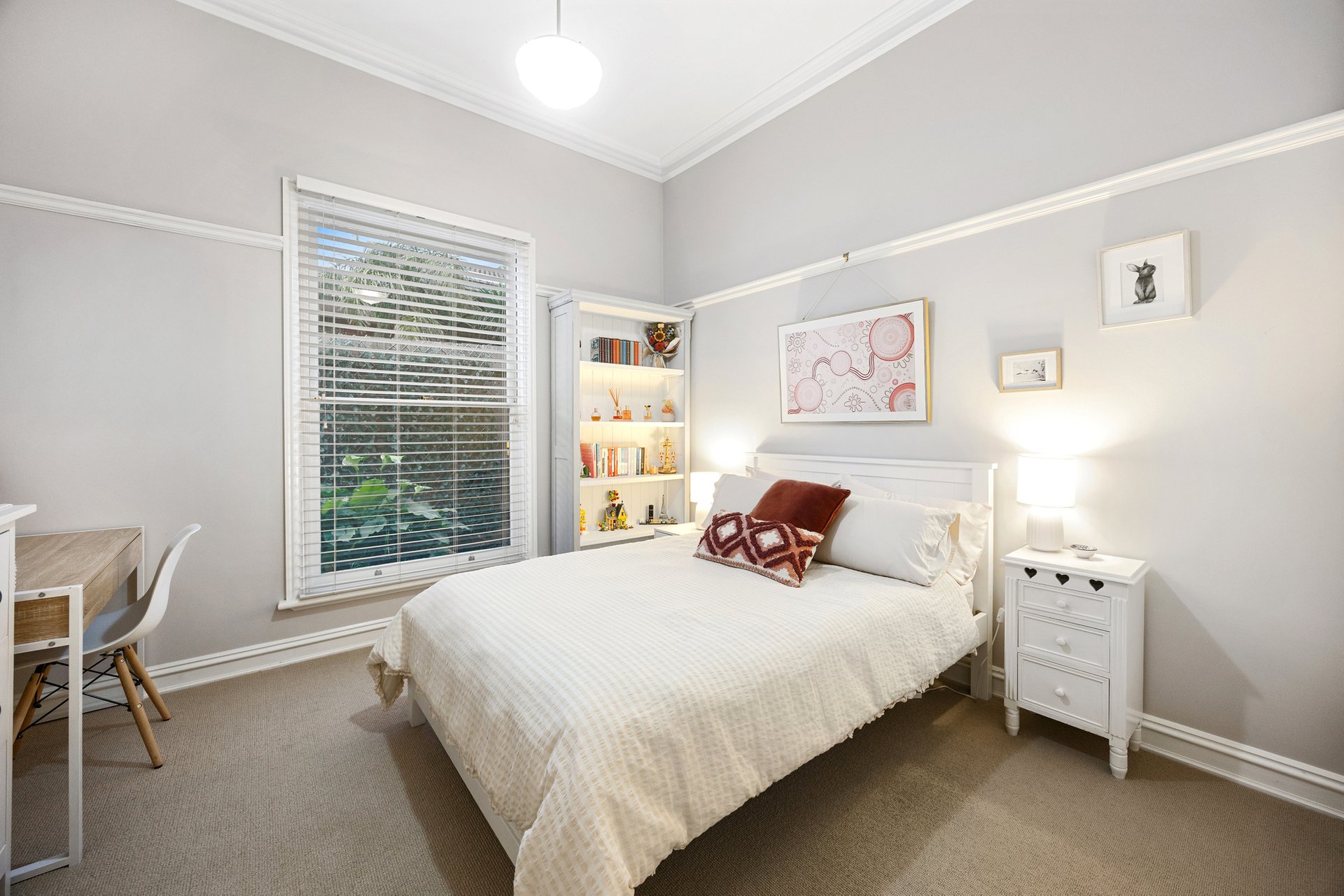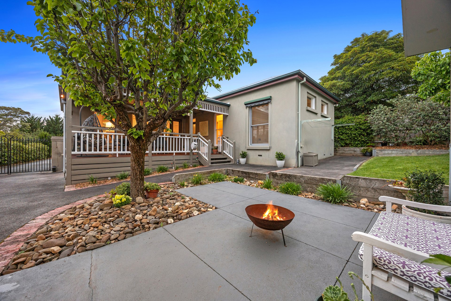 Inside, rooms painted in neutral tones complement the home’s authentic detailing, from tall ceilings, deep cornices and arched hallways, to polished floorboards, profiled skirting boards and picture rails that evoke true period character. Formal and casual living zones offer space and versatility, including a refined lounge room with a gas fireplace, and a family/dining area that is crowned by a beautifully appointed kitchen and opens via French doors to a spacious covered entertaining deck. The supremely private backyard is in full view from here, complete with a firepit and a flexible workshop/hobby room next to a double carport.