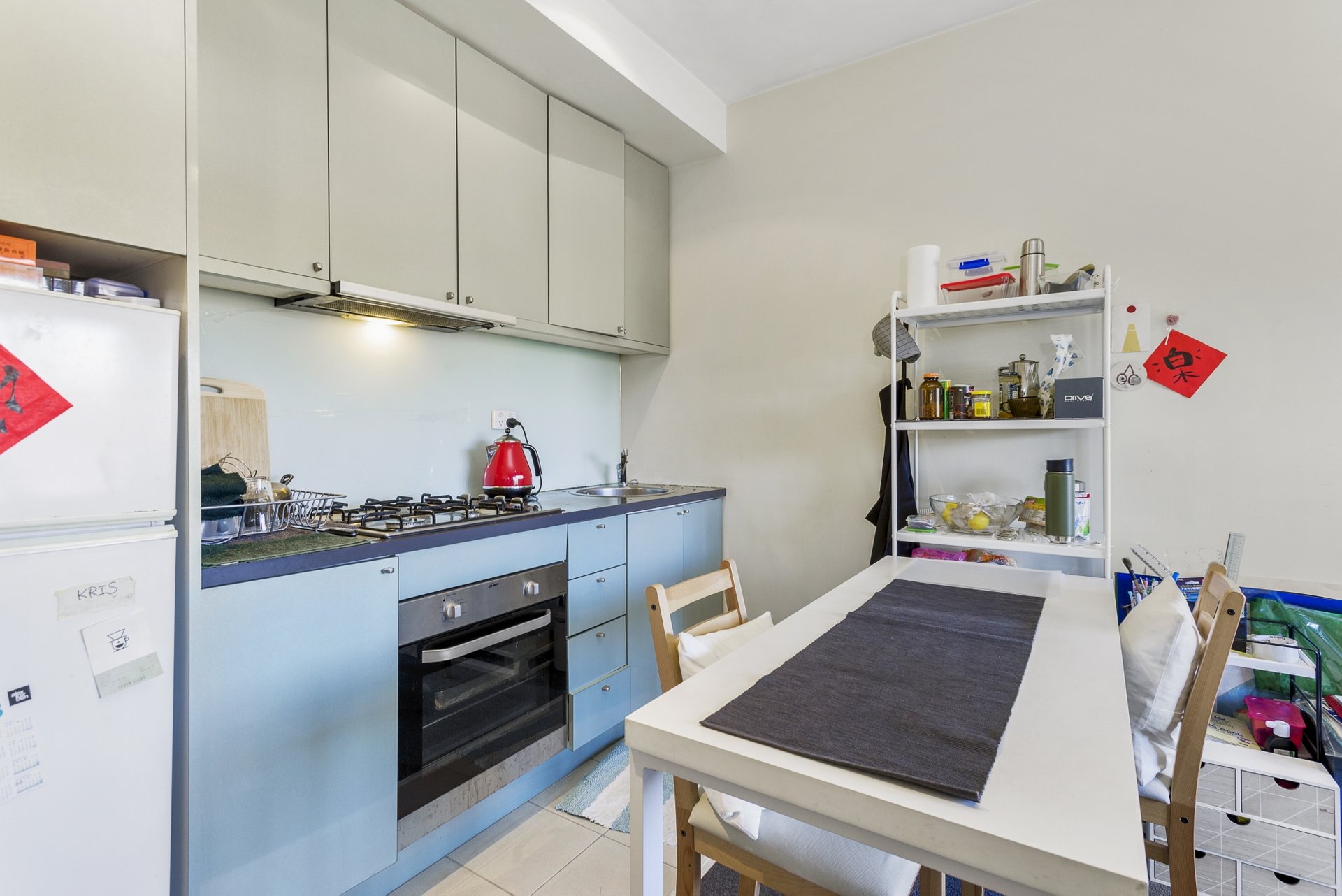 Kitchen with stainless steel appliances with gas stove top and electric oven. Light filled lounge room, with Juliet balcony.