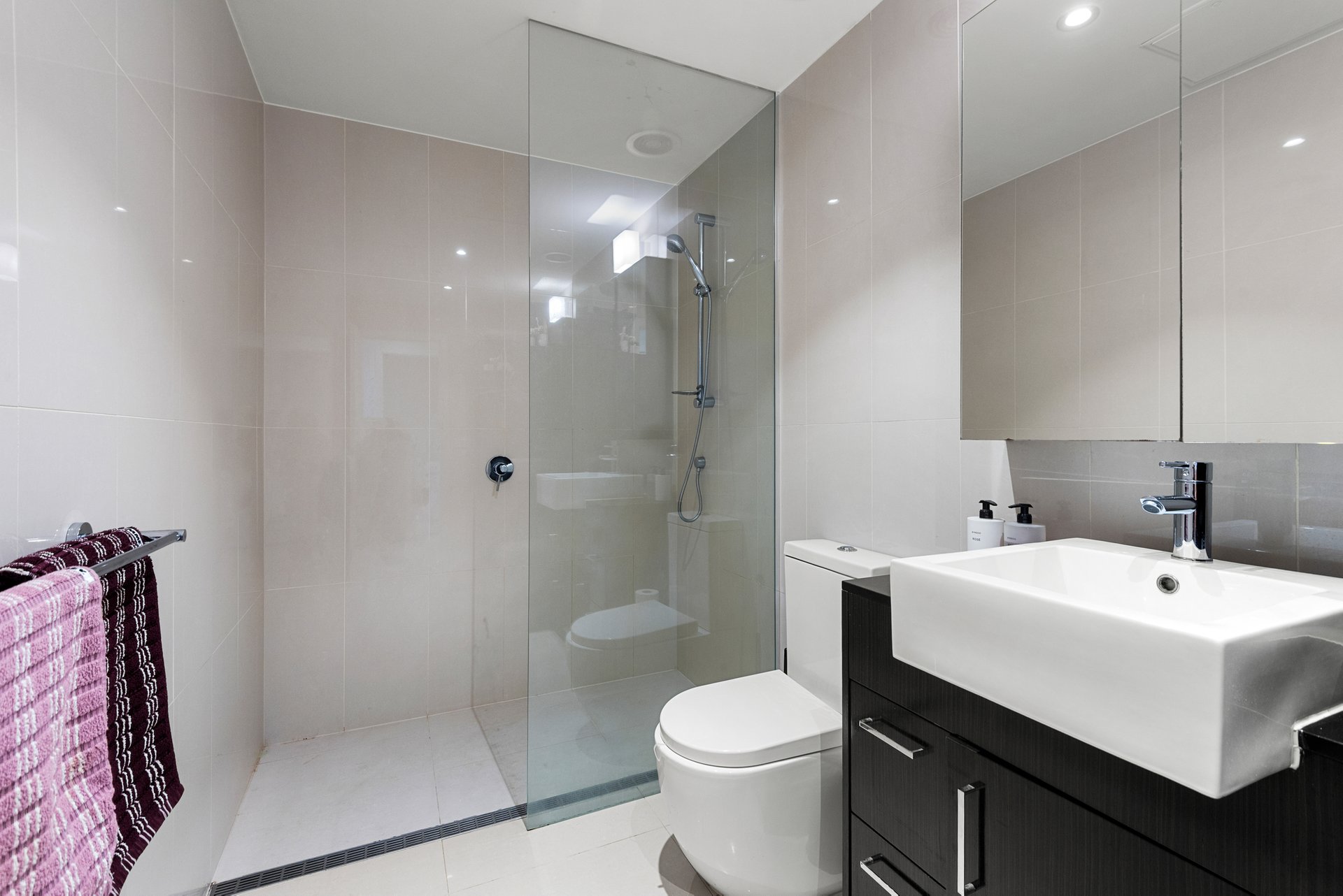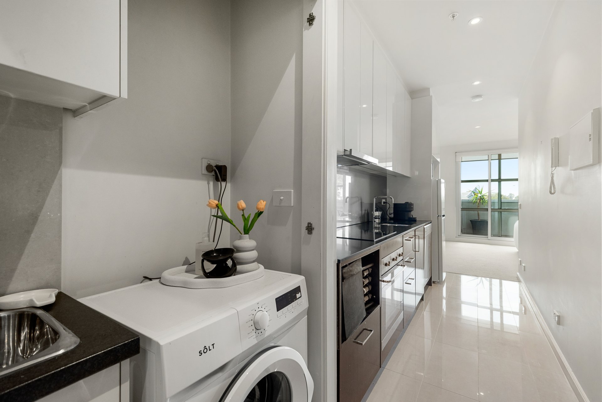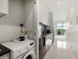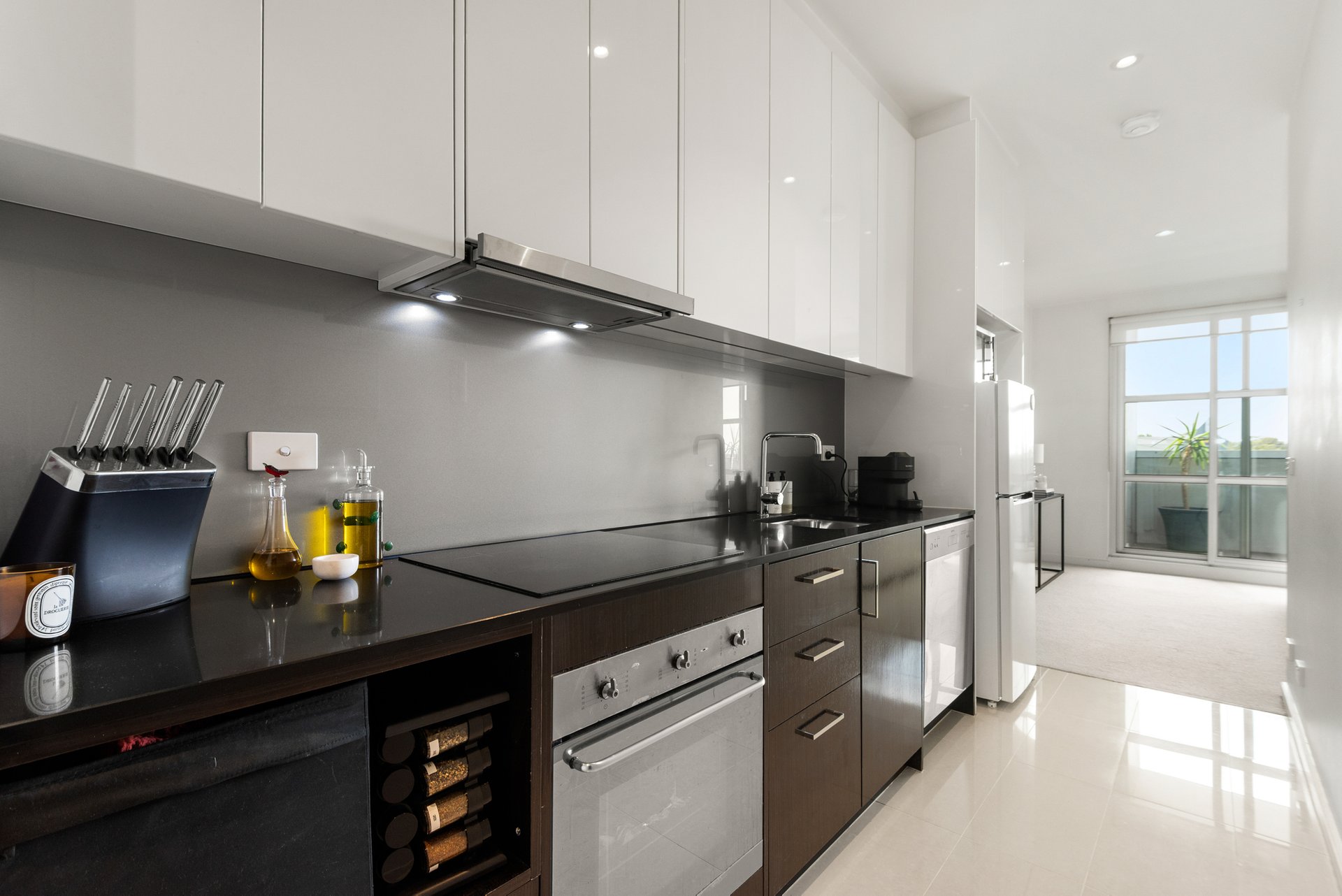 The well-appointed galley kitchen showcases a Smeg electric cooktop, rangehood and under bench oven complemented by a dishwasher, glass splashback and stone benchtop, and plenty of cupboards and drawers for storage. The fully tiled bathroom has a walk-in shower and storage in the vanity and mirror.
