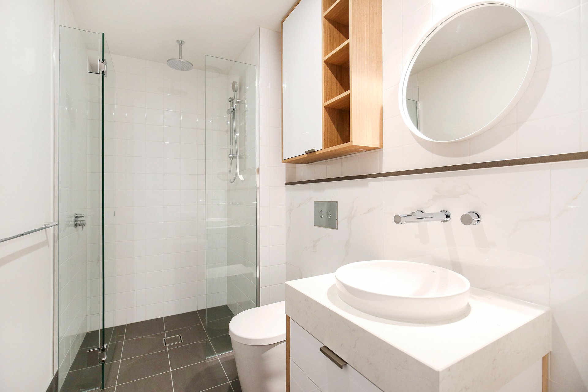 Bedroom that includes carpeted flooring, mirrored built in robe and study desk. A modern central bathroom is complete with elegant neutral-tone finishes and large shower.