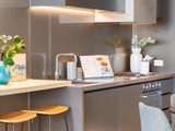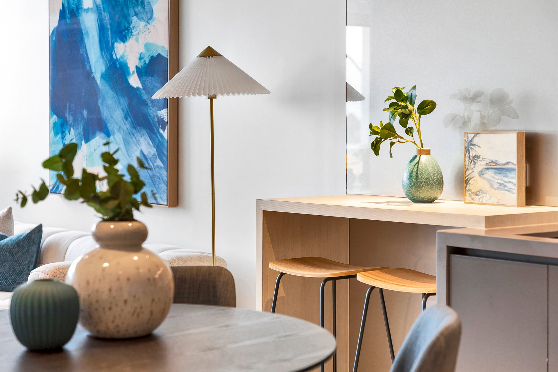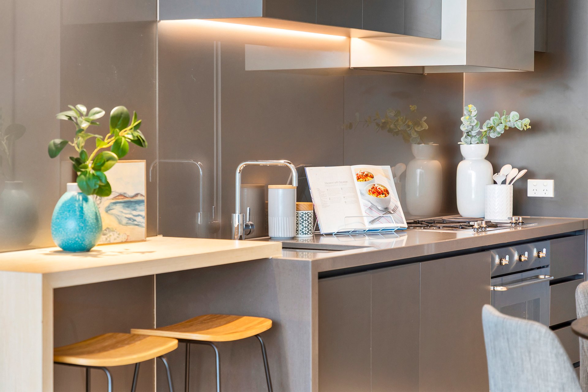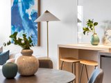 At the centre of the home, a designer kitchen showcases premium Smeg appliances, including an integrated dishwasher, and flows seamlessly into the open-plan living and dining area. This inviting space extends out to a balcony overlooking Atherton Road, providing the perfect setting for relaxation or entertaining.