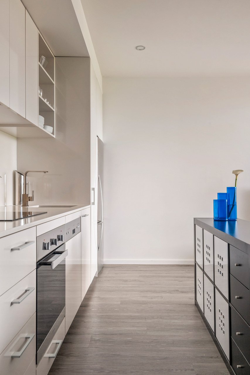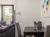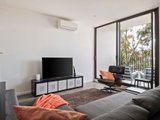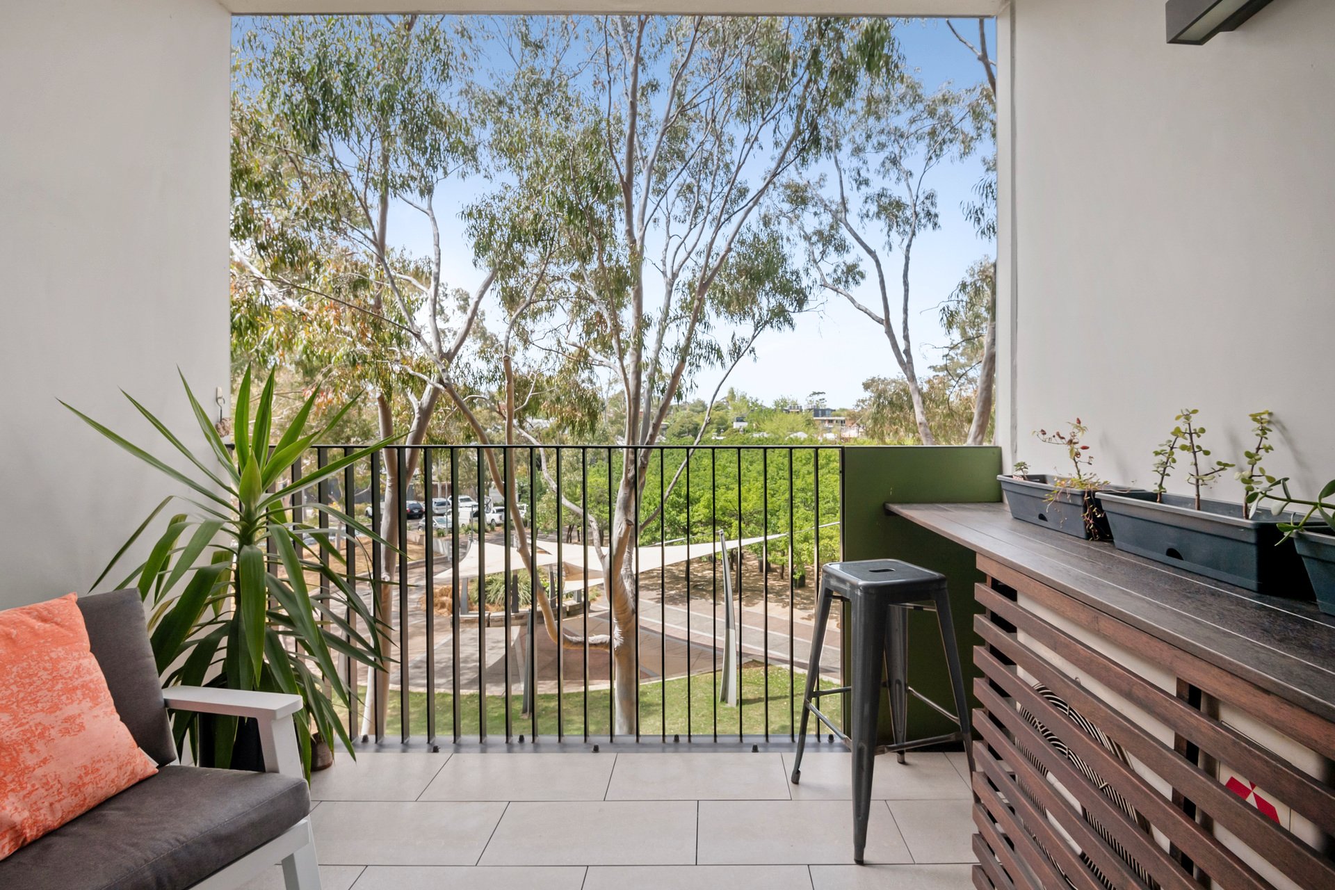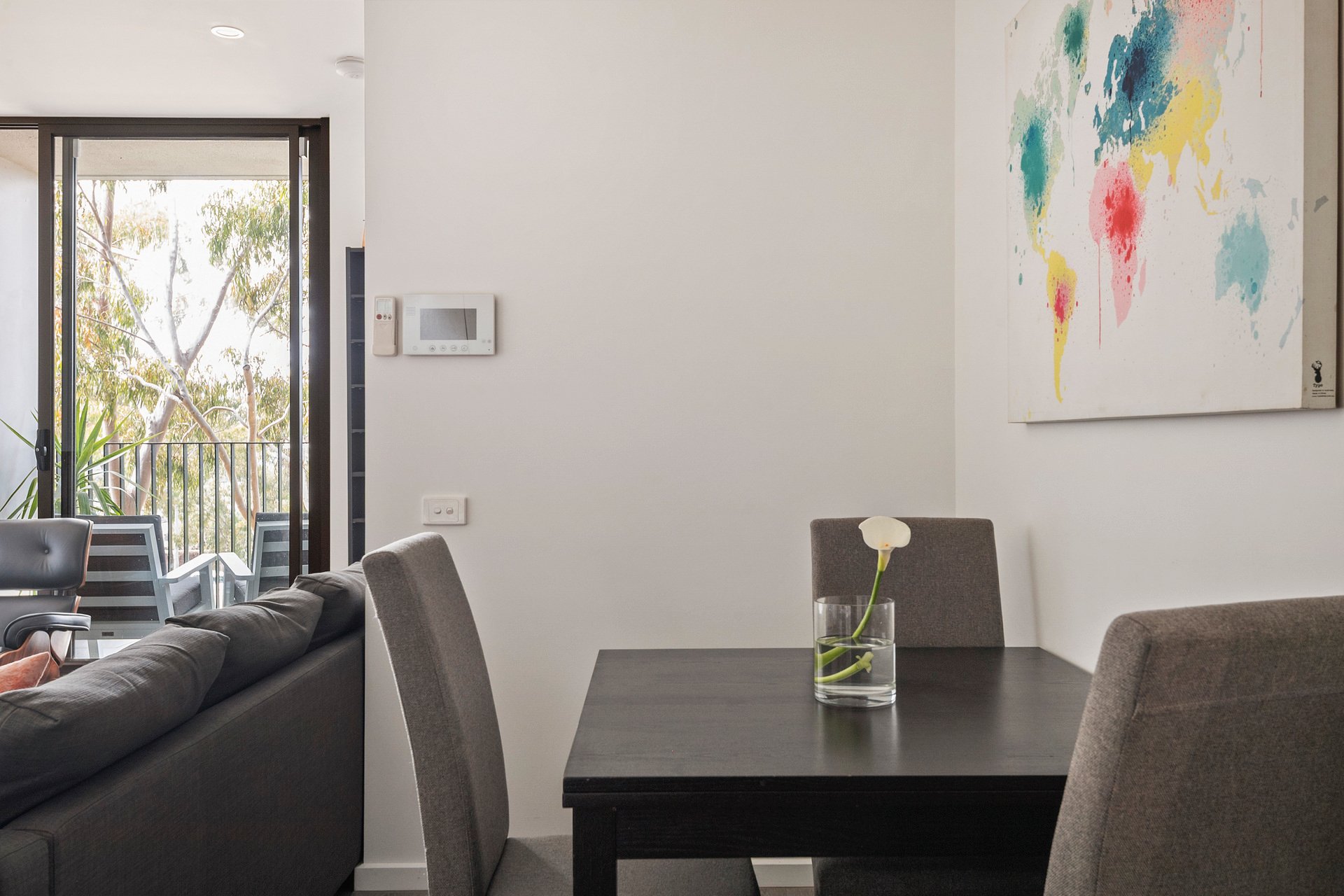 Bathed in natural light, the east-facing living area opens to a private balcony with a calming, green outlook. Floorboards run throughout the apartment, enhancing the sense of space and flow, while the well-appointed kitchen features a four-burner electric cooktop, dishwasher and ample storage, seamlessly connecting to the dining and living zones for easy everyday living.