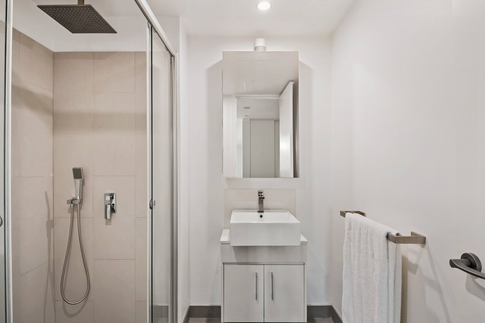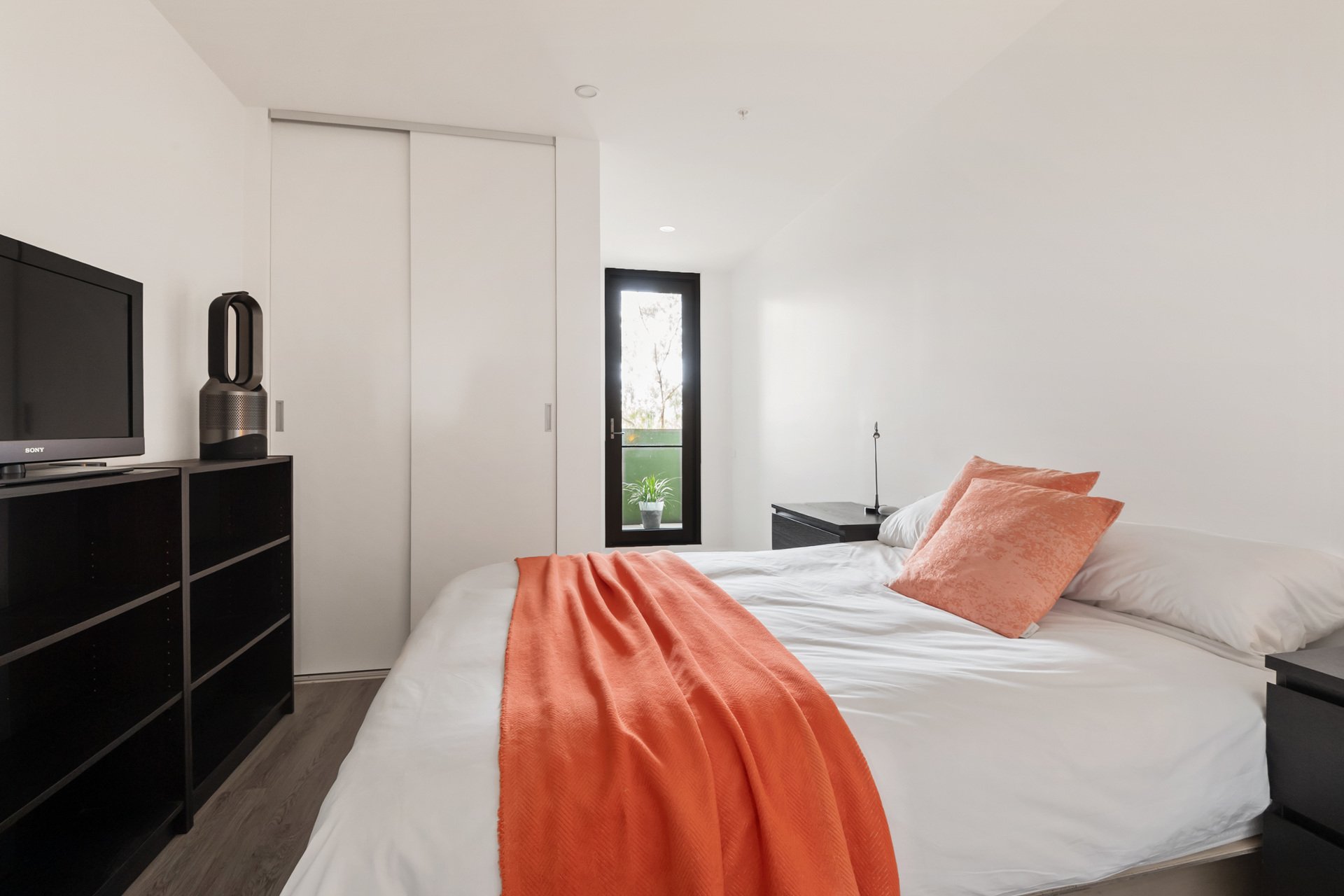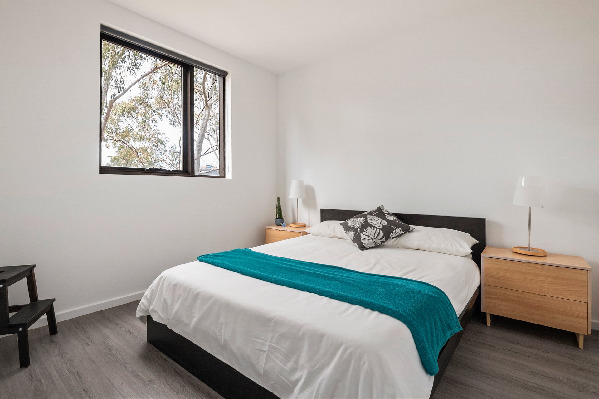 Bathed in natural light, the east-facing living area opens to a private balcony with a calming, green outlook. Floorboards run throughout the apartment, enhancing the sense of space and flow, while the well-appointed kitchen features a four-burner electric cooktop, dishwasher and ample storage, seamlessly connecting to the dining and living zones for easy everyday living.