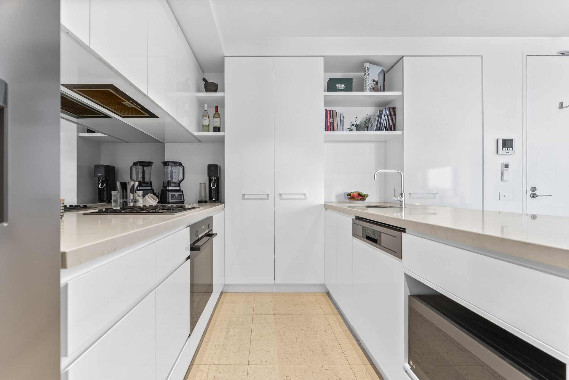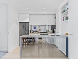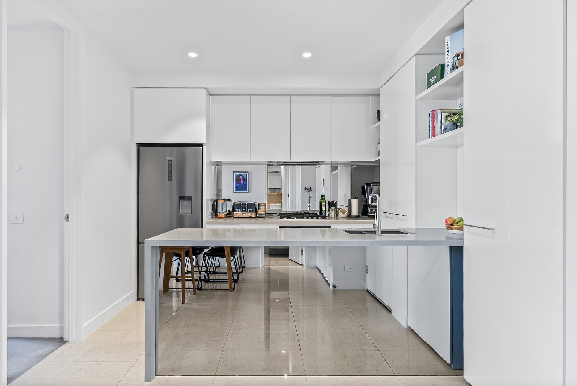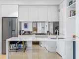 The open-plan living and dining area is flooded with natural light, creating a bright and inviting space that connects seamlessly to the modern kitchen. Featuring a stone waterfall bench top, glass finish, AEG gas stove, and Bosch oven, the kitchen is both functional and stylish. A glass splashback completes the sleek design, making it a perfect place to entertain guests.