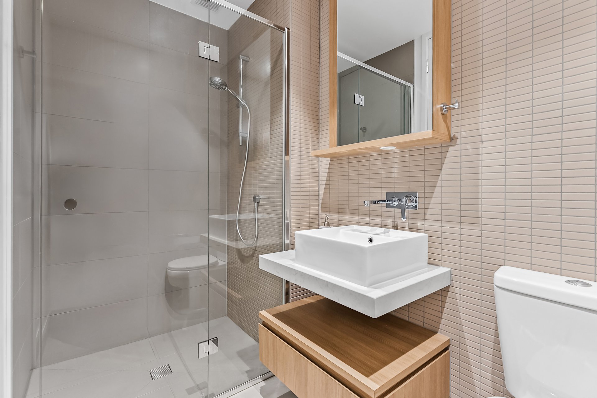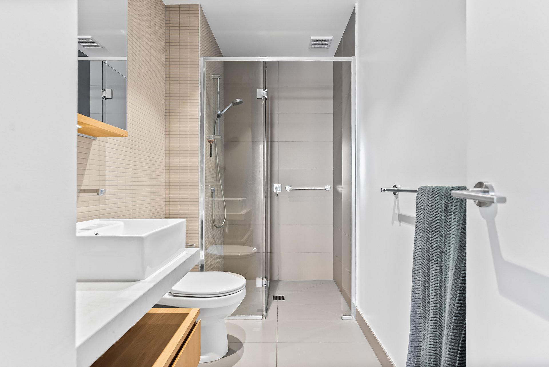 Both bedrooms are generously sized, each offering city views, with the master bedroom featuring a large built-in robe and ensuite. The bathrooms boast modern finishes, waterfall showers, and large mirrors, adding a touch of luxury to your daily routine.