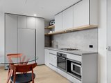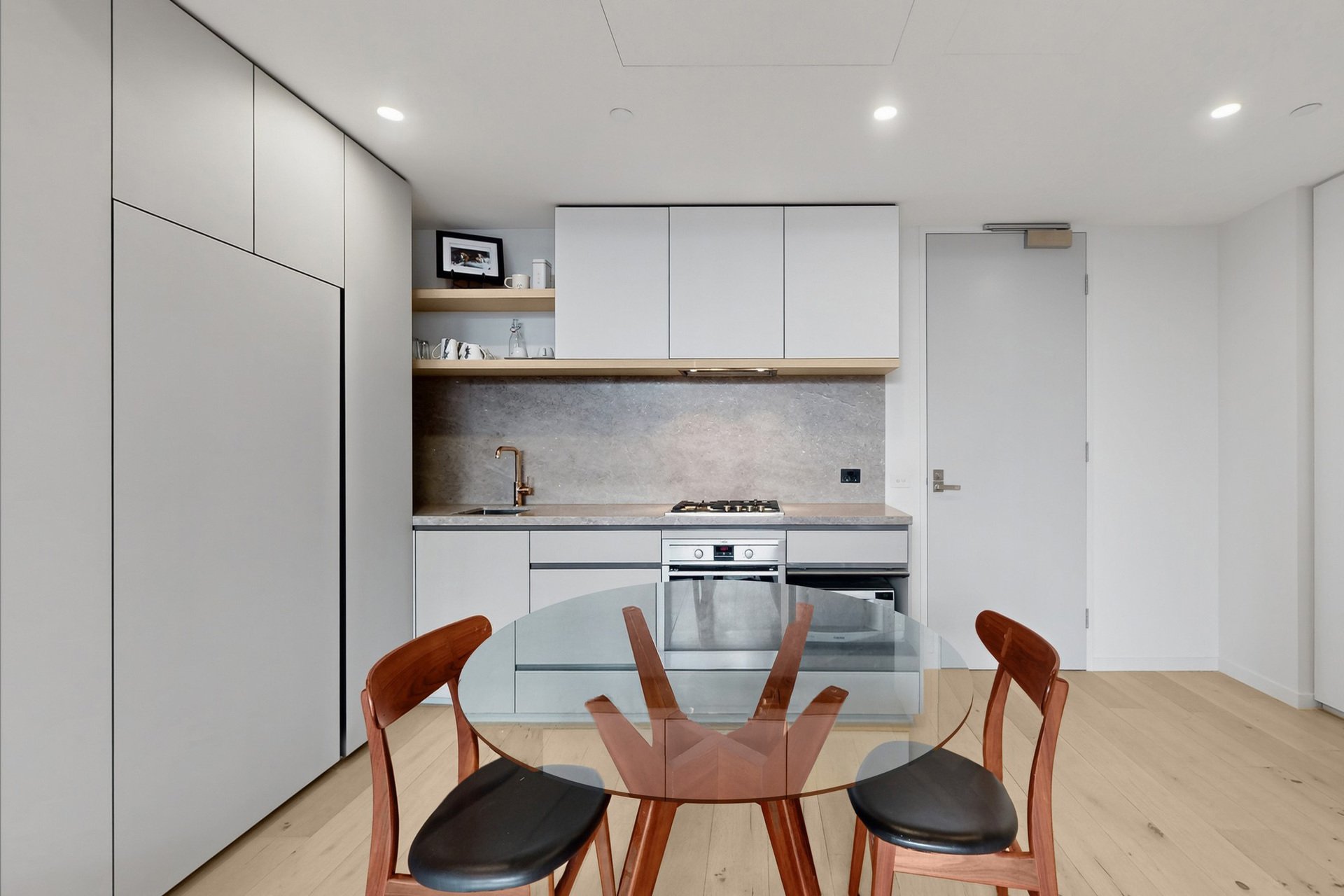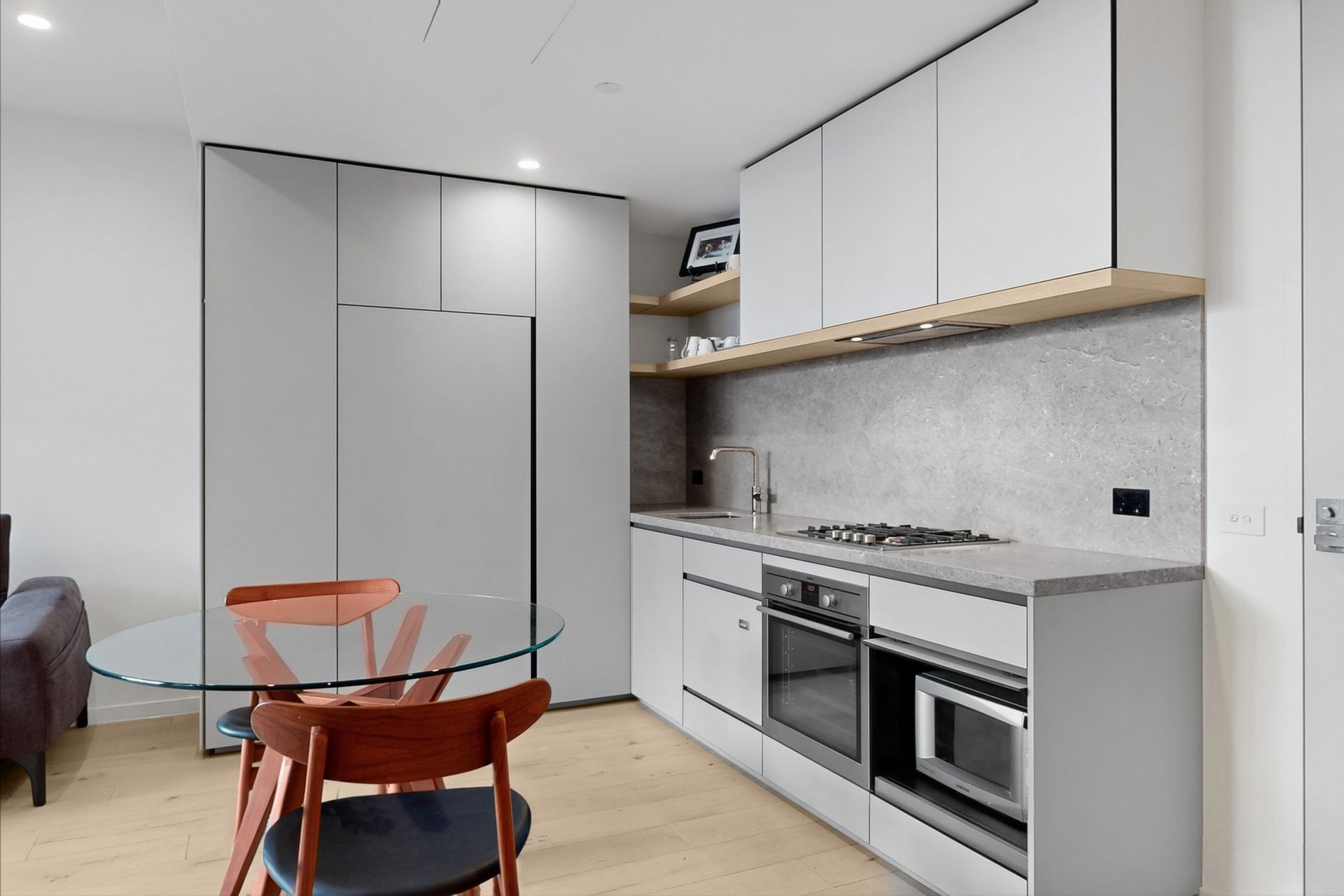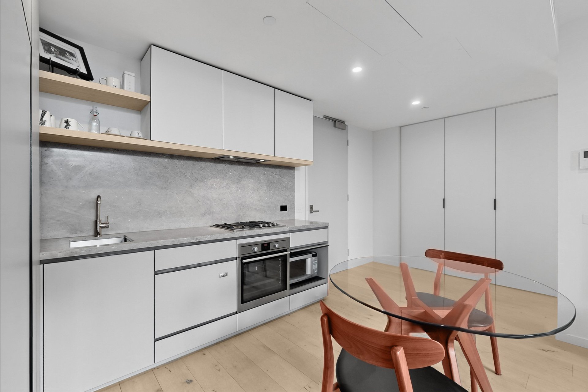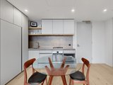 The open-plan living and dining area features timber flooring and flows seamlessly onto a generous private balcony-perfect for relaxing or entertaining. The sleek kitchen is fitted with stone benchtops, gas cooking, integrated appliances and ample cabinetry, combining both style and practicality.